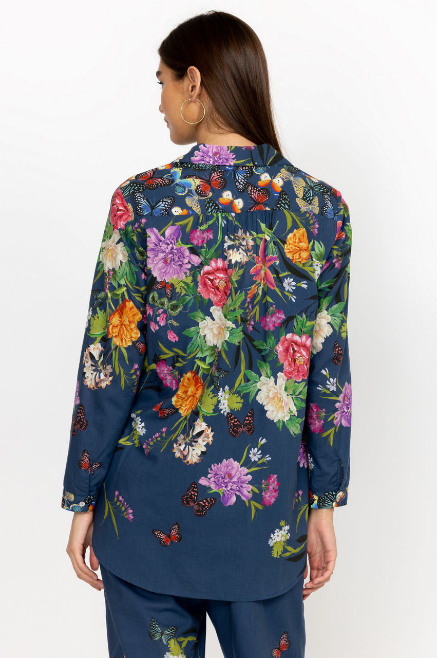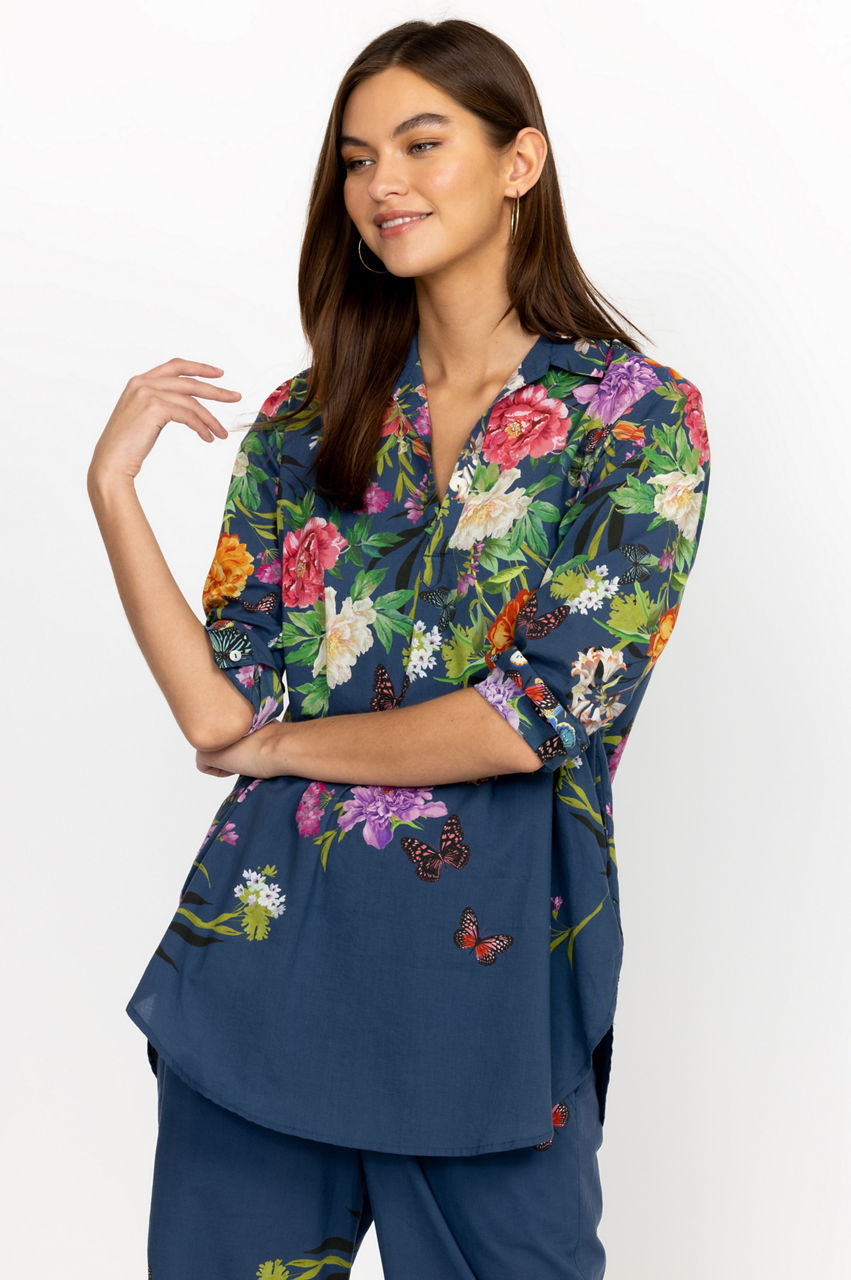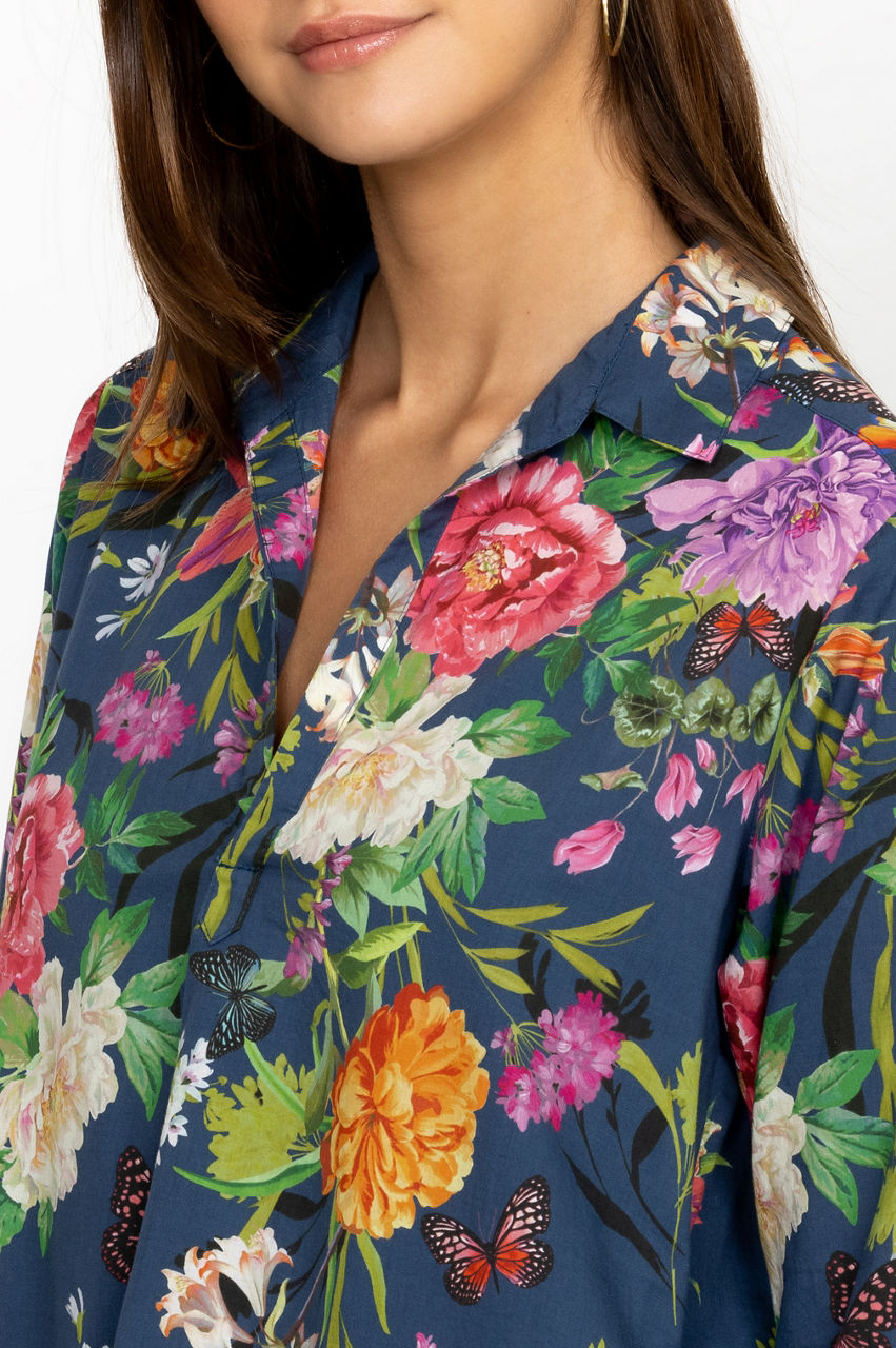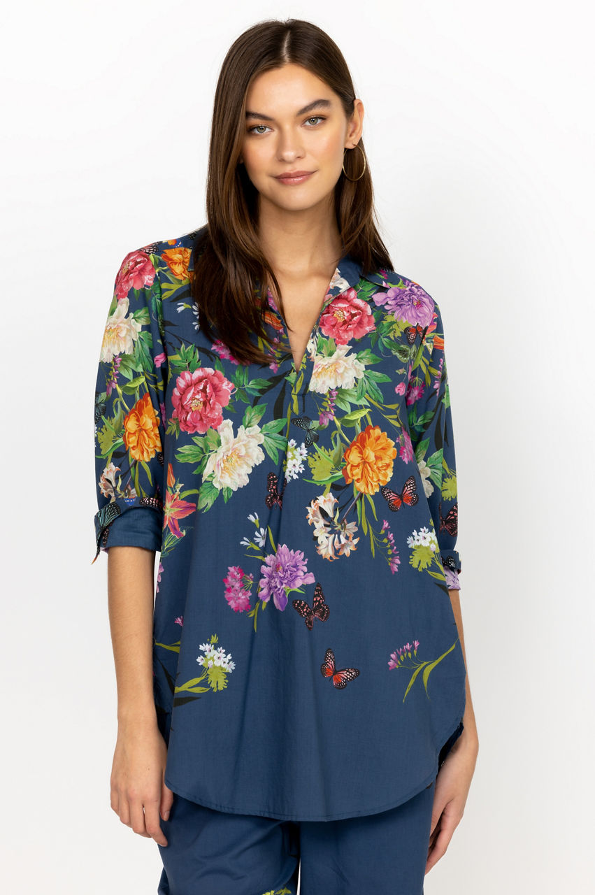 Infused with striking color, the Panya Henley Popover Top is an ode to springtime floral bouquets. This relaxed fit, 100 % cotton top features an open neckline and delicate shell buttons combined with an eye-catching print that embodies the spirit of the season. Pair with a relaxed chino and stylish flats for a casual combination perfect for warm days.