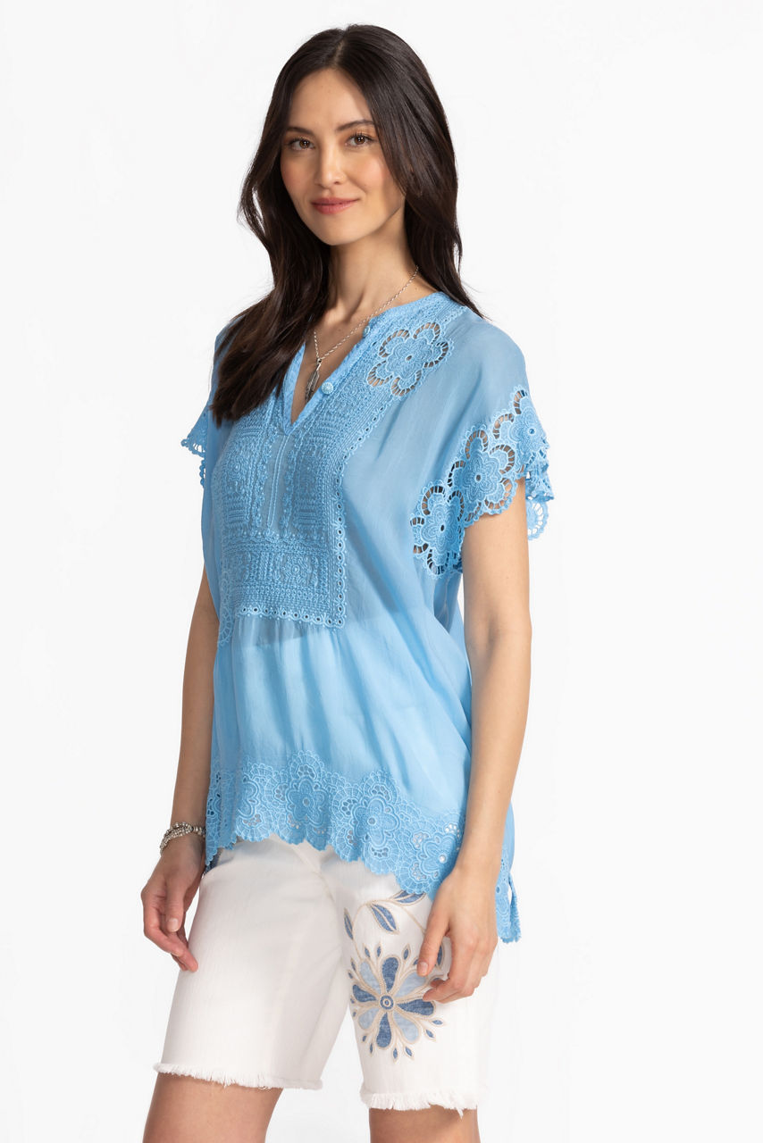 Thoughtfully crafted from a lightweight flowing fabric, the Parade Embroidered Tunic is embellished with exceptional embroidered detailing and floral accents. Featuring a banded neckline with a keyhole front, this elevated casual blouse offers Dolman sleeves and elastic scallops at the hemline. Pair with fitted pants and coordinating flats for a modern work look.