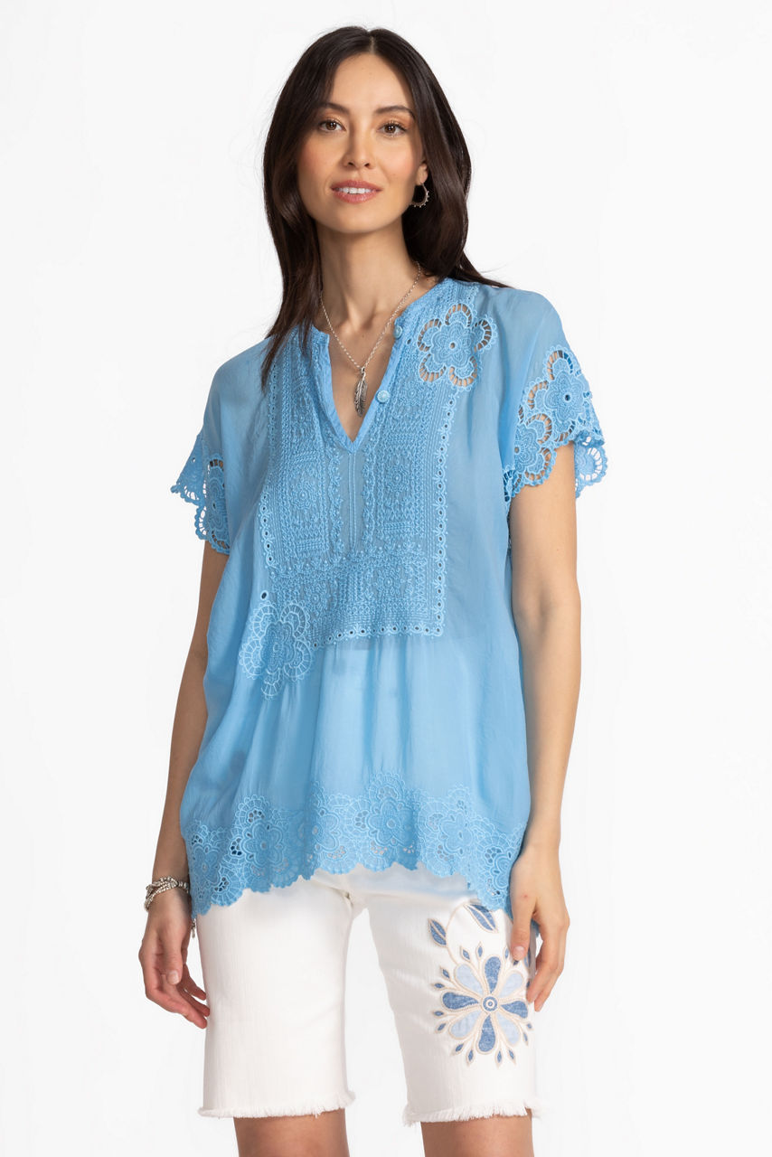 Thoughtfully crafted from a lightweight flowing fabric, the Parade Embroidered Tunic is embellished with exceptional embroidered detailing and floral accents. Featuring a banded neckline with a keyhole front, this elevated casual blouse offers Dolman sleeves and elastic scallops at the hemline. Pair with fitted pants and coordinating flats for a modern work look.