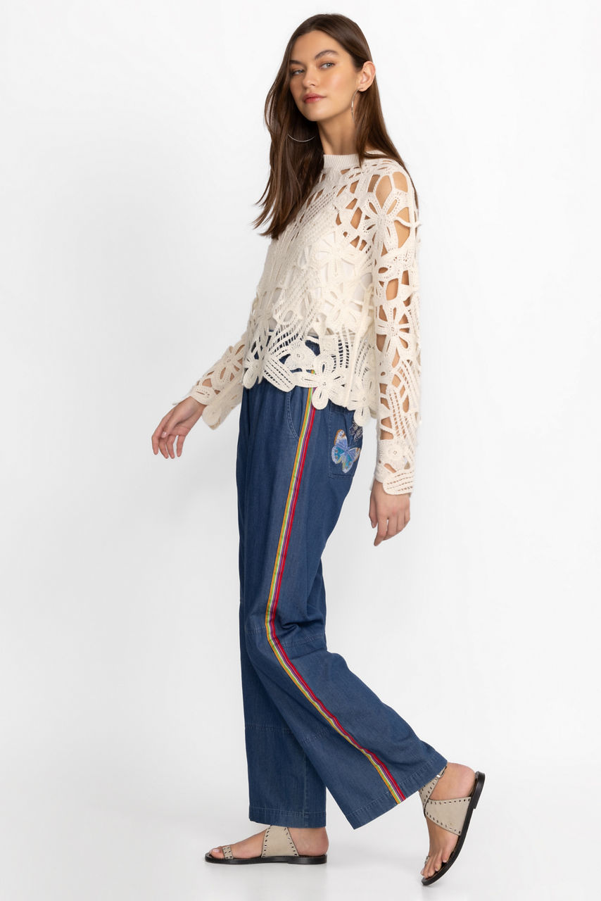 Crafted from 100% breathable cotton, the Paradiso Denim Pants feature a comfortable elastic waist for effortless wearability. Featuring pockets at the sides and back, these stylish pants are embellished with colorful placement embroidery and a unique sporty tuxedo strip at the leg line. Pair with a coordinating tank oversized linen button down for a fresh casual look.