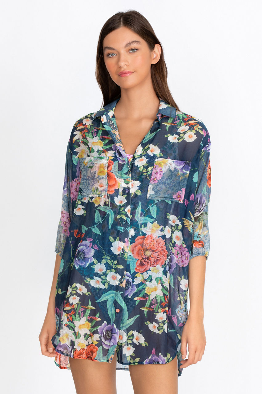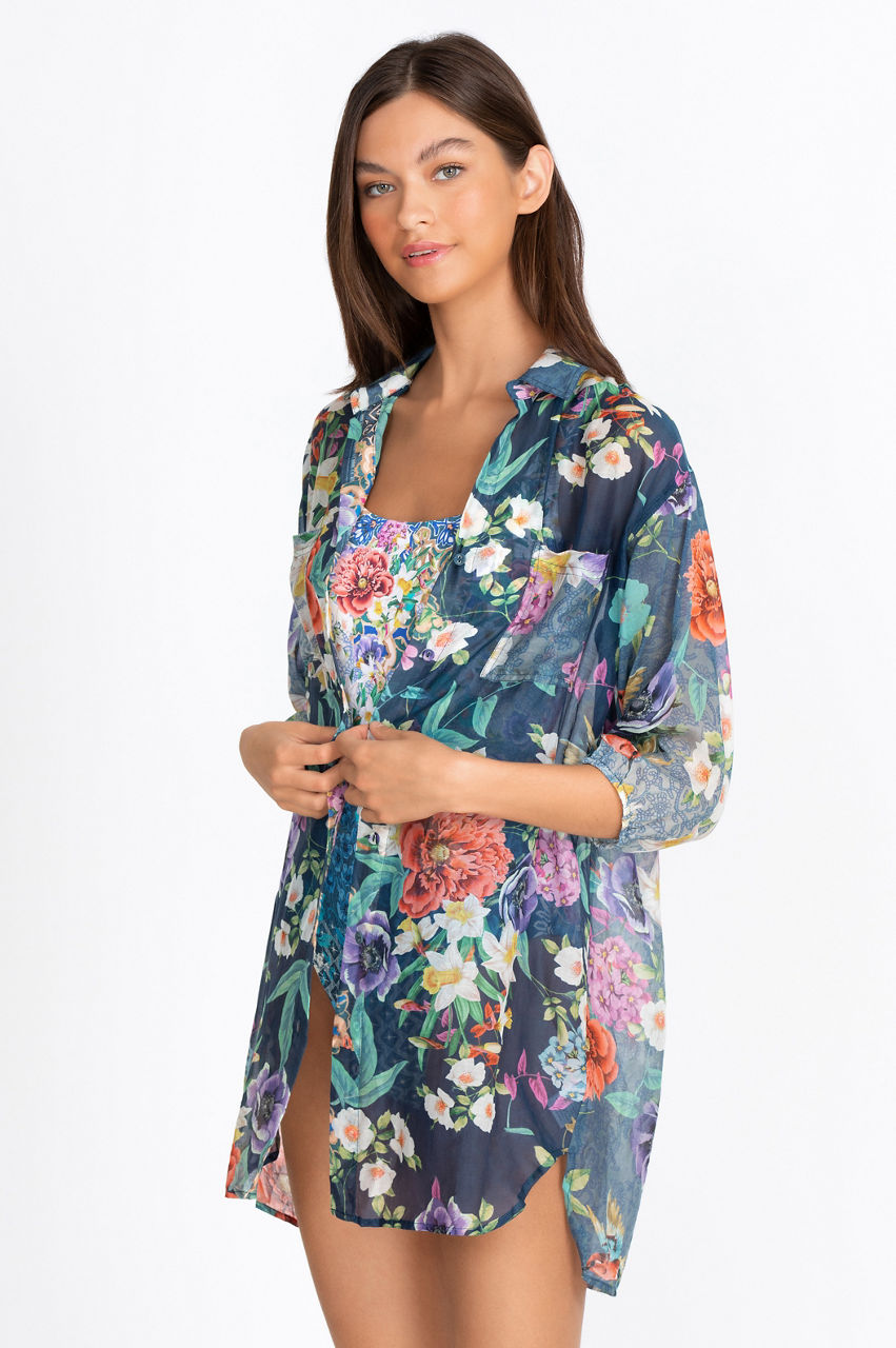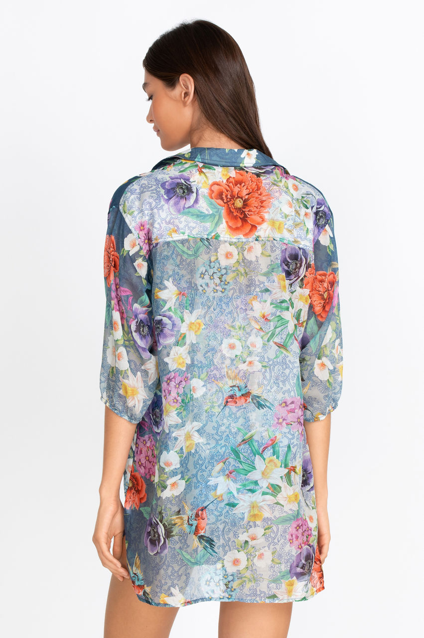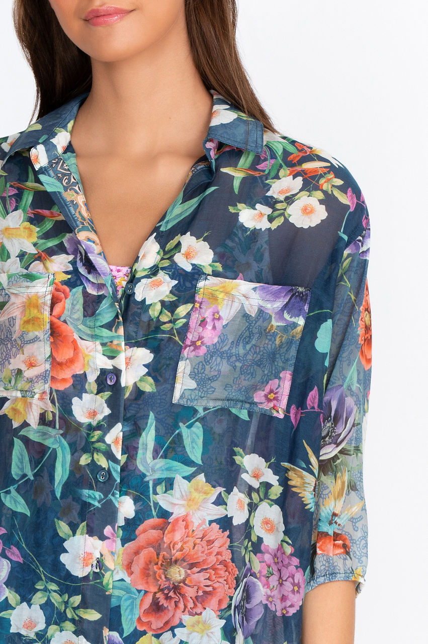 Loose-fitting and breezy, our Paria Shirt Dress will quickly become your favorite piece for picnics and other casual gatherings. A royal blue background pops with a brilliant red, white and purple floral pattern. Three-quarter length sleeves float from the shoulders before buttoning beneath the elbow. Front patch pockets, buttons, and an adorable shirt-front hem create a cute, feminine profile. Pair with the Dreamer Braided Raffia Hat with a complimentary cloth band and a comfortable pair of sandals, and don t forget to bring the wine!