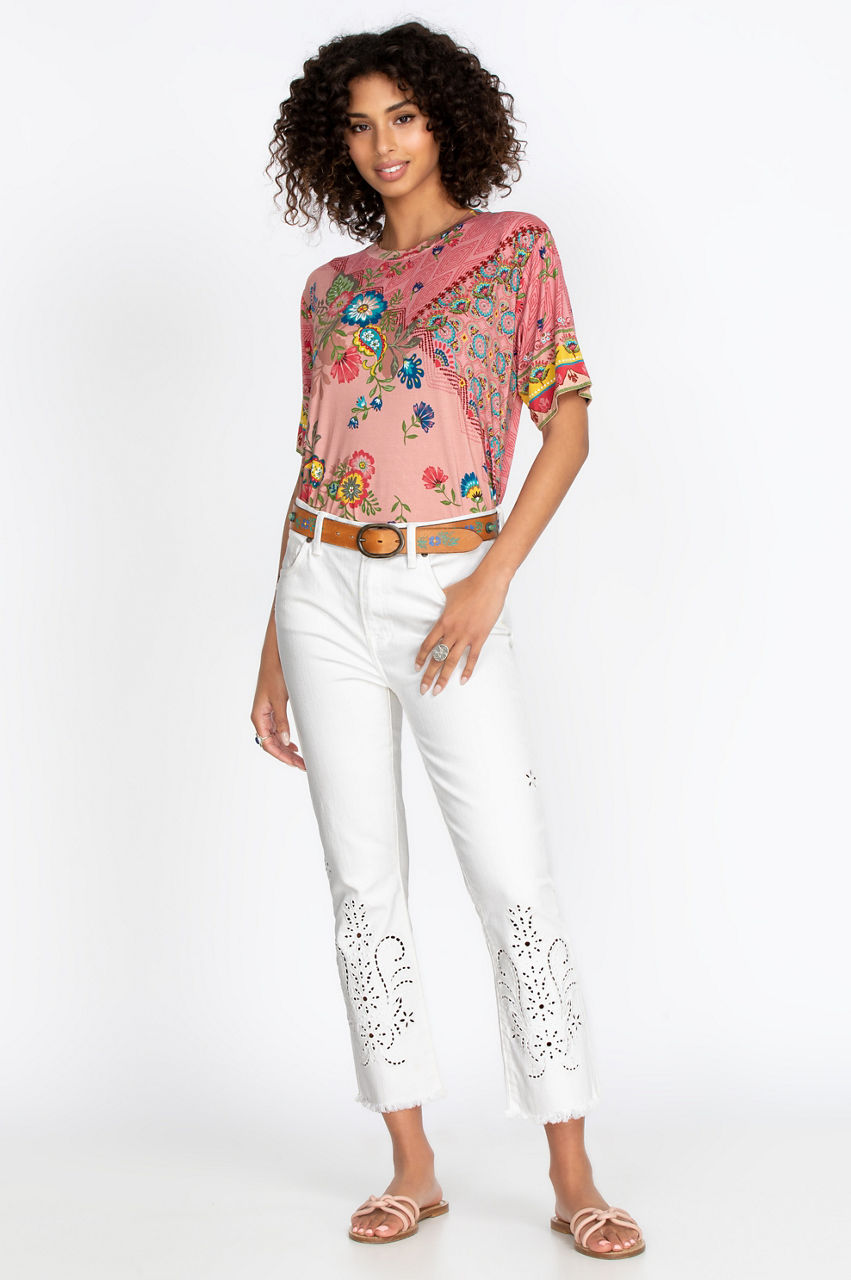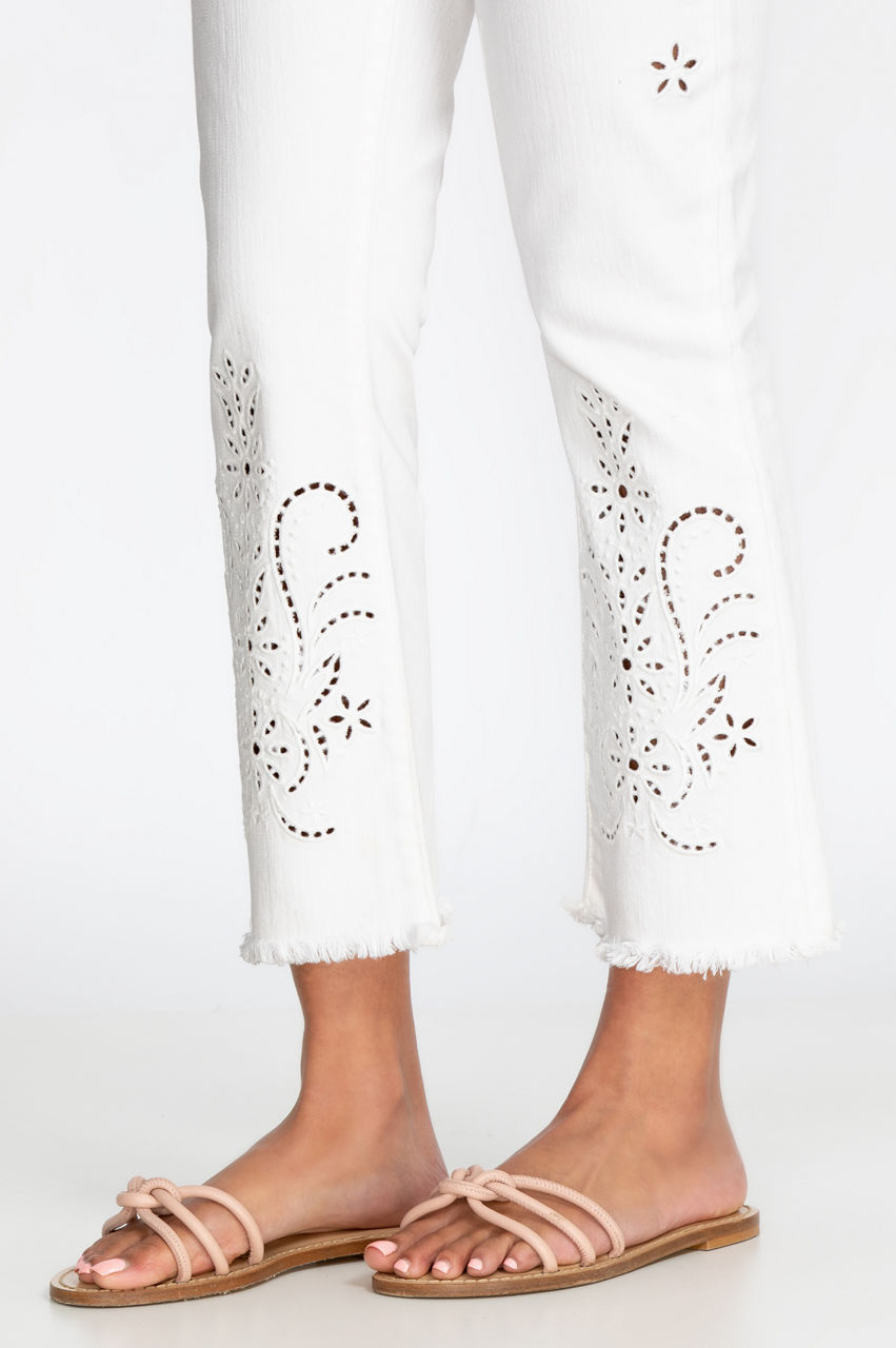Add the finishing touches to a flawless Bohemian look with our Pashmina White Eyelet Baby Boot. This timeless pant features an oh-so-comfortable fit and beautiful artistry. Pair them with your favorite boho blouse, heeled boots, embroidered belt, and layered jewelry to pull together a laid-back Bohemian look that you simply cannot get enough of.