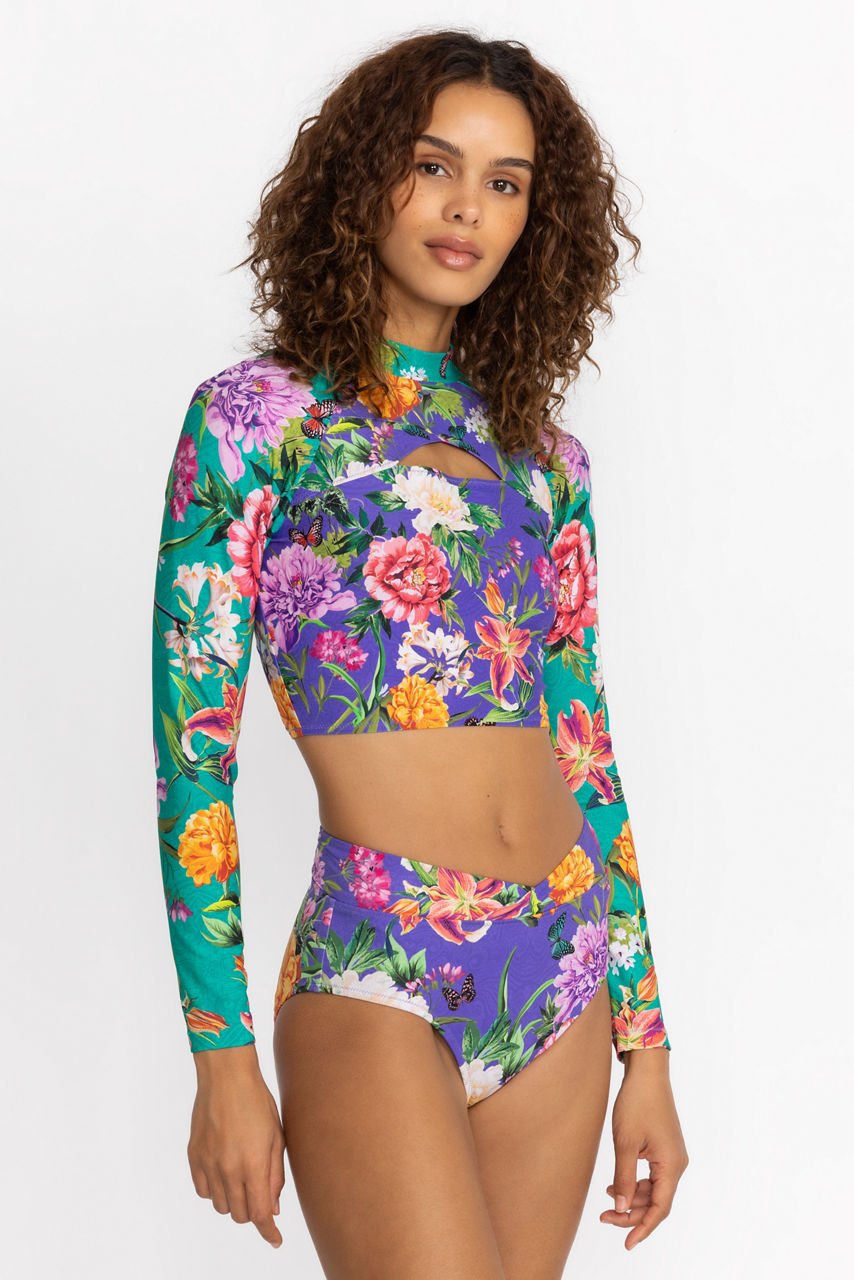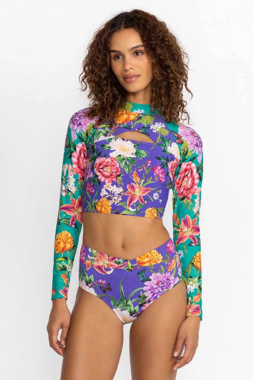 Vibrant and floral, the Peacock Goza V Surf Top is a statement piece for active days on the water. Featuring long sleeves an eye-catching keyhole neckline for a touch of flair, this swim top offers additional coverage without sacrificing style. Pair with the Peacock Goza V Swim Bottoms for a perfectly coordinated seaside ensemble.