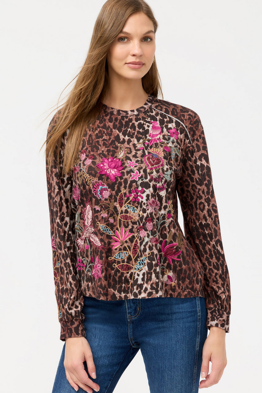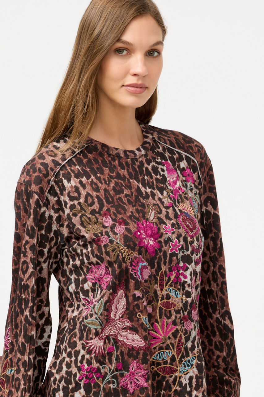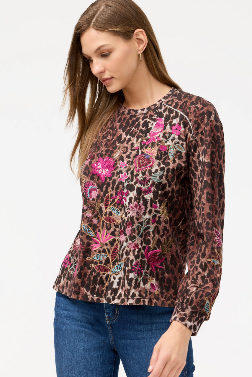 Crafted from 100% breathable cotton, the Penellope Seamed Sleeve T-Shirt is embellished with intricately embroidered detailing in vibrant tones paired with a rich leopard pattern. Featuring a crew neckline and raglan sleeves, this tee offers gently puffed sleeves finished with a cuff. Pair with cozy joggers and fashion sneakers for a casual lounge look.