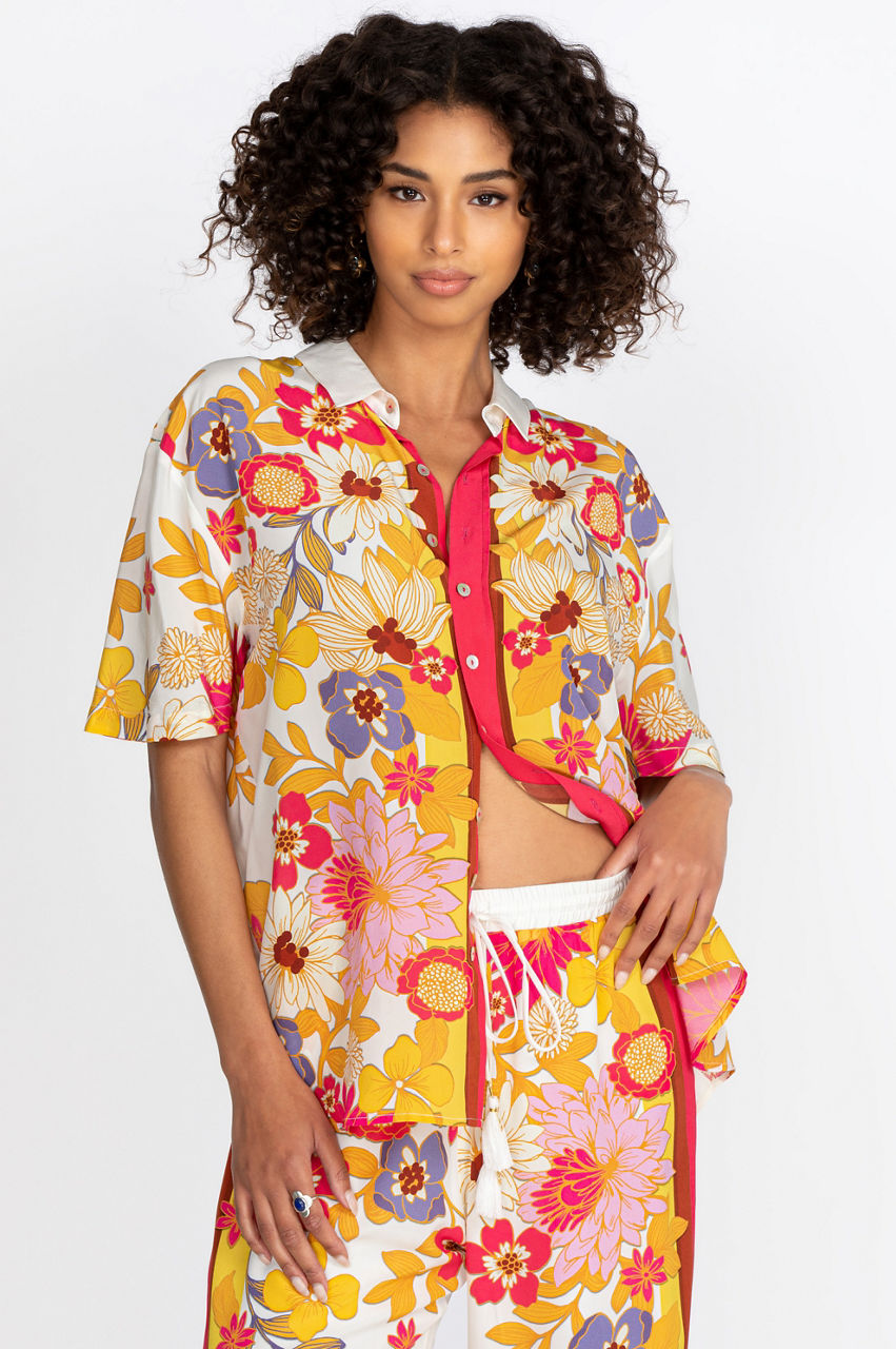 This classy button-down shirt takes inspiration from traditional dress shirts with its straight collar. However, the Penny Button-Down Shirt adds fantasy to this look with its colorful floral print. This elegant shirt will take a classic pantsuit to the next level, but it will look great tucked into your favorite jeans.