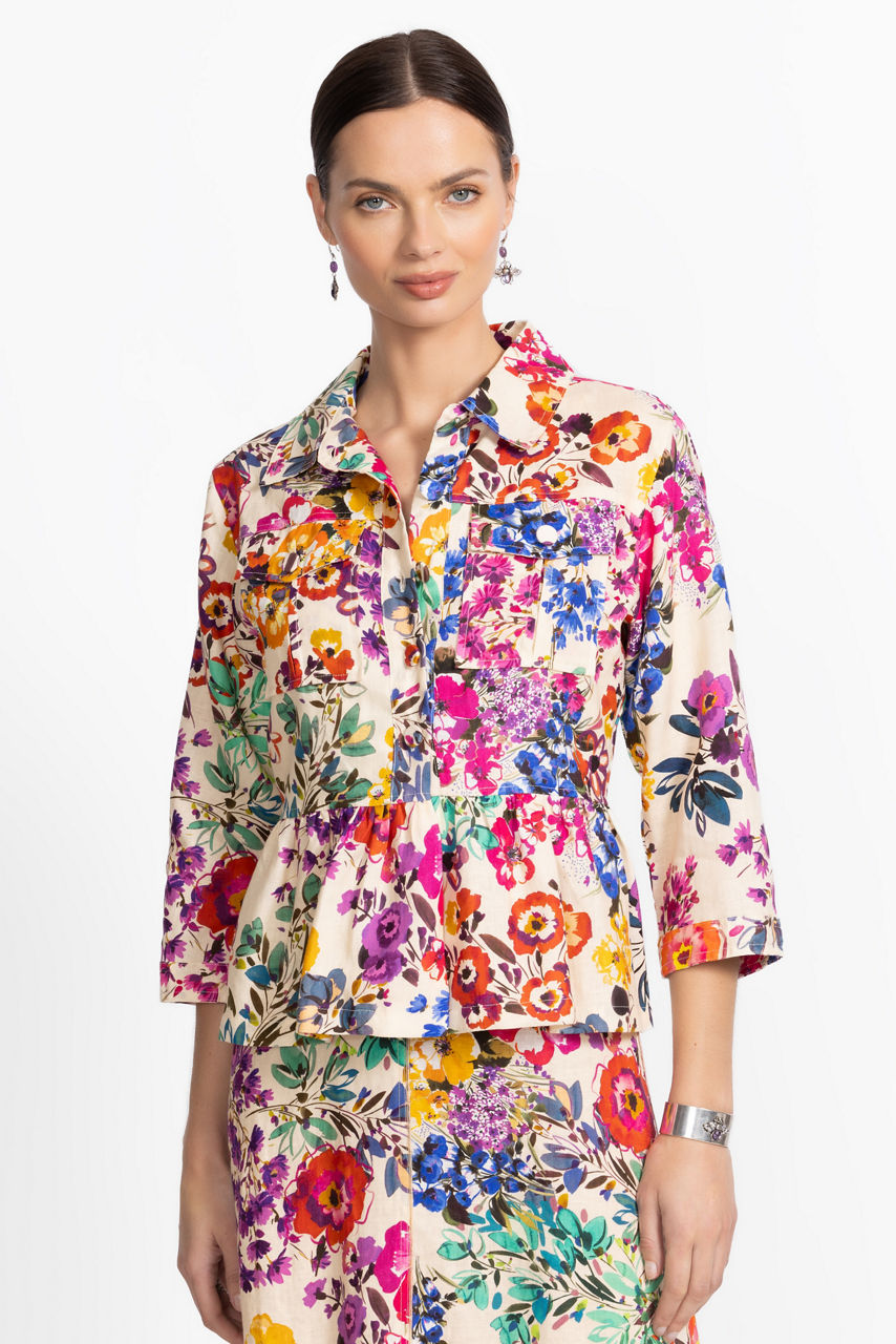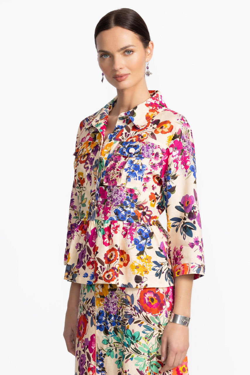 Featuring a bold and vibrant floral array, the Peplum Linen Jacket boasts chic comfort and stunning eye-catching color. Crafted from 100% rich linen, this casual jacket is designed with a front button closure and patch pockets at the chest and is finished with a polished peplum skirt at the hemline. Pair with a bold tank and fitted denim for a cool casual ensemble.