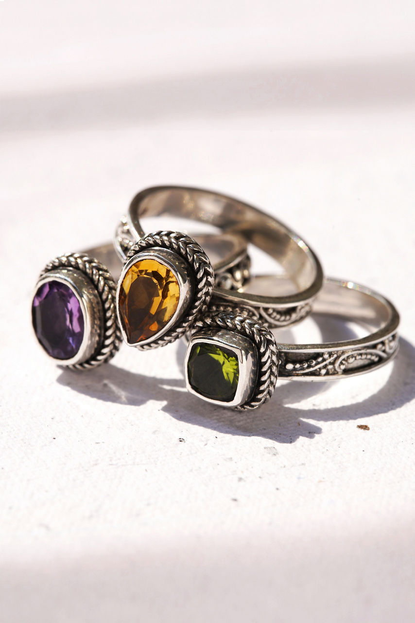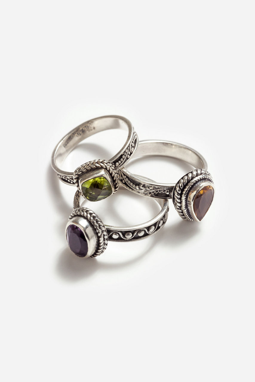 The Perfect Prism Stackable Ring Set features three unique rings that will pair perfectly with a variety of styles. Handcrafted from sterling silver and designed with a combination of high polish and oxidized finishes, these stunning rings each hold a shimmering stone in amethyst, citrine or peridot. Pair wide leg jeans with a bold colorful top and add these rings to the look for a hint of shine.