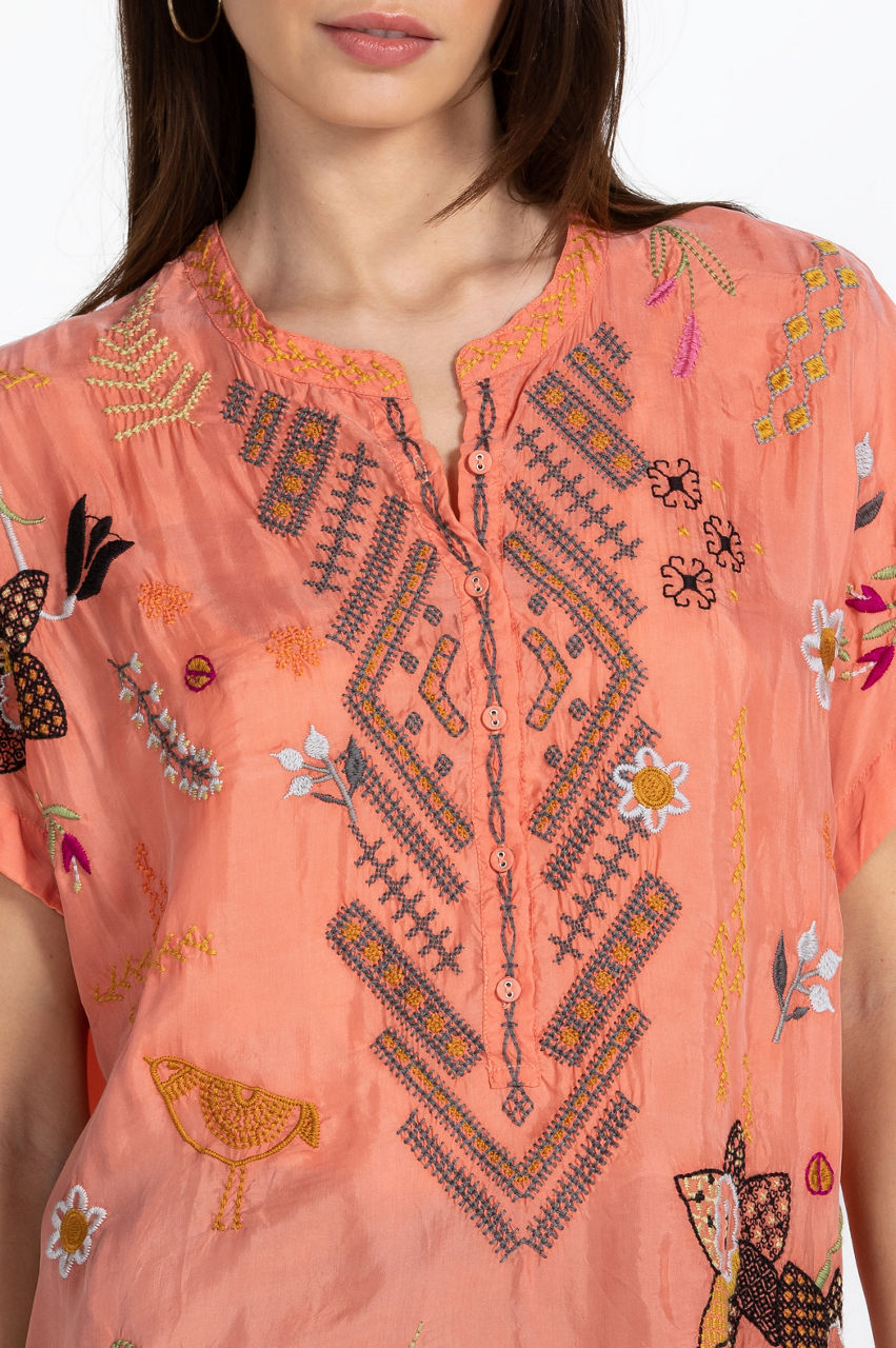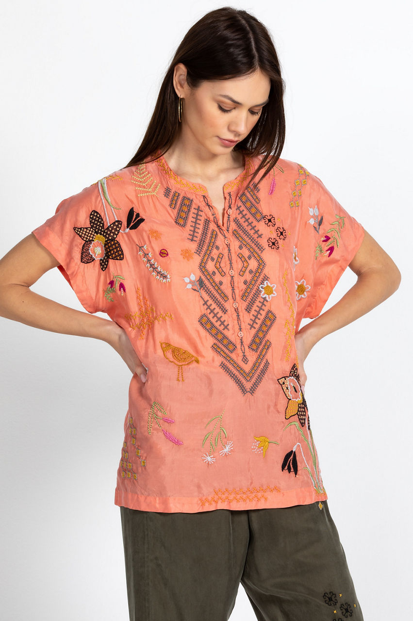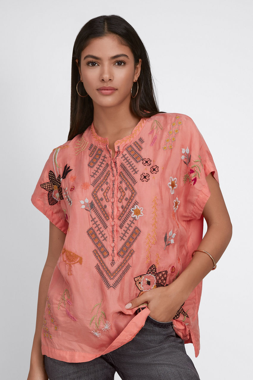 Characterized by earth-inspired motifs, the Perla Blouse puts a statement-making twist on a classic warm-weather silhouette. This relaxed blouse is made from a floaty material and features a round neck, a front button fastening, and a lively placement embroidery. Bring a touch of color to daytime ensembles by pairing this blouse with jeans or plain midi skirts.