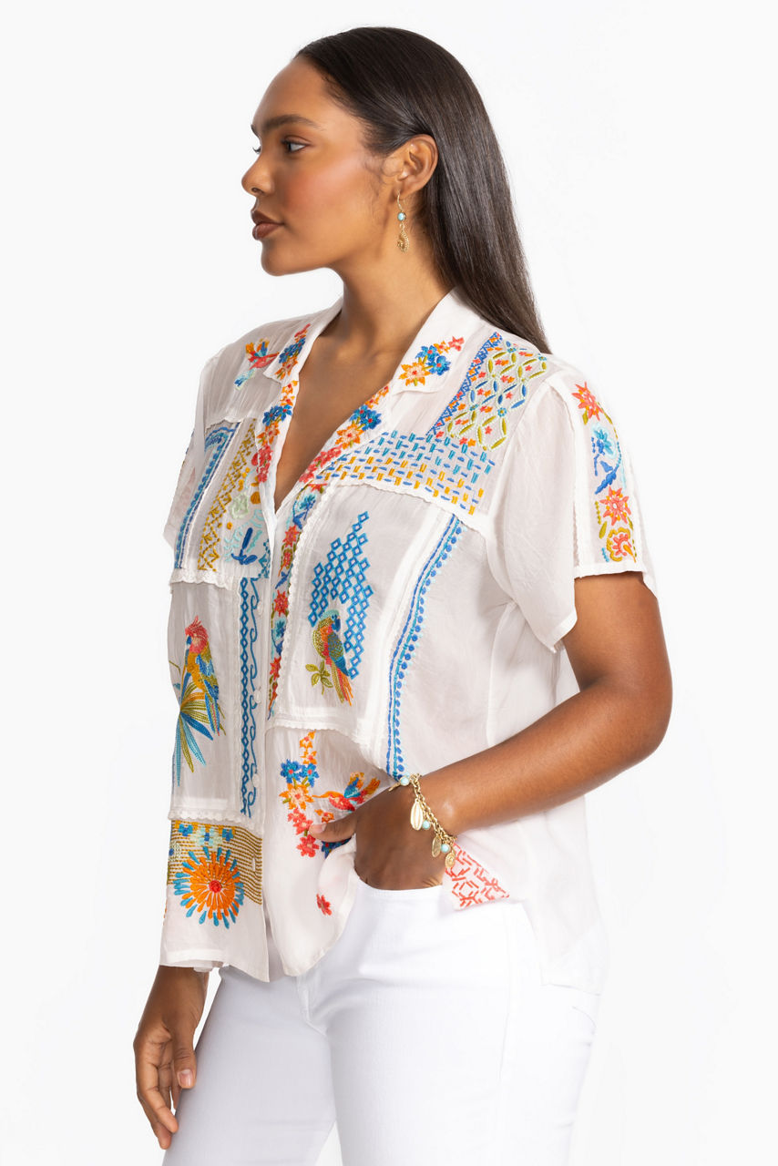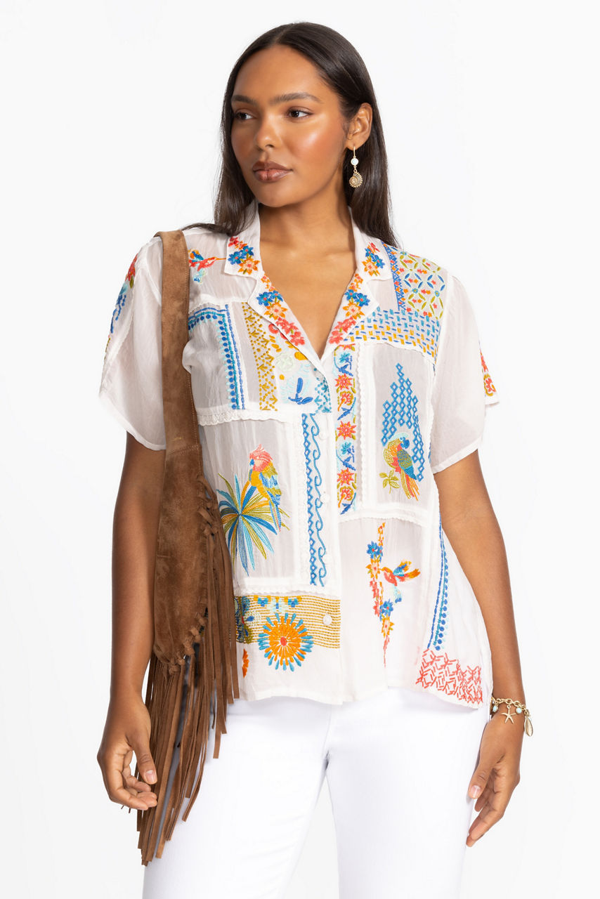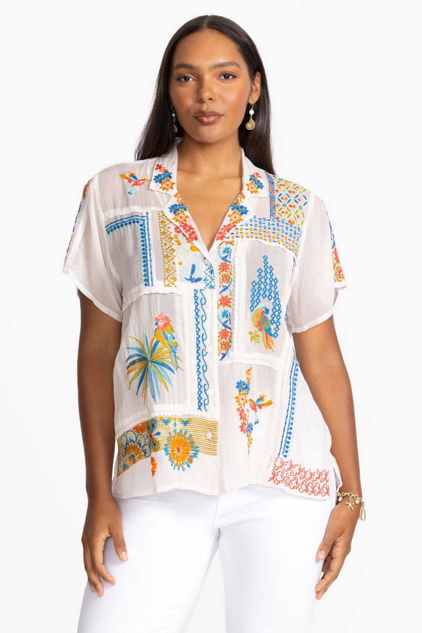 Adorned with vibrant floral patterns in a patchwork design, the Petra Shirt offers a modern take on a classic wardrobe staple. Crafted from a lightweight flowing fabric, this collared button-down shirt offers a convertible collar. Pair with khaki linen trousers and casual slides for a polished casual ensemble perfect for the weekend.