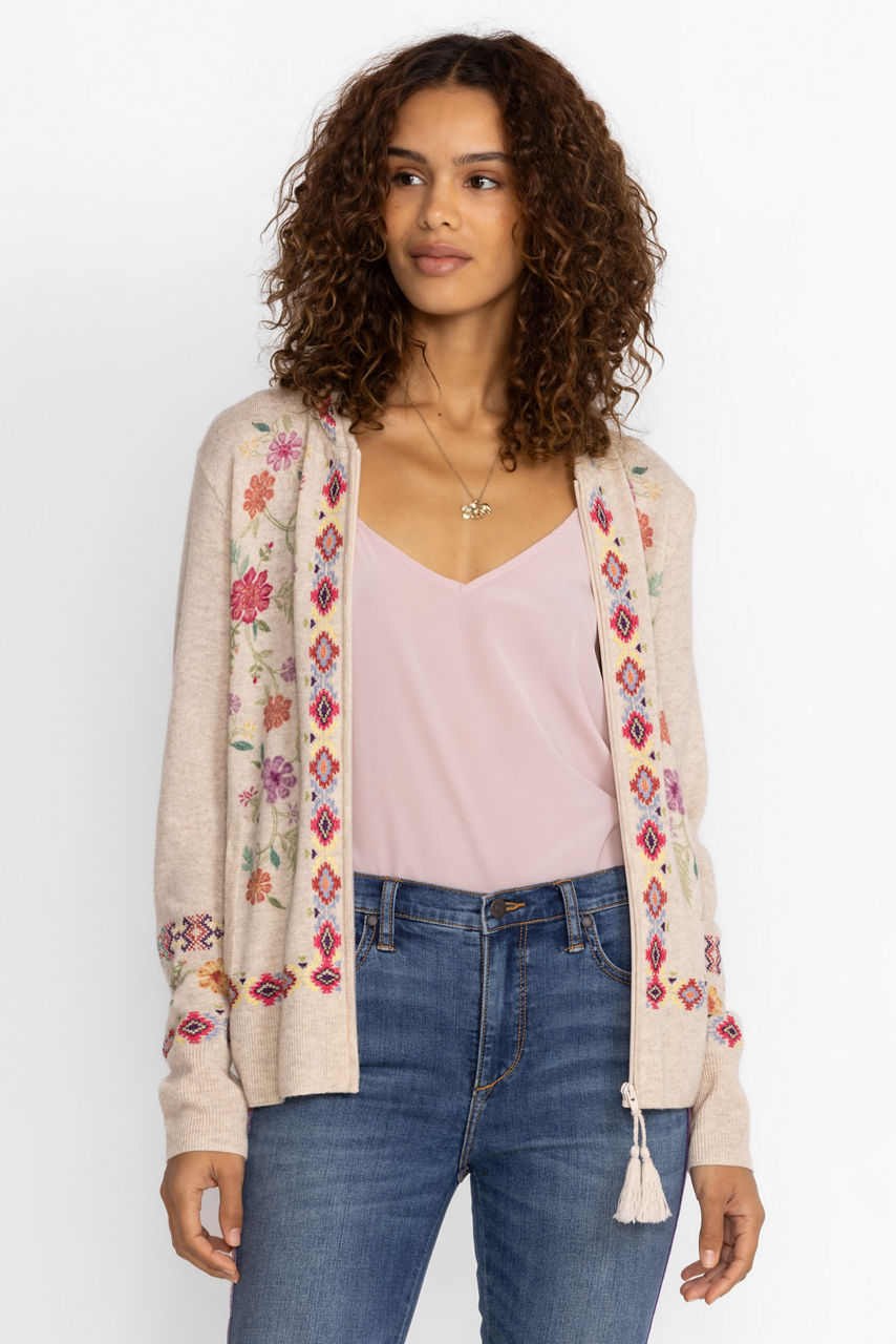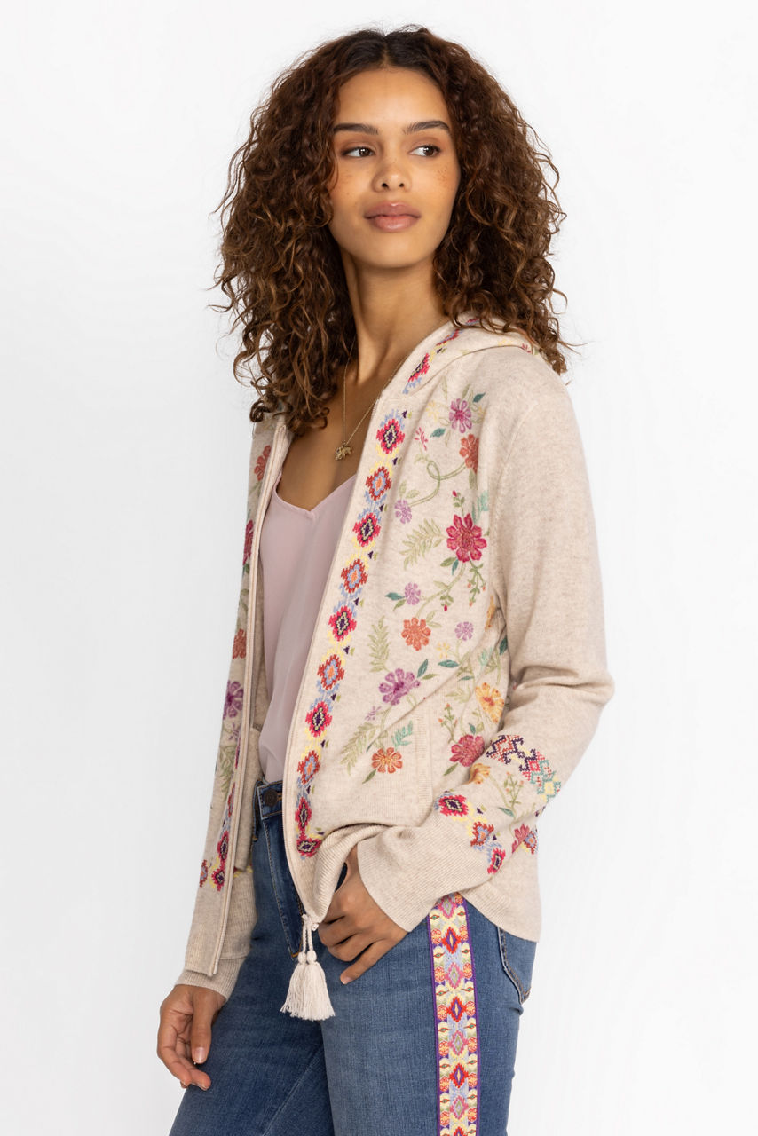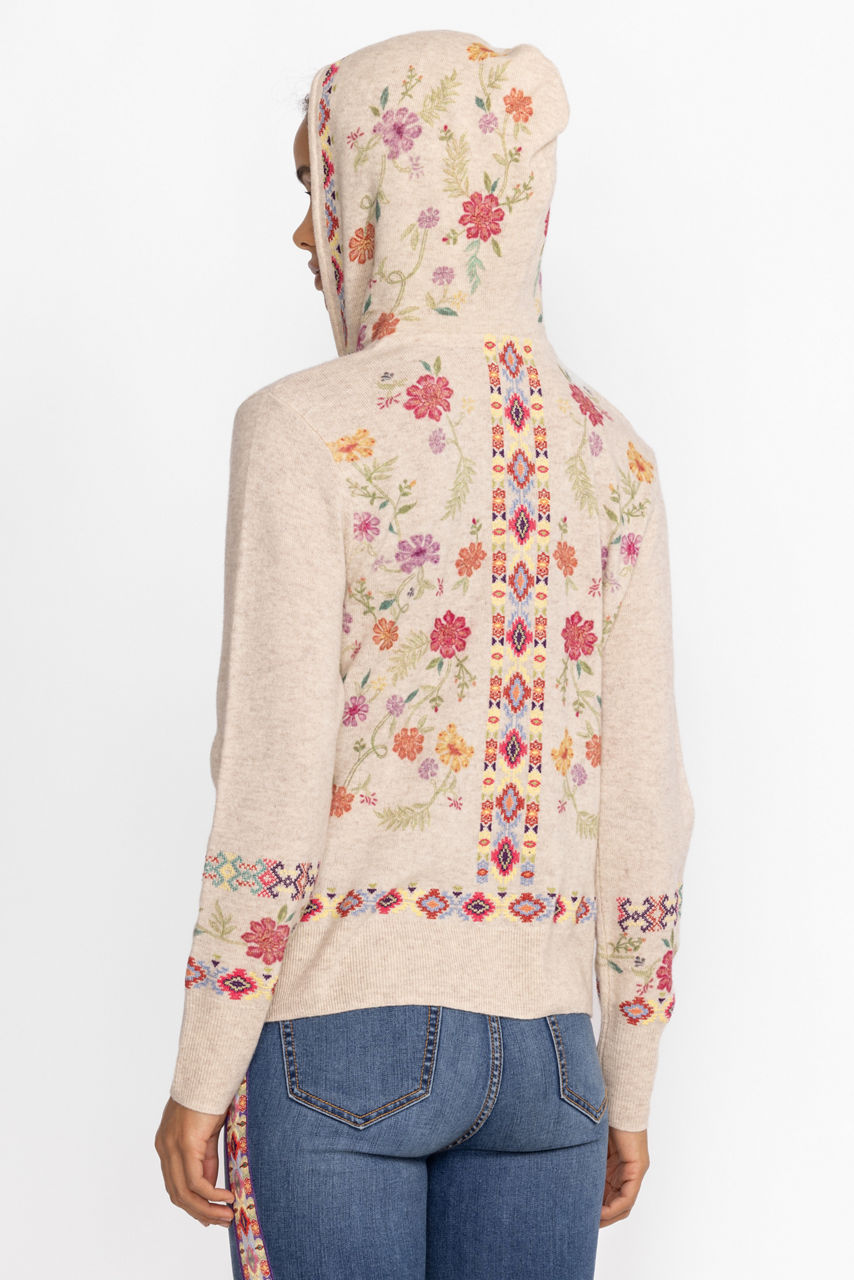 Crafted from a cozy cashmere blend, the Phoebe Cashmere Hoodie offers whimsical layering option for cooler days. Featuring front pockets and a zipper closure, this hooded sweater is adorned with playful embroidery and lovely floral designs. Pair with classic chinos and a long sleeve tee for a casual daily look with a fanciful flair.