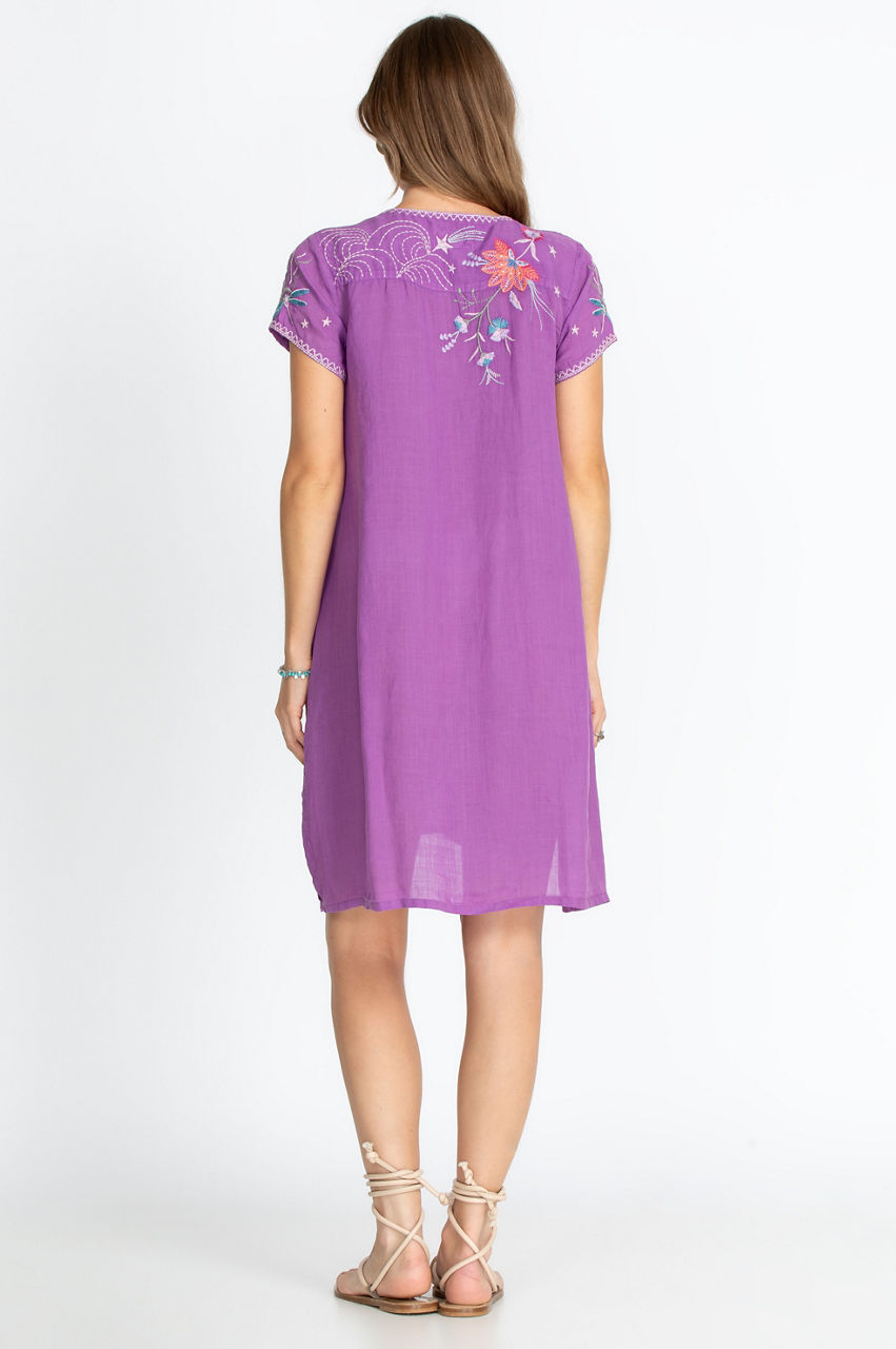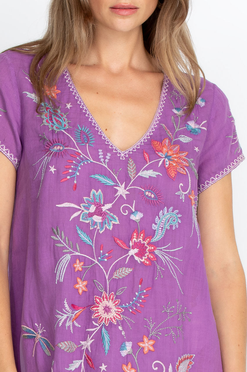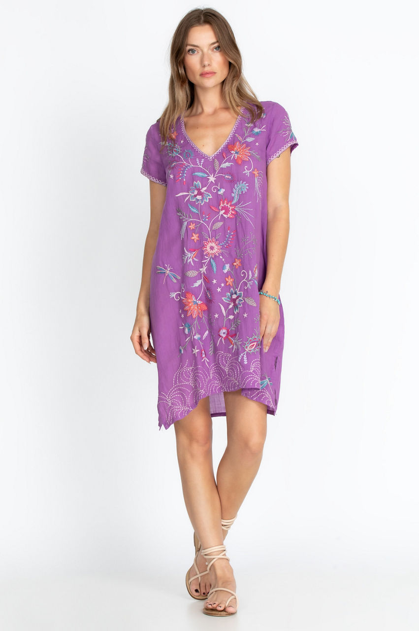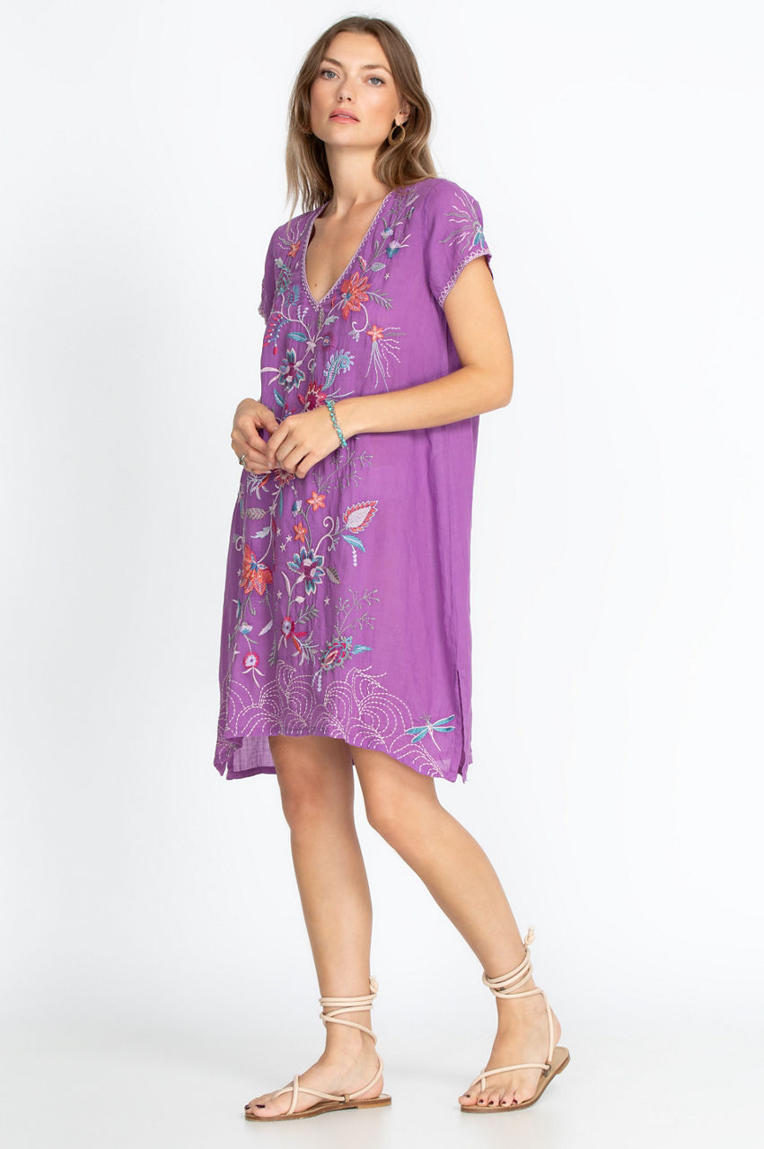 Create movement and draw attention to your silhouette in a flattering way with the sophisticated draped effect of this tunic-inspired dress. The linen fabric, floral motifs, and gorgeous embroidery come together for a vibrant result. Have fun dressing down this versatile garment by layering it with a lightweight hoodie, or dress it up with your favorite jewelry and heels.
