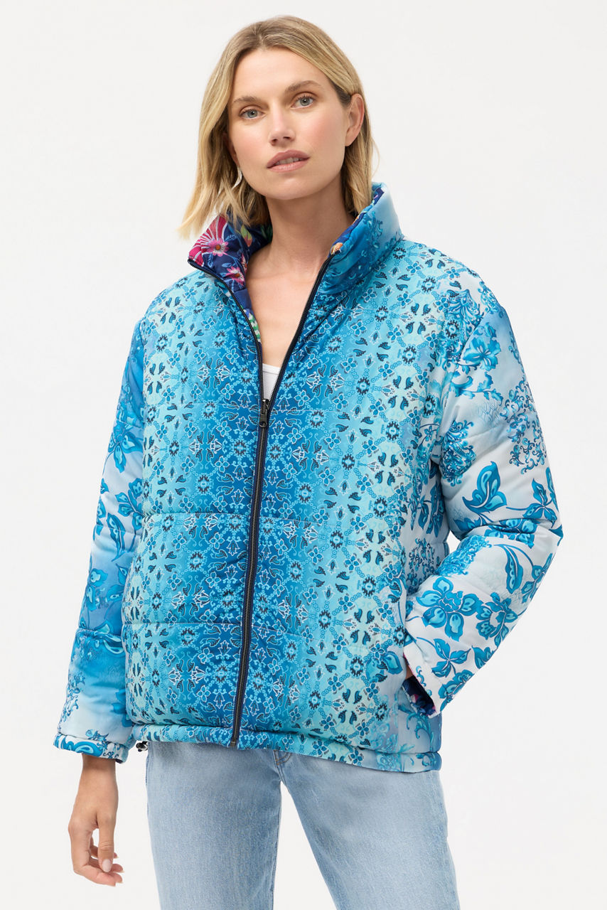 Beautifully embellished with two unique designs, the Pia Puffer Jacket is fully reversible, creating two distinctive looks. Featuring a standing collar and a zippered front, this cozy jacket offers a bungie cord at the hemline for a customizable fit. Layer over a warm sweater and thick leggings for a perfect cold weather ensemble.