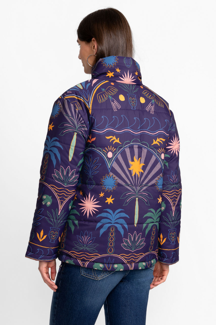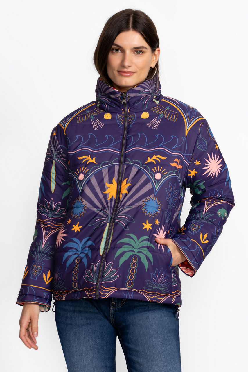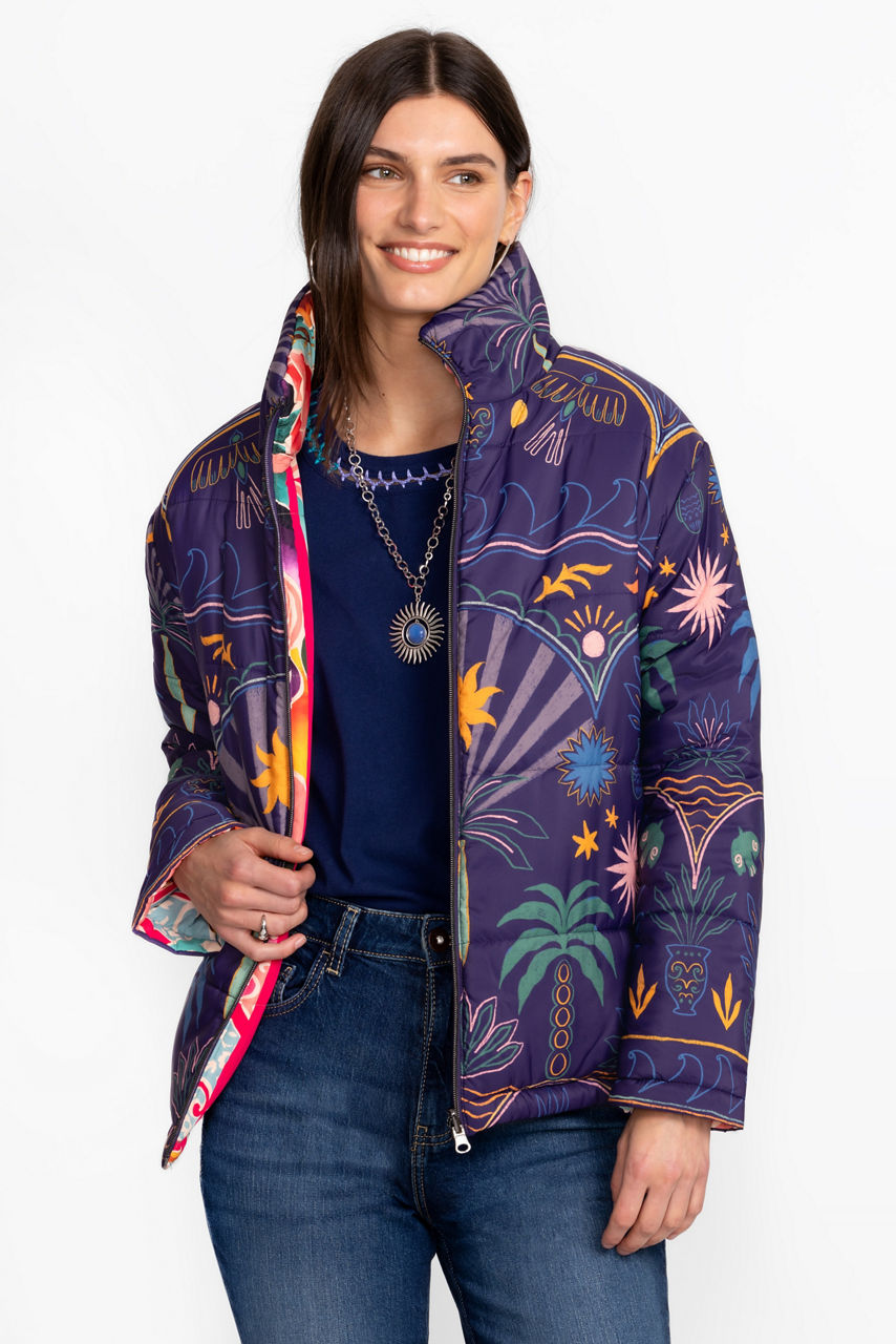 Cozy and colorful, the Pia Puffer Jacket is equal parts stylish and comfortable. Featuring two unique designs, this fully reversible jacket offers a standing collar with a zippered front and a bungee cord hem for a customizable fit. Layer over a wool pullover and lined pants for a refreshing cold-weather look.