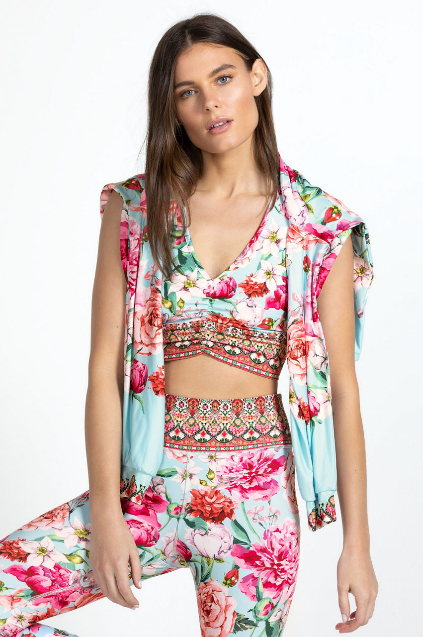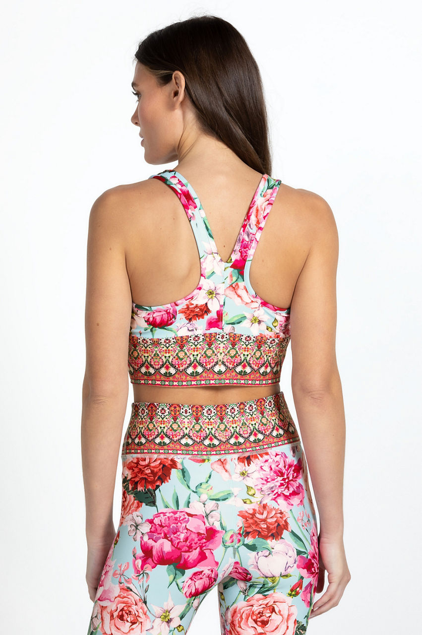 Steeped in romance, the Pink Rose Ruched Sports Bra evokes a feeling of serenity. This sports bra is made from a breathable material with added stretch for comfort and boasts a flattering V-neck, shoulder straps, a patterned elasticated hem, and colorful vintage roses. Wear with matching sports leggings to the next yoga or Pilates class.