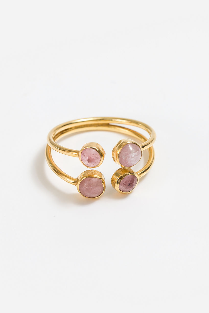 This ring is sure to make a statement with its two stone and elegant setting. The warm pink hue makes this cocktail ring an ideal accessory for a boho-chic look that features flowy bishop sleeves and geometric motif.