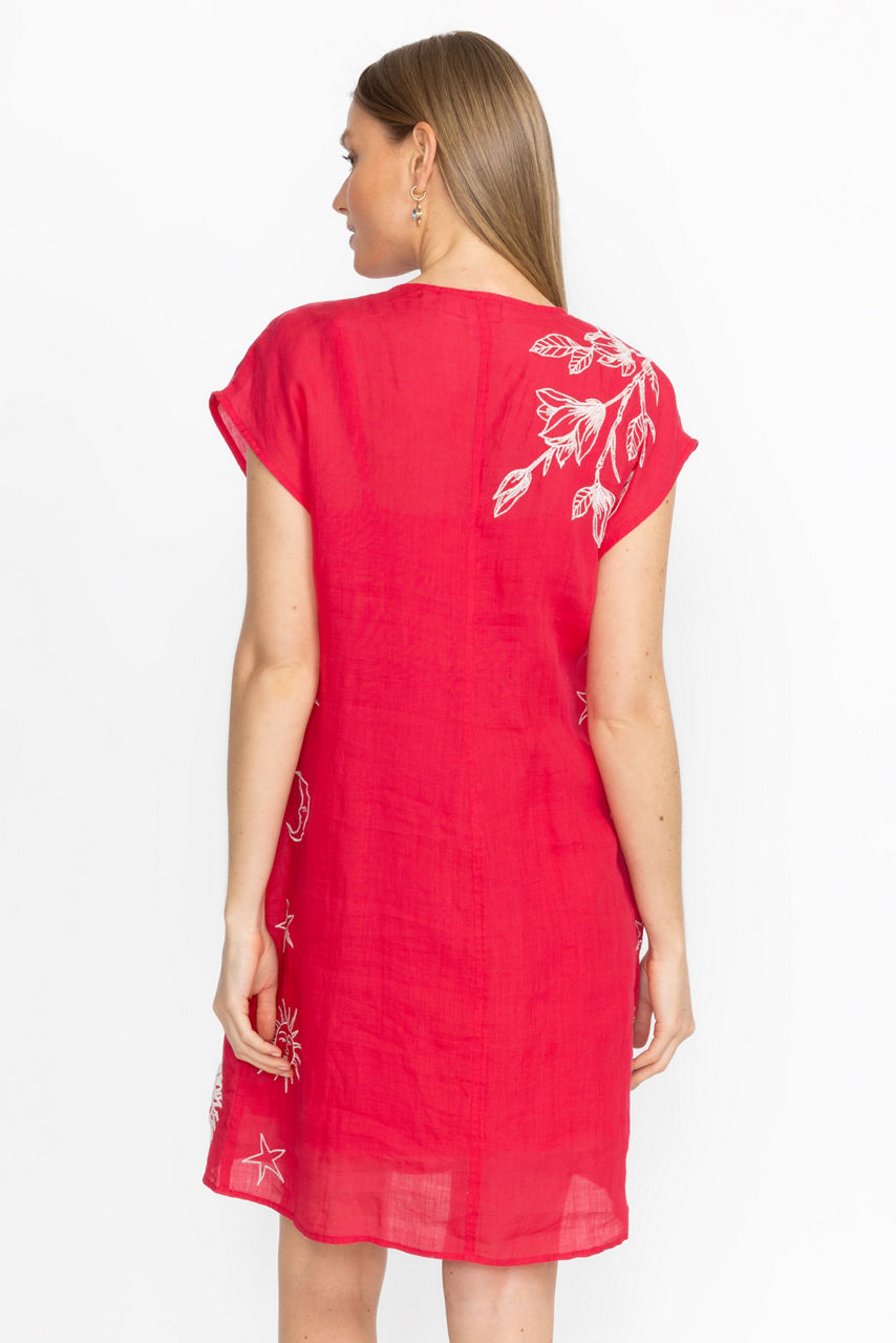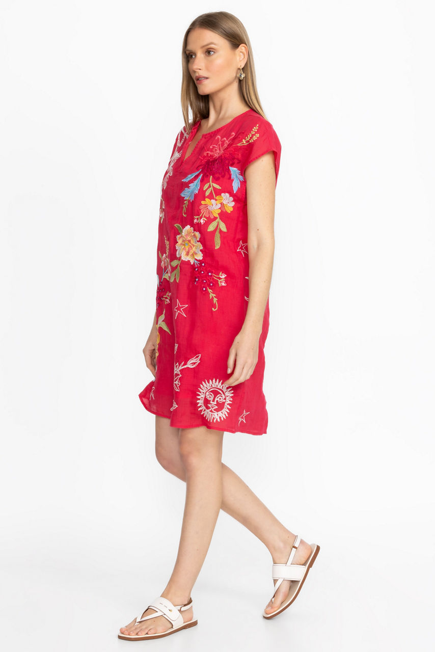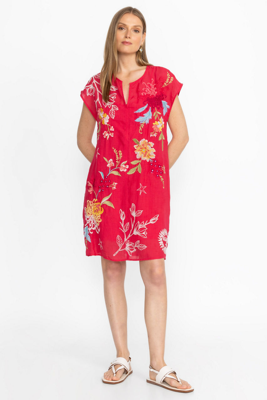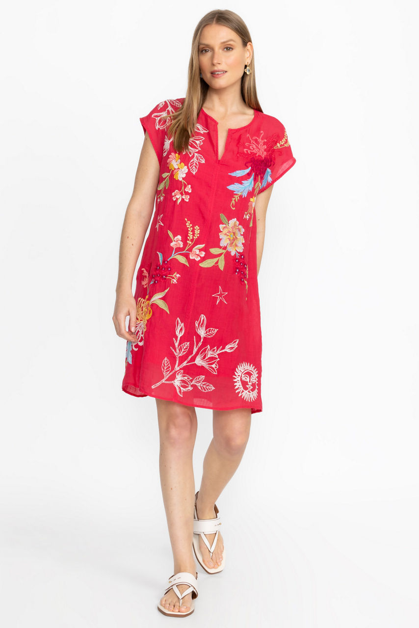 Bold and colorful, the Playa Dress is intricately embellished with delicate placement embroidery. Crafted from a lightweight, breathable fabric, this dress features a split V-neck and relaxed Dolman sleeves and is finished with a slip for additional coverage. Pair with bold flats or fashion sneakers for a delightful weekend look.