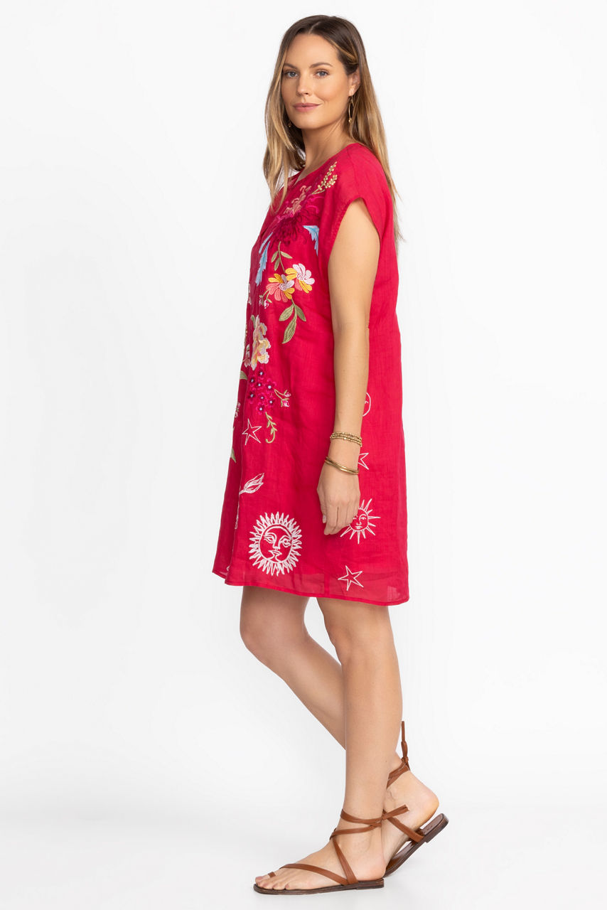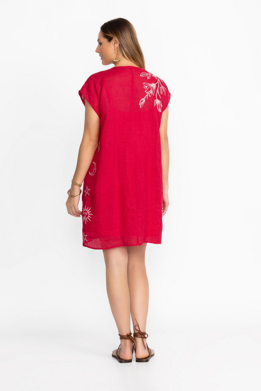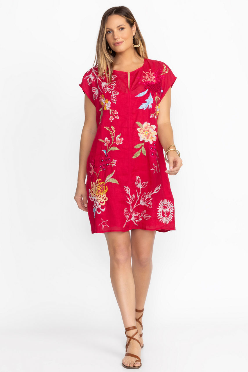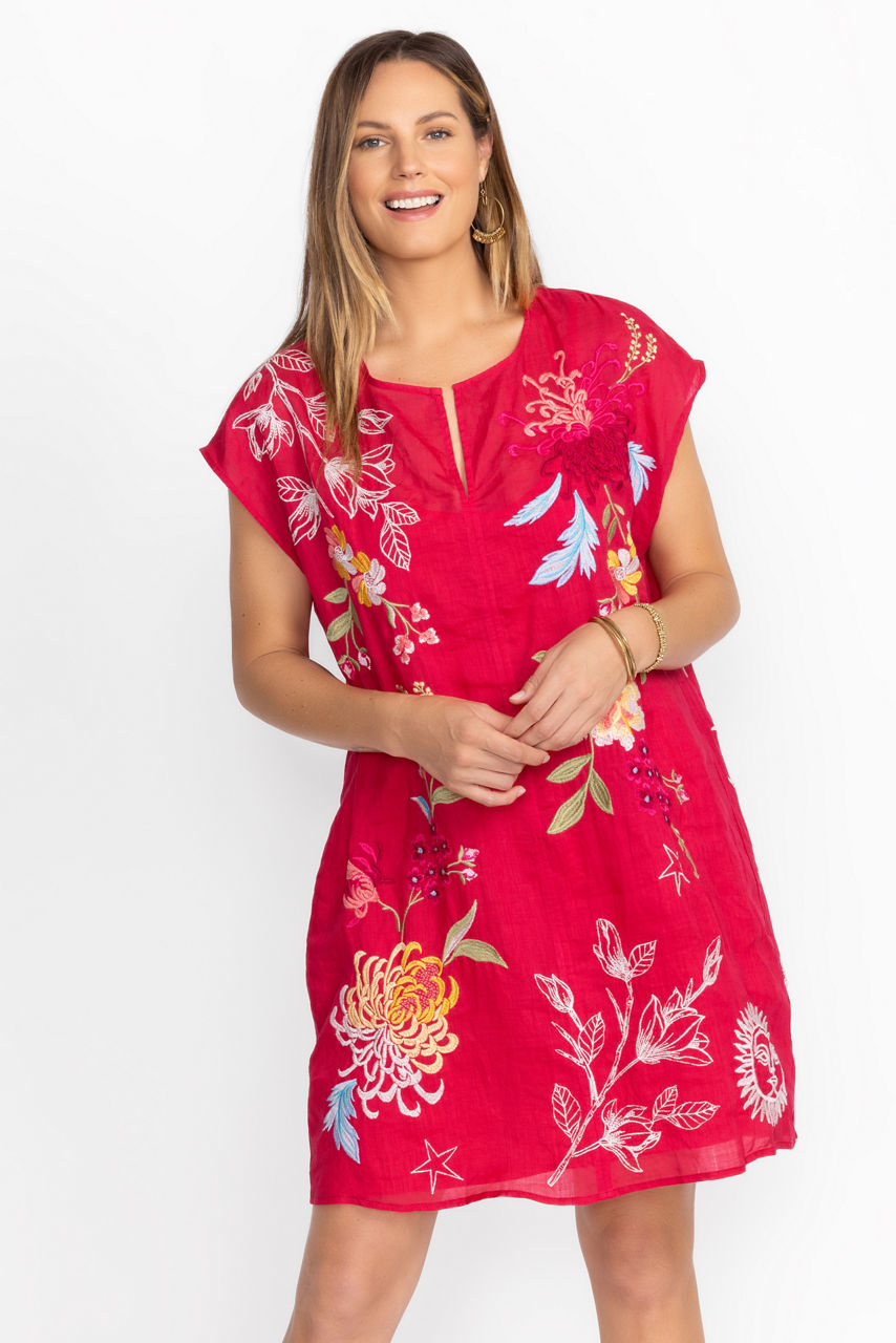 Bold and colorful, the Playa Dress is intricately embellished with delicate placement embroidery. Crafted from a lightweight, breathable fabric, this dress features a split V-neck and relaxed Dolman sleeves and is finished with a slip for additional coverage. Pair with bold flats or fashion sneakers for a delightful weekend look.