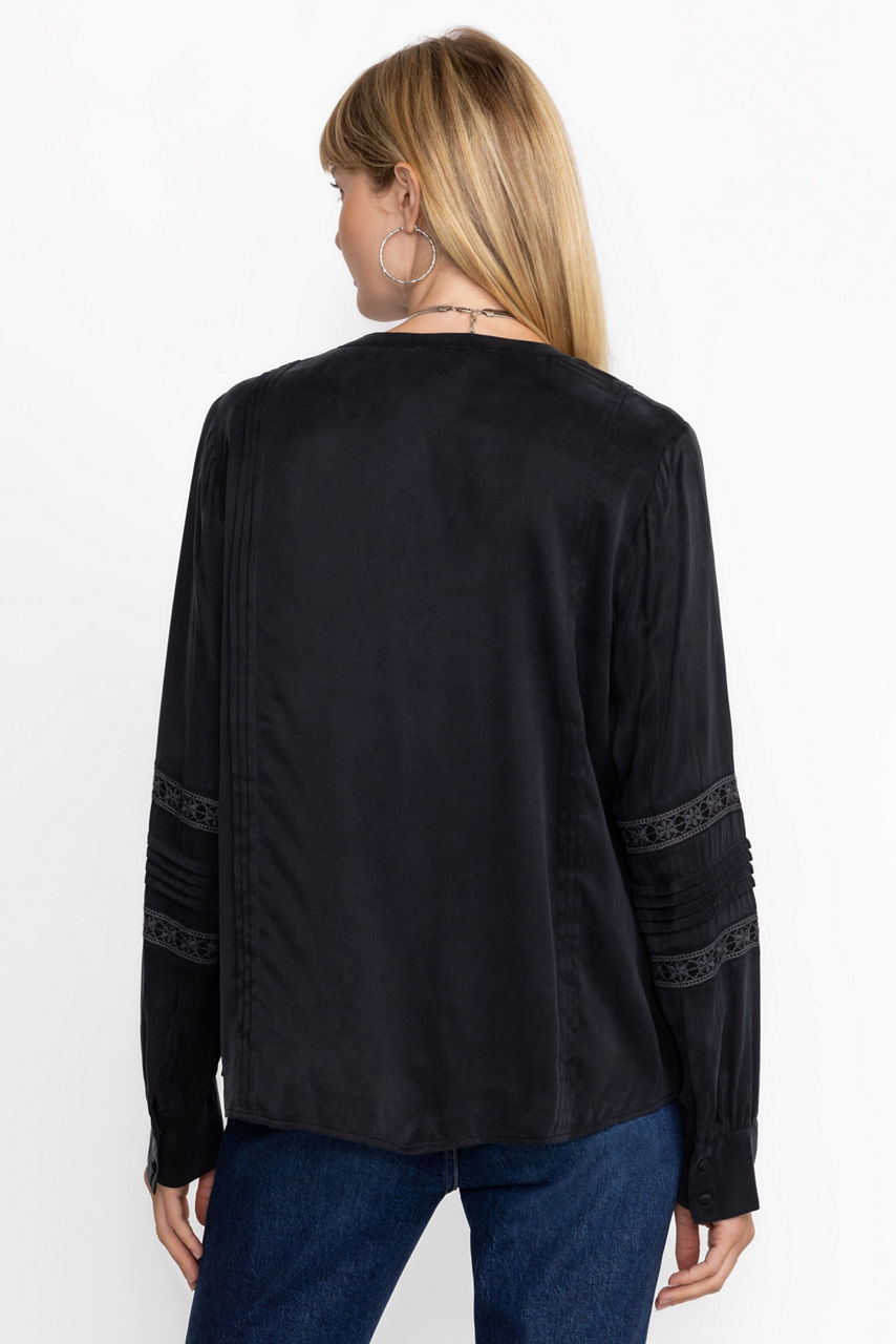 Crafted from a lightweight breathable fabric, the Pleated Button Down Top with Shirring is accented with striking contrasting elements. Featuring a mandarin collar with a fabric covered button-front, this top is finished with an intricately detailed yoke and gently puffed sleeves. Pair with relaxed-fit denim and leather flats for an elevated casual look.