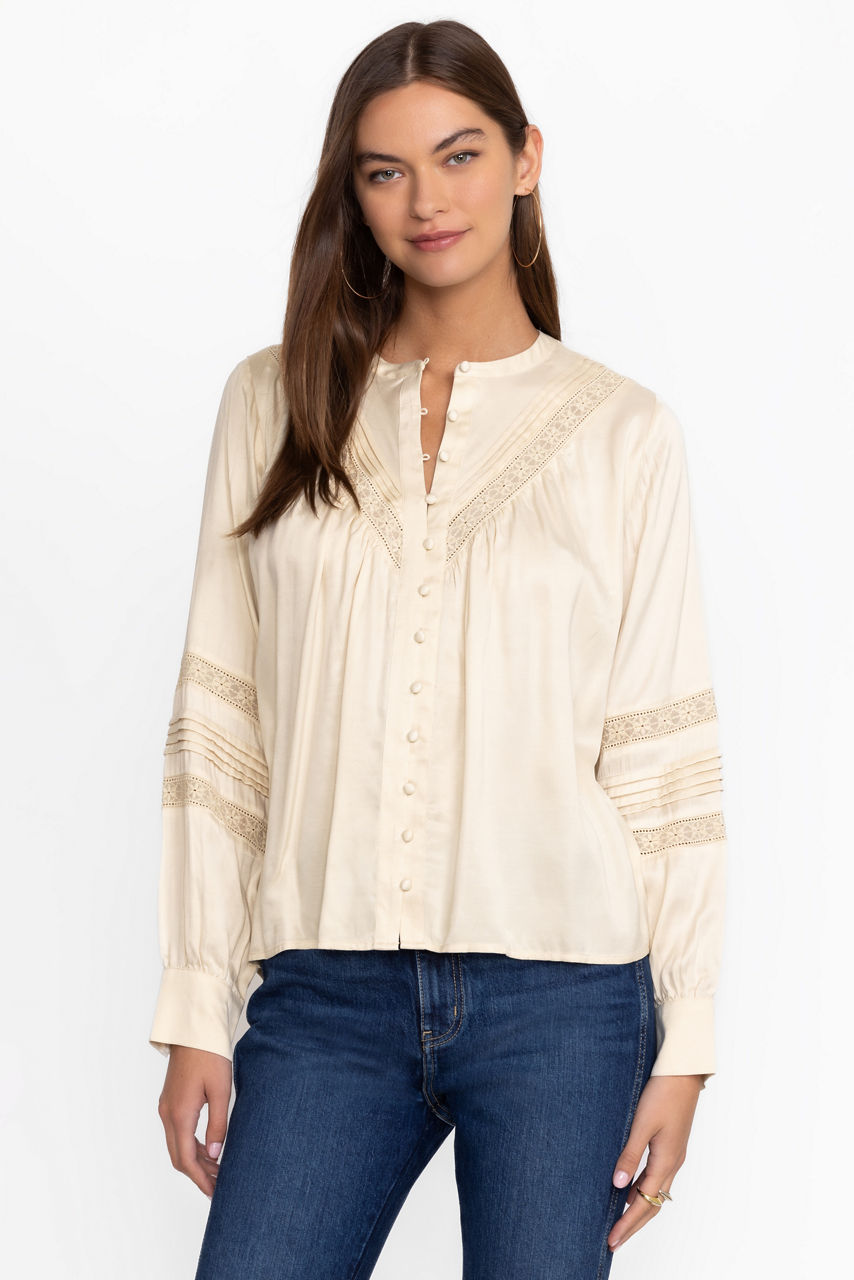 PLEATED BUTTON DOWN TOP WITH SHIRRING