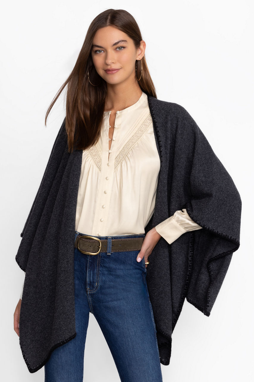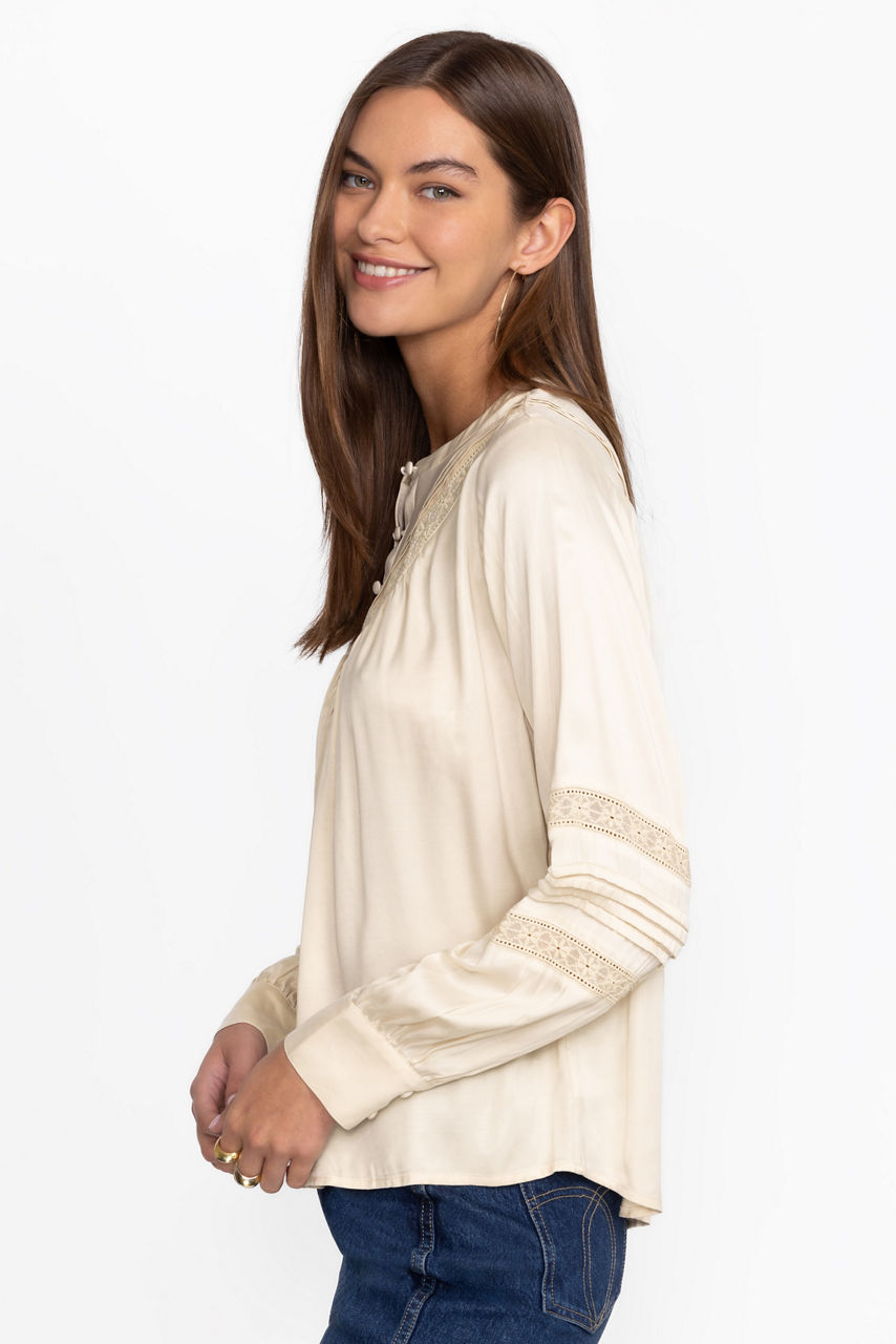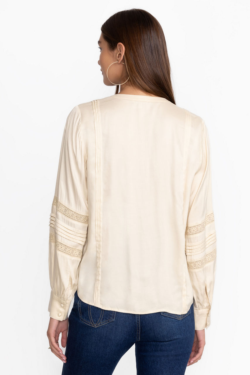 Crafted from a lightweight breathable fabric, the Pleated Button Down Top with Shirring is accented with striking contrasting elements. Featuring a mandarin collar with a fabric covered button-front, this top is finished with an intricately detailed yoke and gently puffed sleeves. Pair with relaxed-fit denim and leather flats for an elevated casual look.