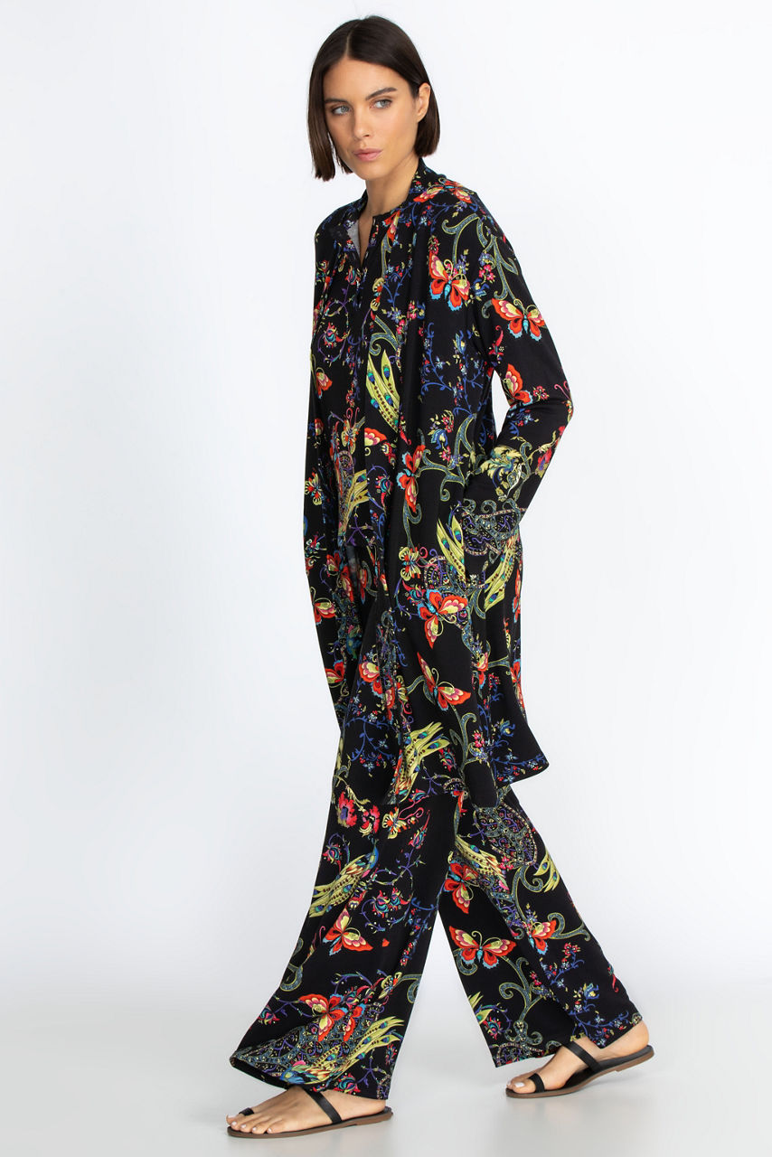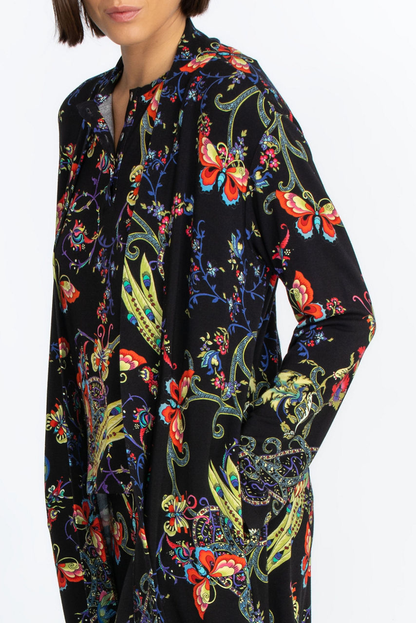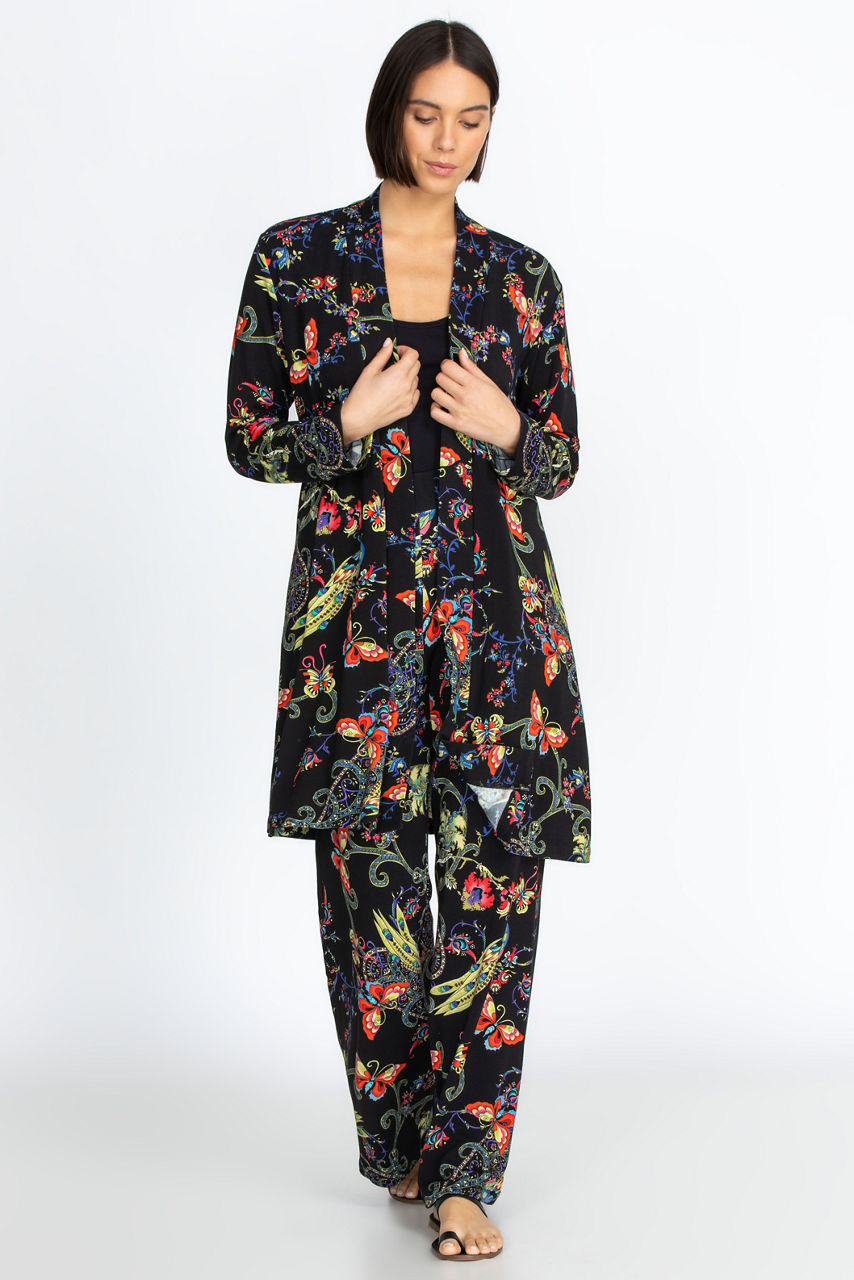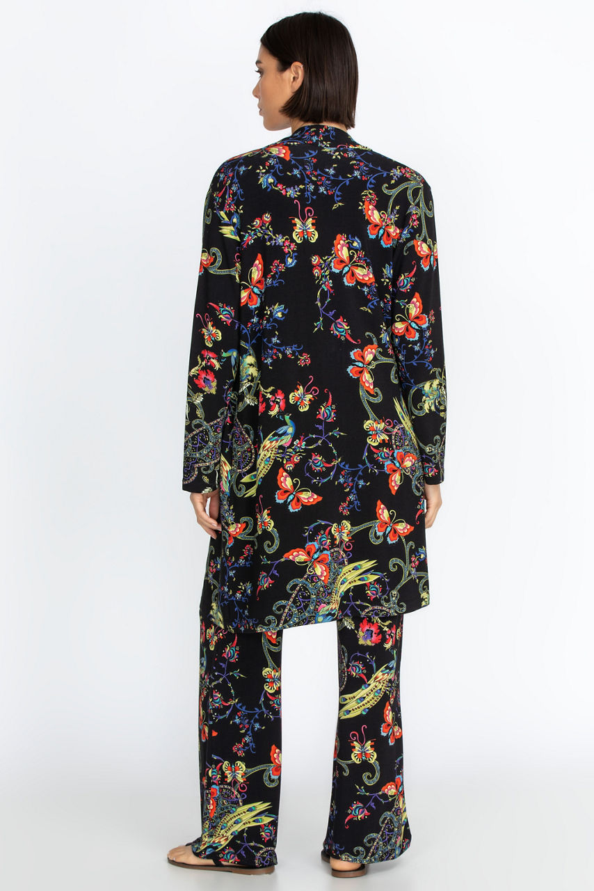 Elegant with a laid-back attitude, the Pottery Duster is a chic take on warm-weather outerwear. This duster is made from bamboo with a hint of stretch and is brough to life with a fluttering butterfly, floral pattern in a rich color scheme. Finished with an open front and shawl collar, this duster can be paired with trousers for a feminine day-to-night look.