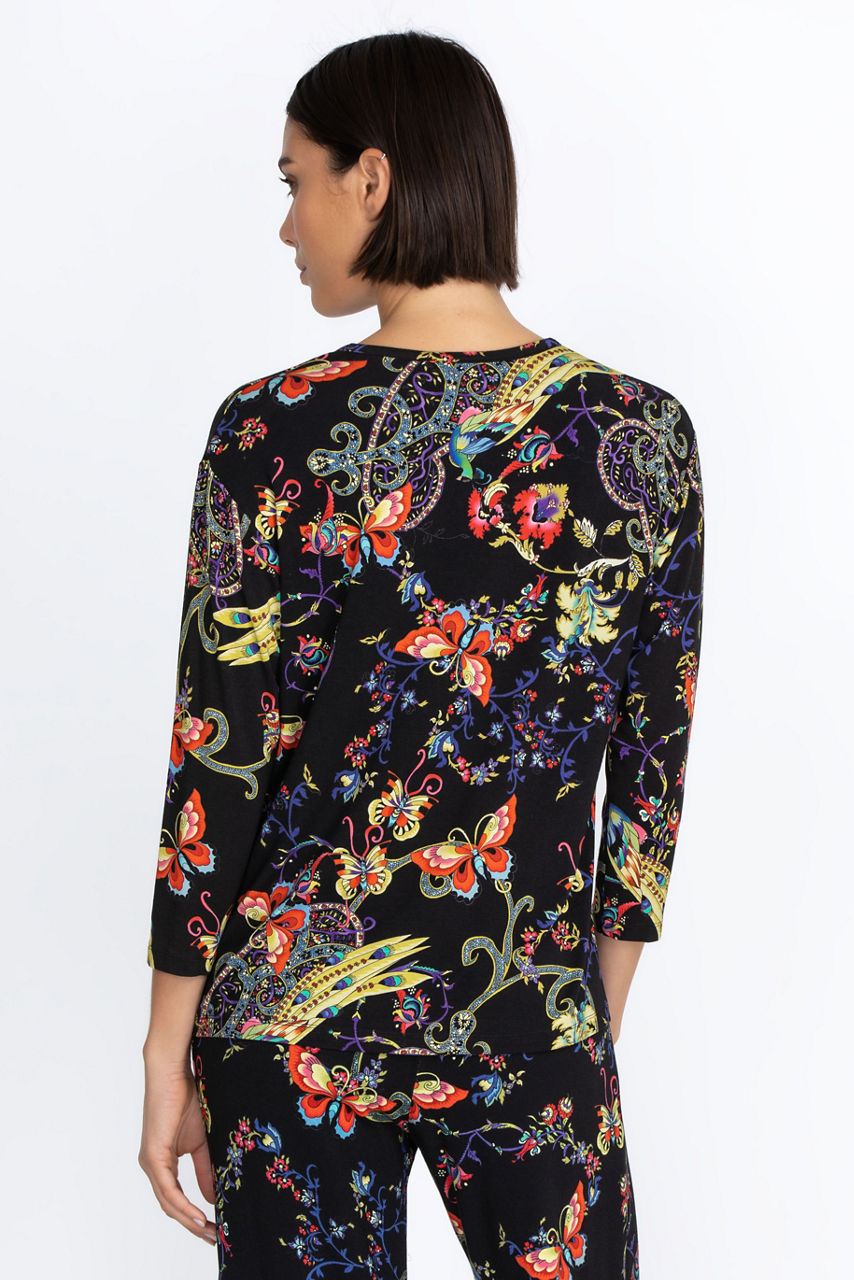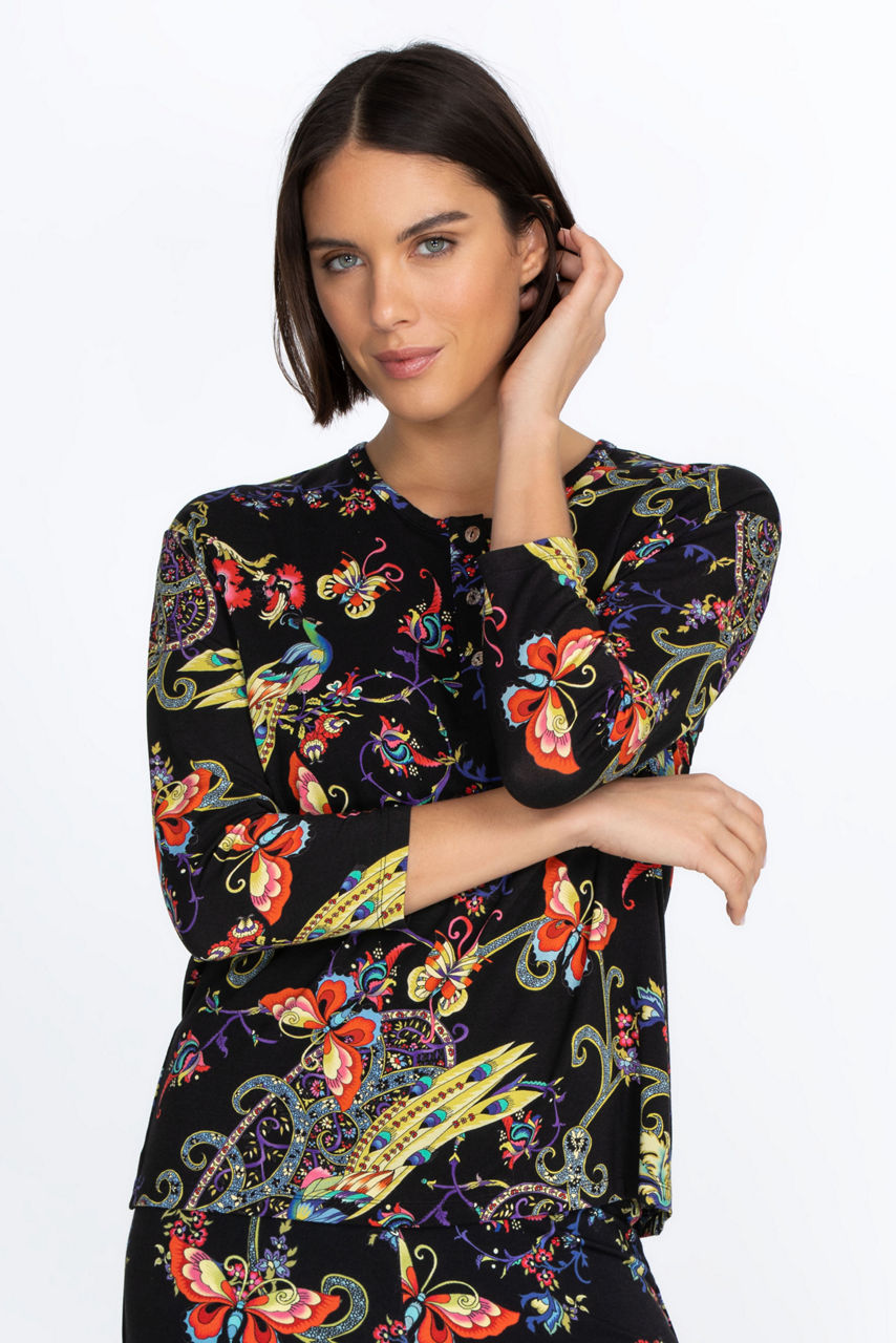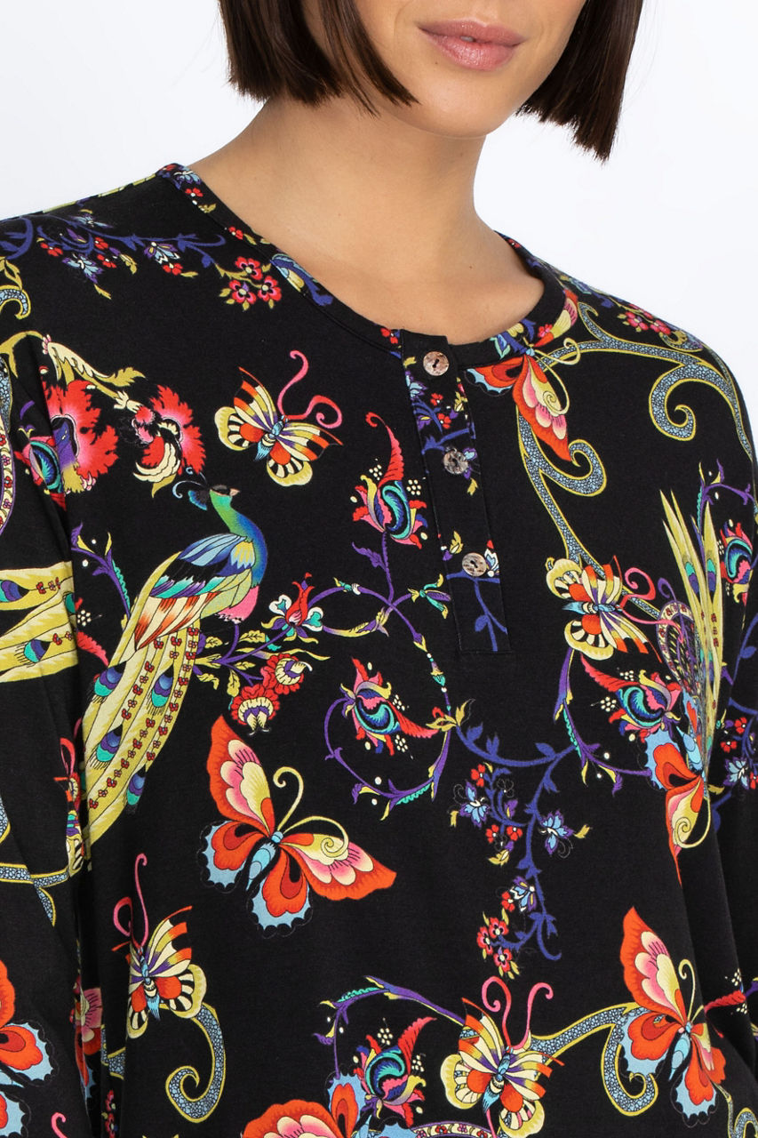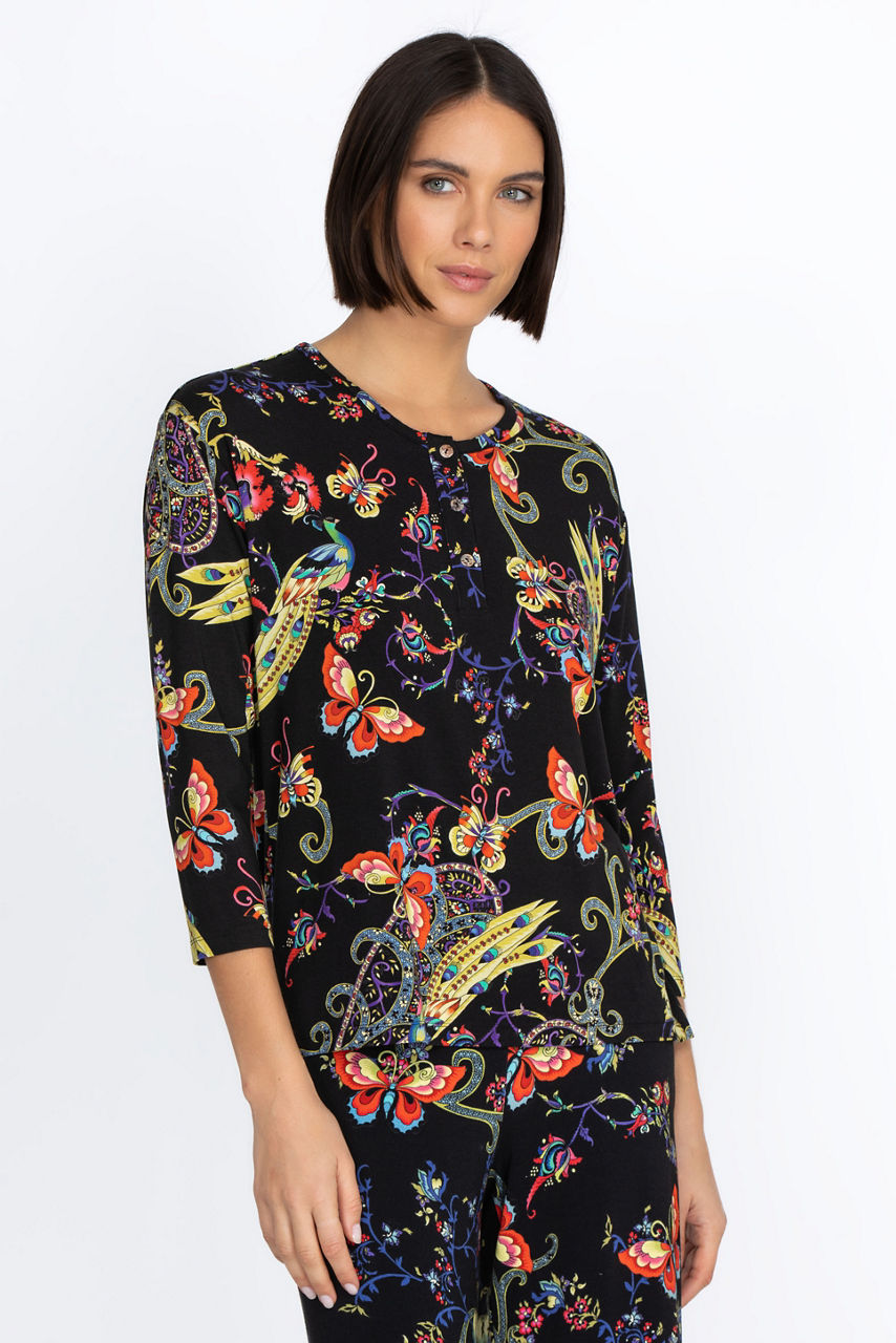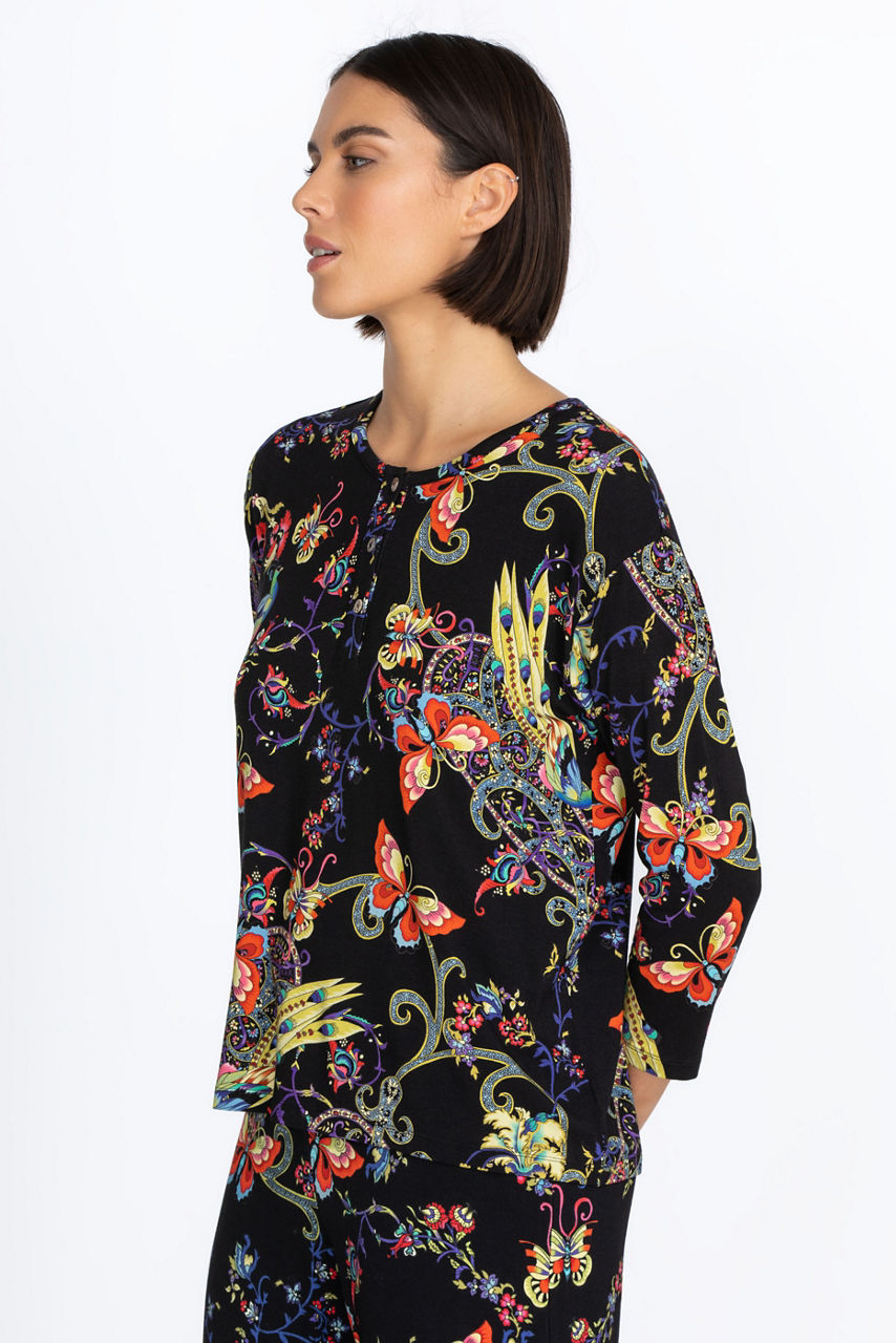 Embodying an eclectic charm, the Pottery Henley Tee combines a wistful touch with a vibrant color palette. An everyday silhouette, this tee is made from rayon with a hint of stretch and is enhanced by a bold butterfly and floral motif. Style it with denim for a casual daytime ensemble or pair with printed pants for a statement look.