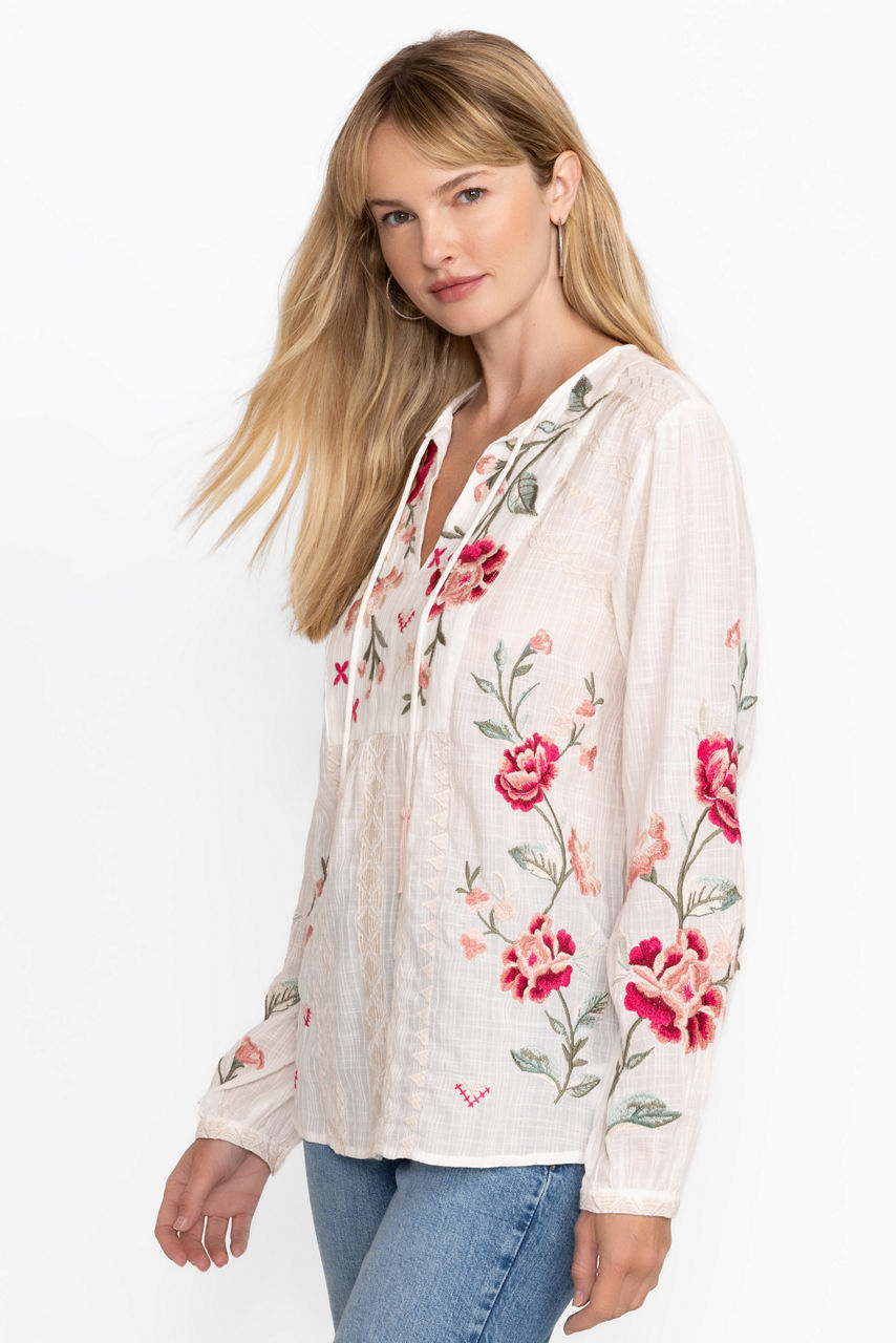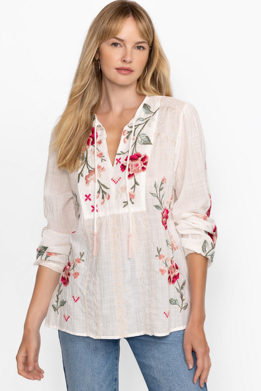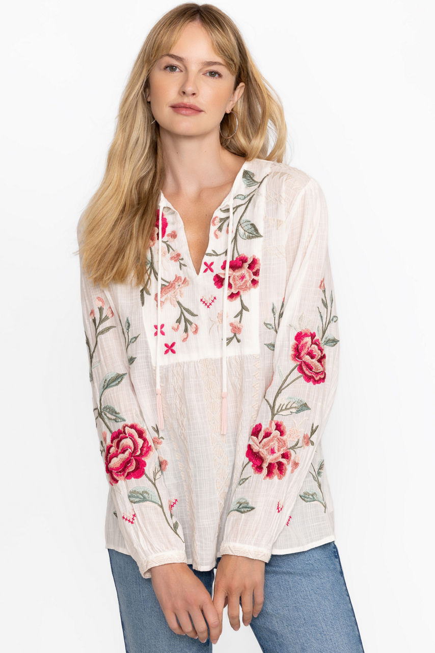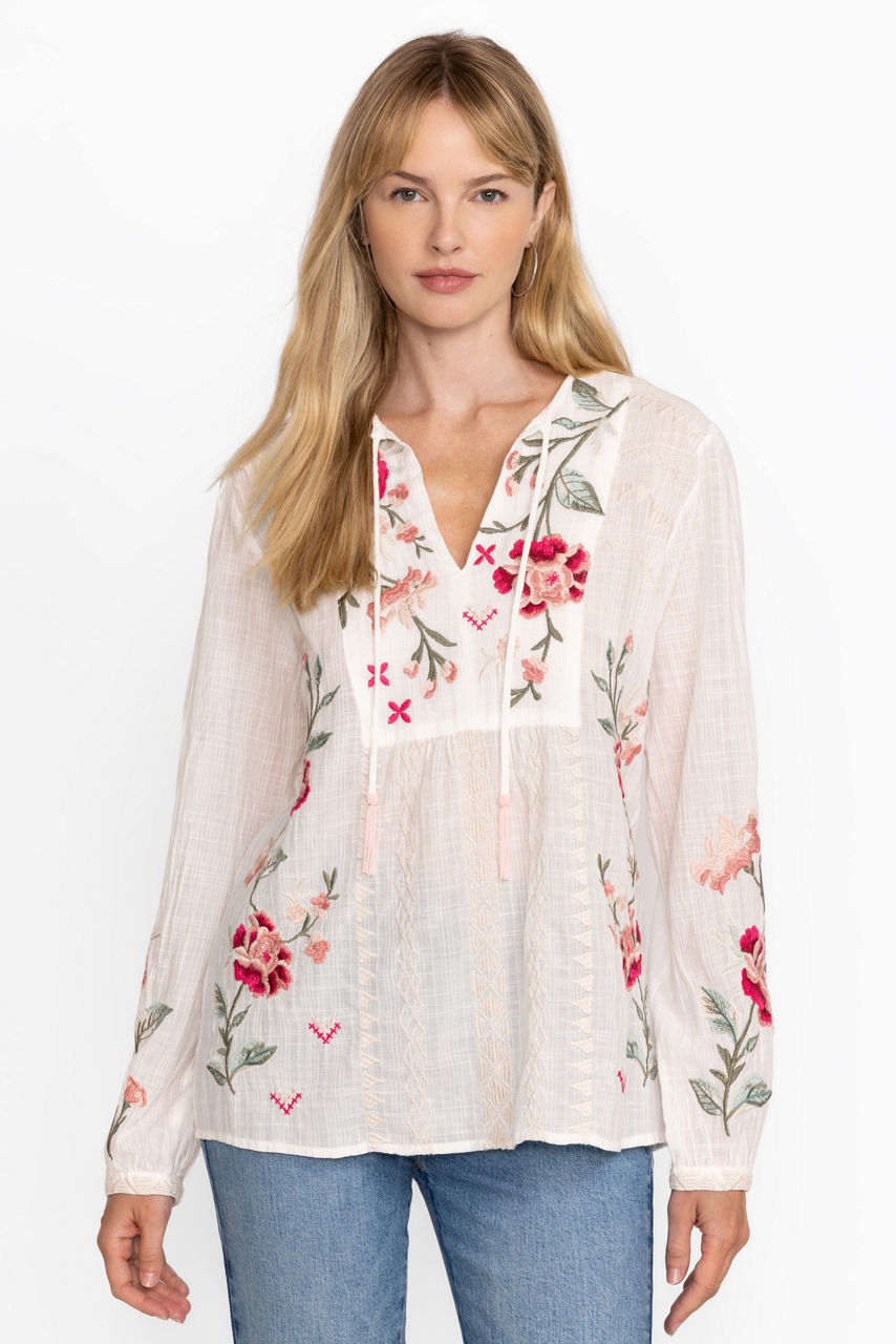 The Erinn Prairie Blouse offers a distinctly feminine silhouette crafted from a unique cotton blend. Featuring a split V-neckline with ties and beaded tassels, this intricately embroidered top is finished with gathers at the bodice and gently puffed sleeves with elastic cuffs. Pair with linen shorts and a trendy crossbody for a day of sightseeing.