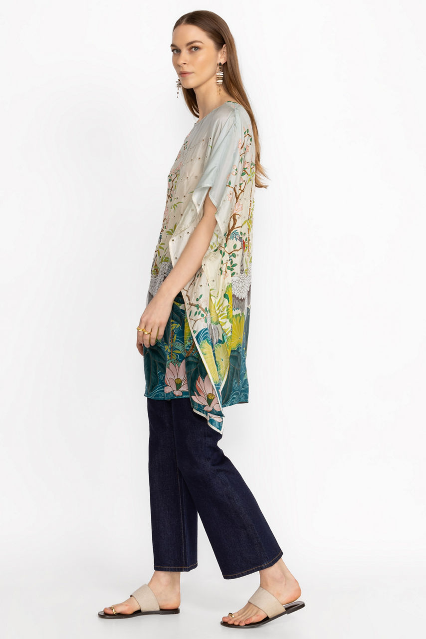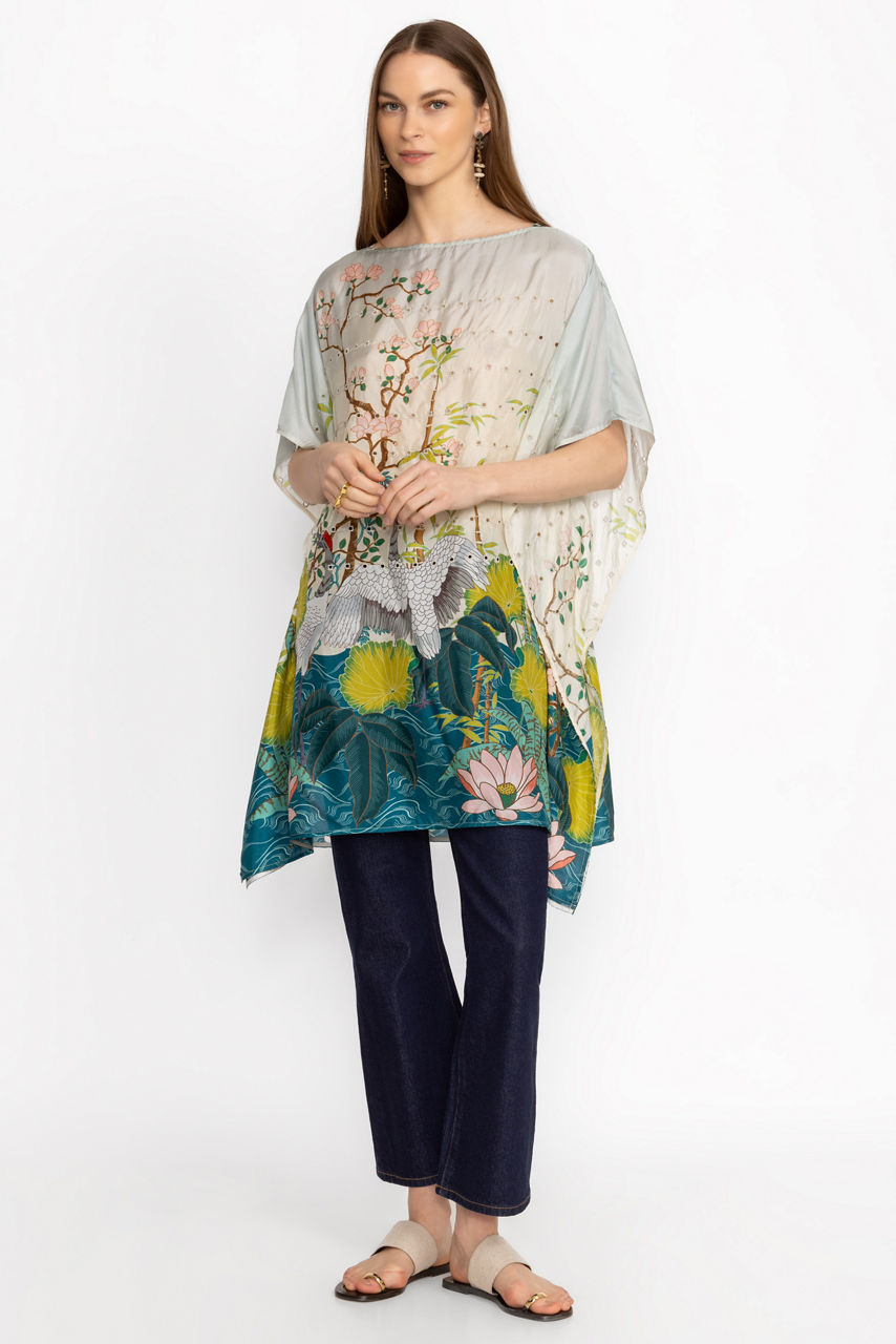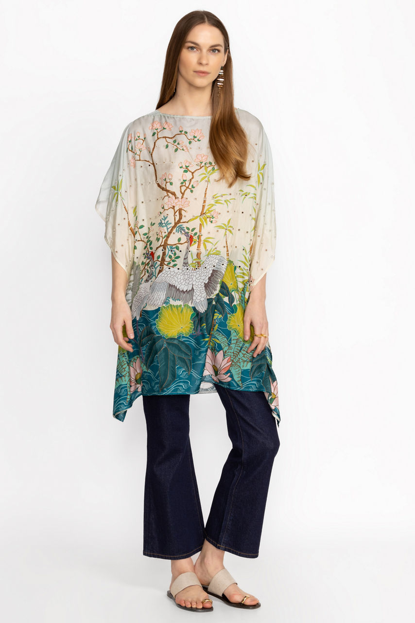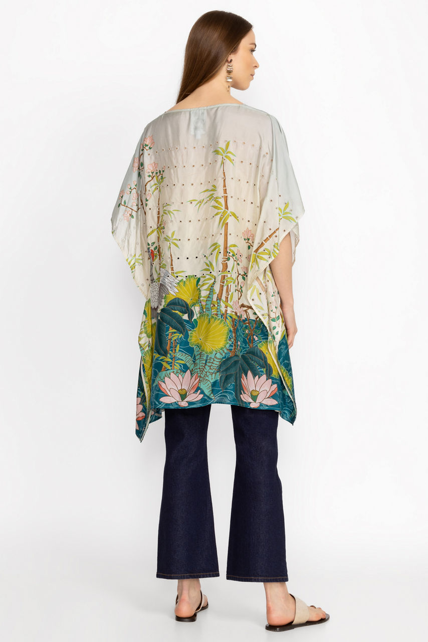 Adorned with a vibrant scenic pattern, the Pribasa Eyelet Poncho is the height of classic elegance. Crafted from 100% flowing silk and featuring eyelet detailing throughout, this tunic length poncho offers a gently rounded neckline and relaxed dolman sleeves. Pair with fitted pants and add glittering gold accessories for a polished timeless look.