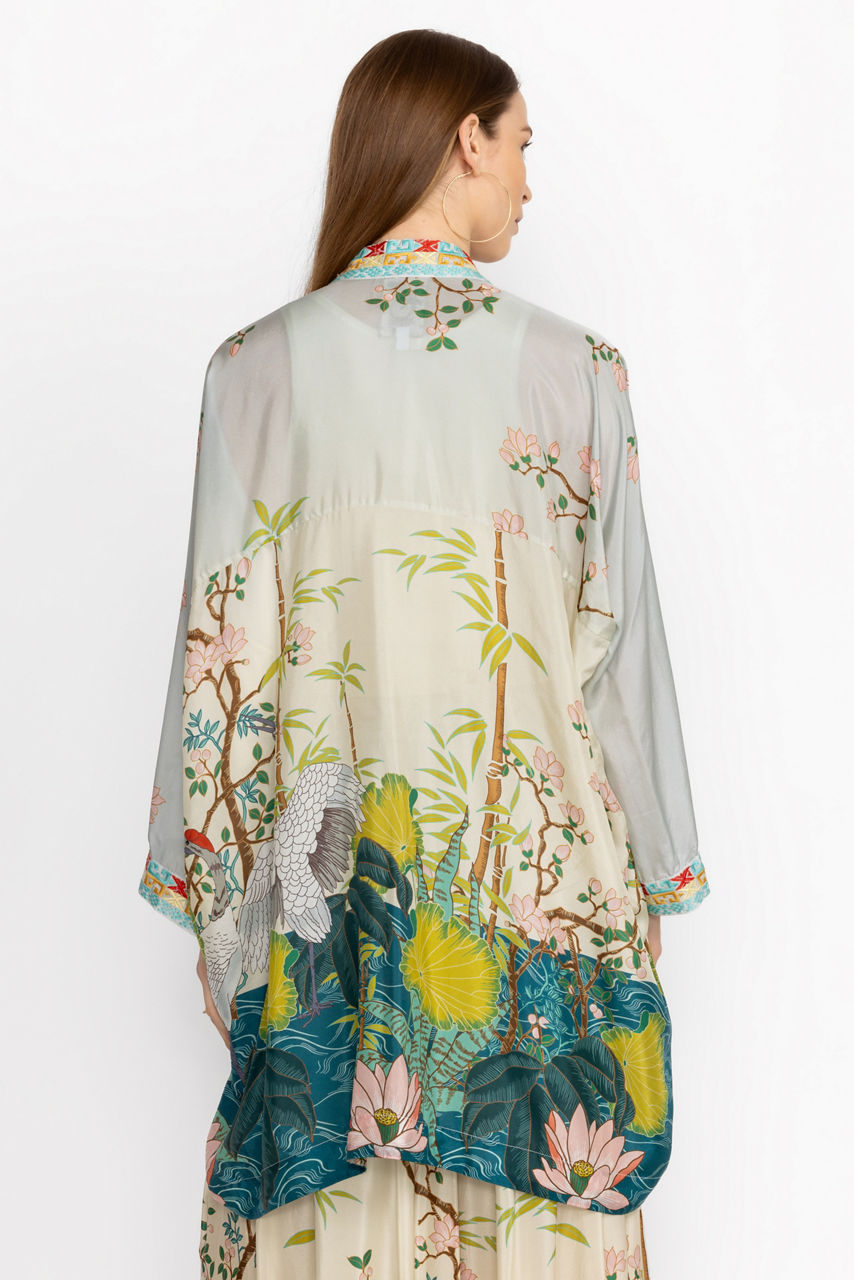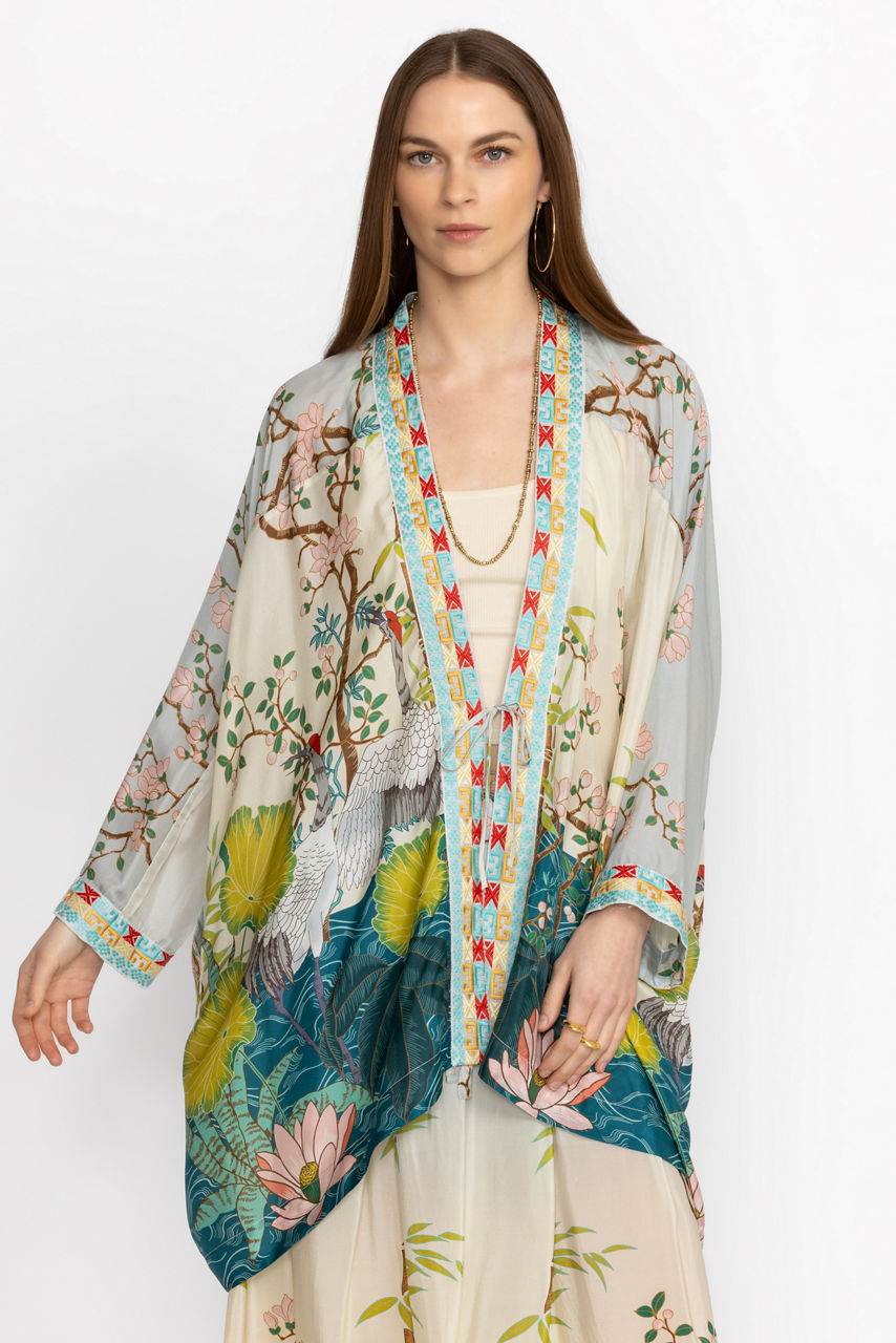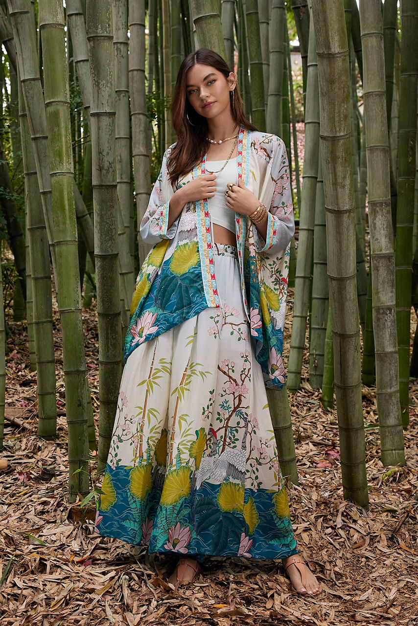 Taking inspiration from a traditional kimono, the Pribasa Shae Kimono features a serene scenic print and unique cut. Crafted from 100% silk, this eye-catching kimono features a contrasting trim at the neckline, raglan sleeves and a tie closure at the front. Pair with a neutral silk cami and fitted pants to allow this kimono to take center stage.