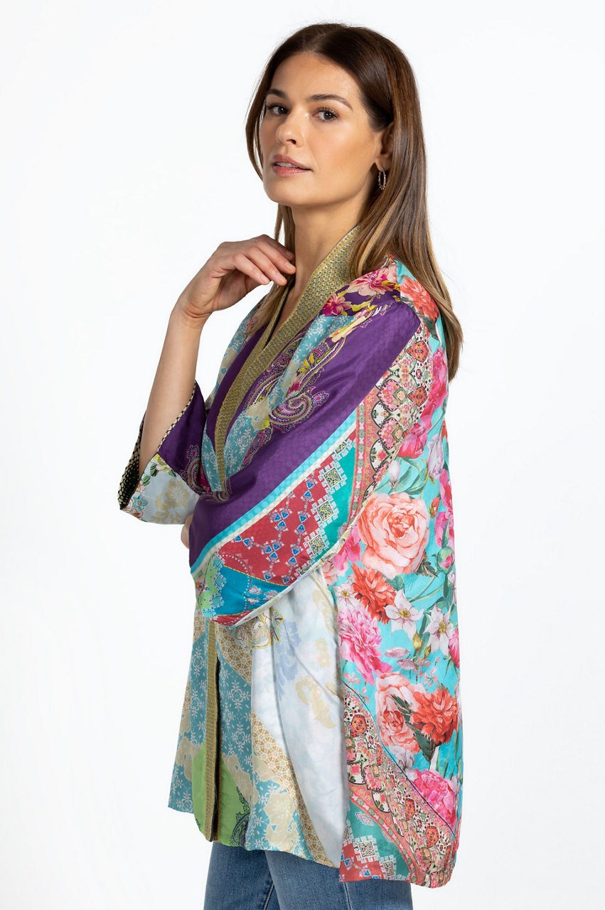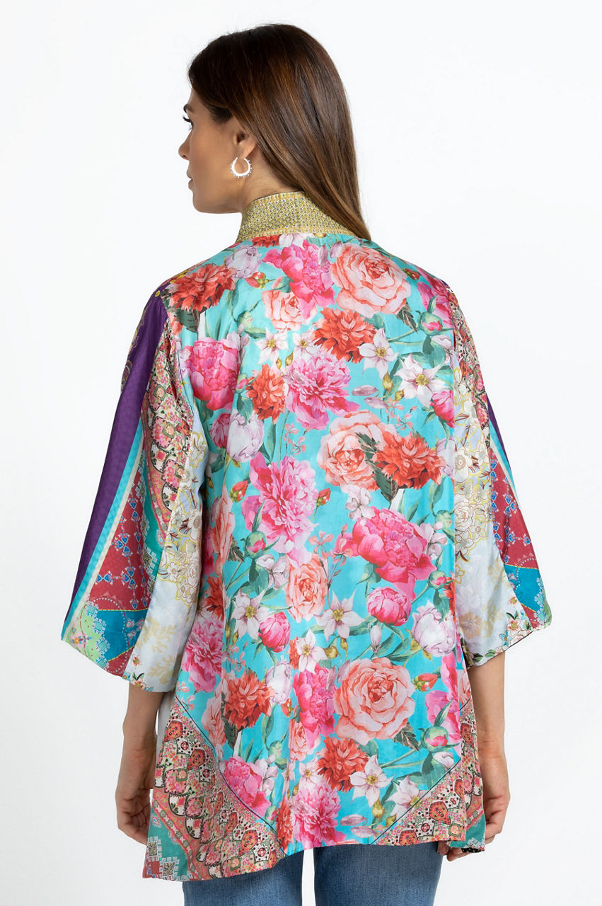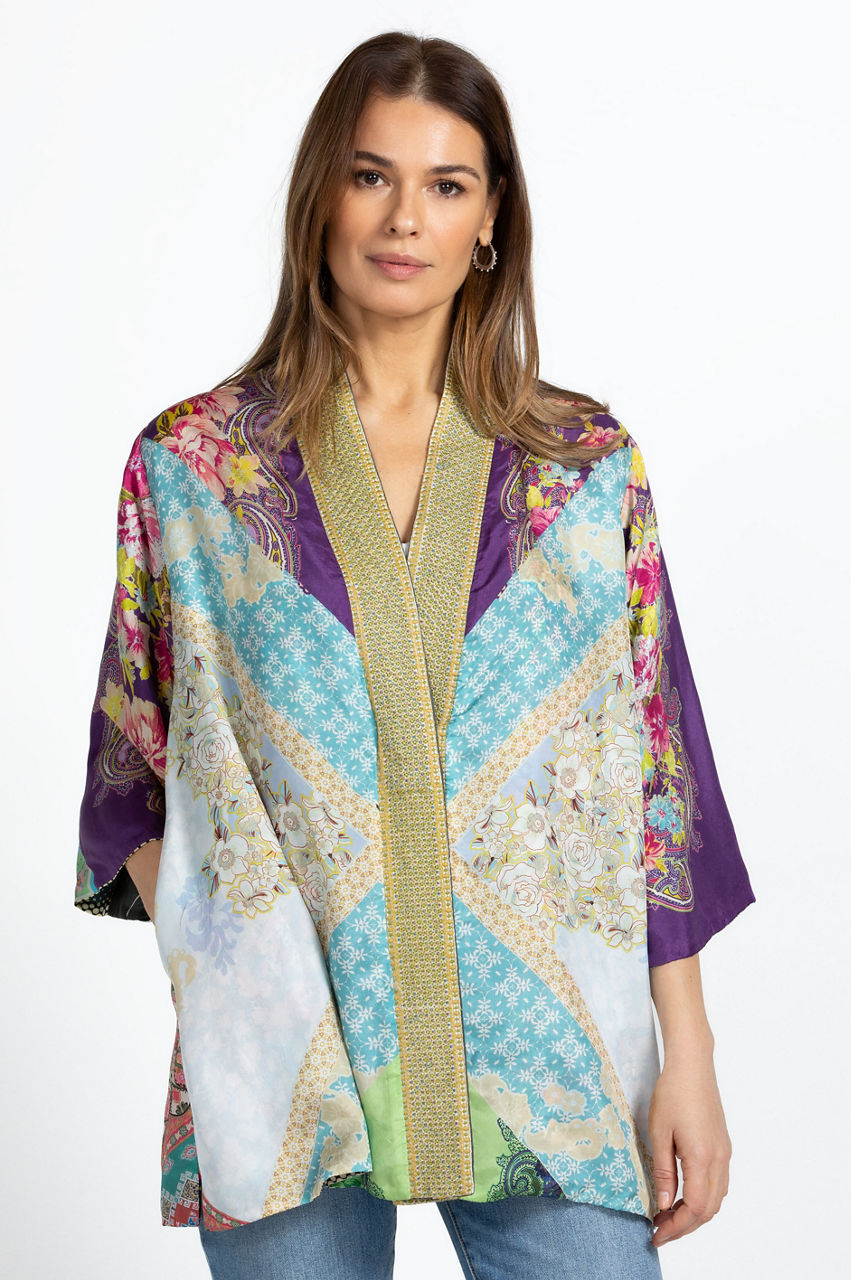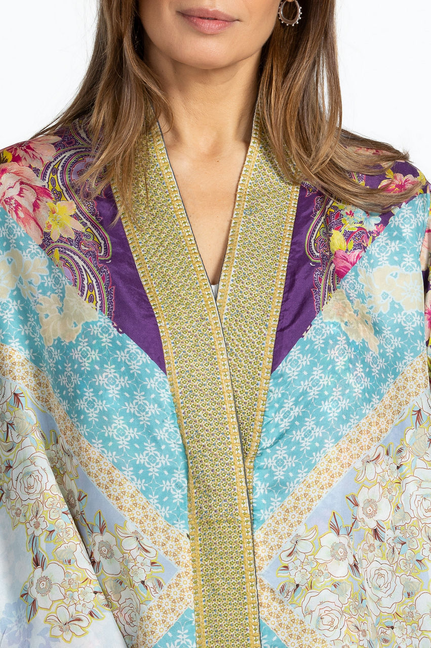 The Prisma Yena Kimono is emphasized by captivating multicolored florals and printed edges, which sit atop a black background. Spun from smooth silk, this kimono is designed with an open front, long sleeves, and a reversible side with an additional vibrant print. Style this kimono with a dress for a chic evening look or pair with jeans to elevate your day-to-day outfits.