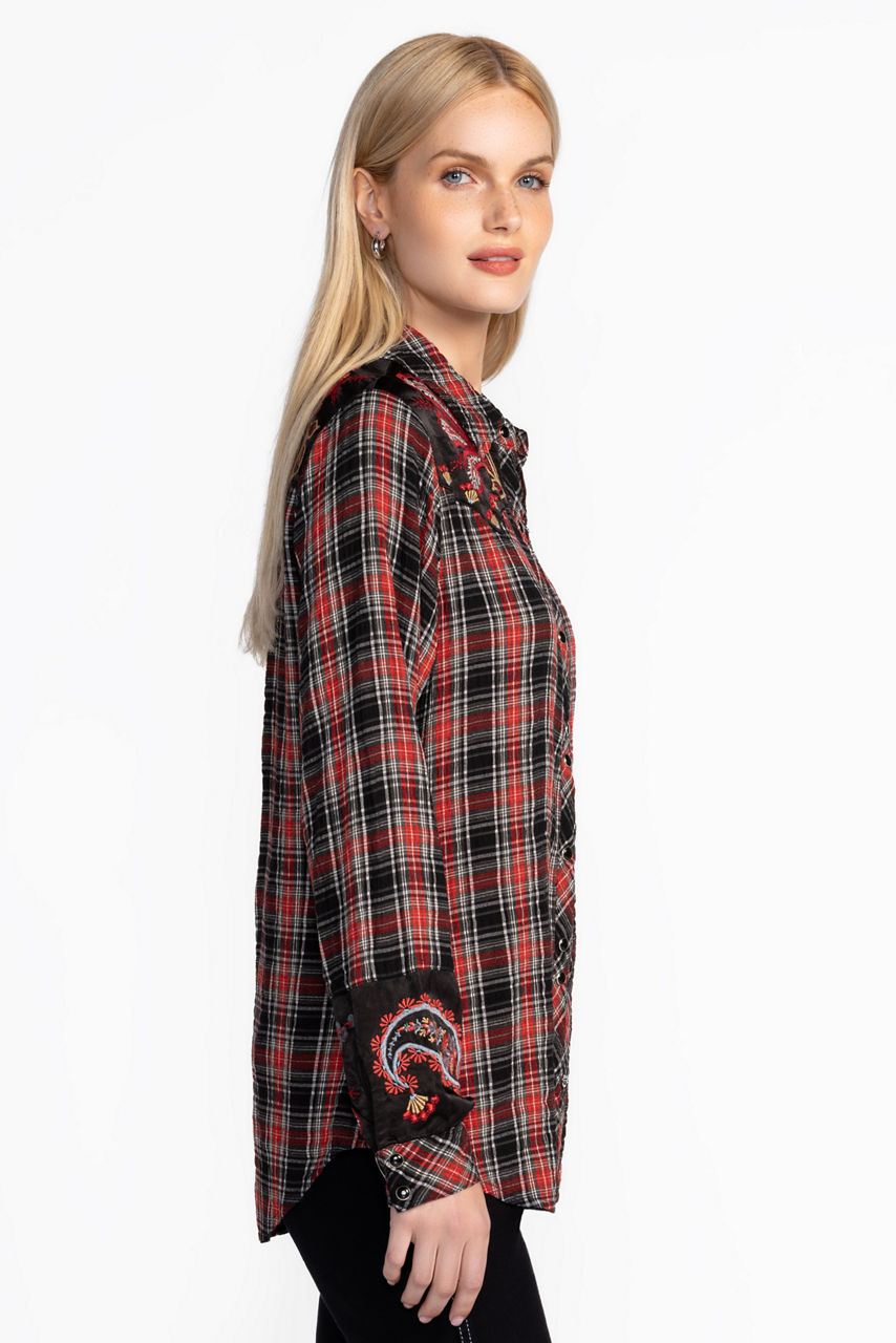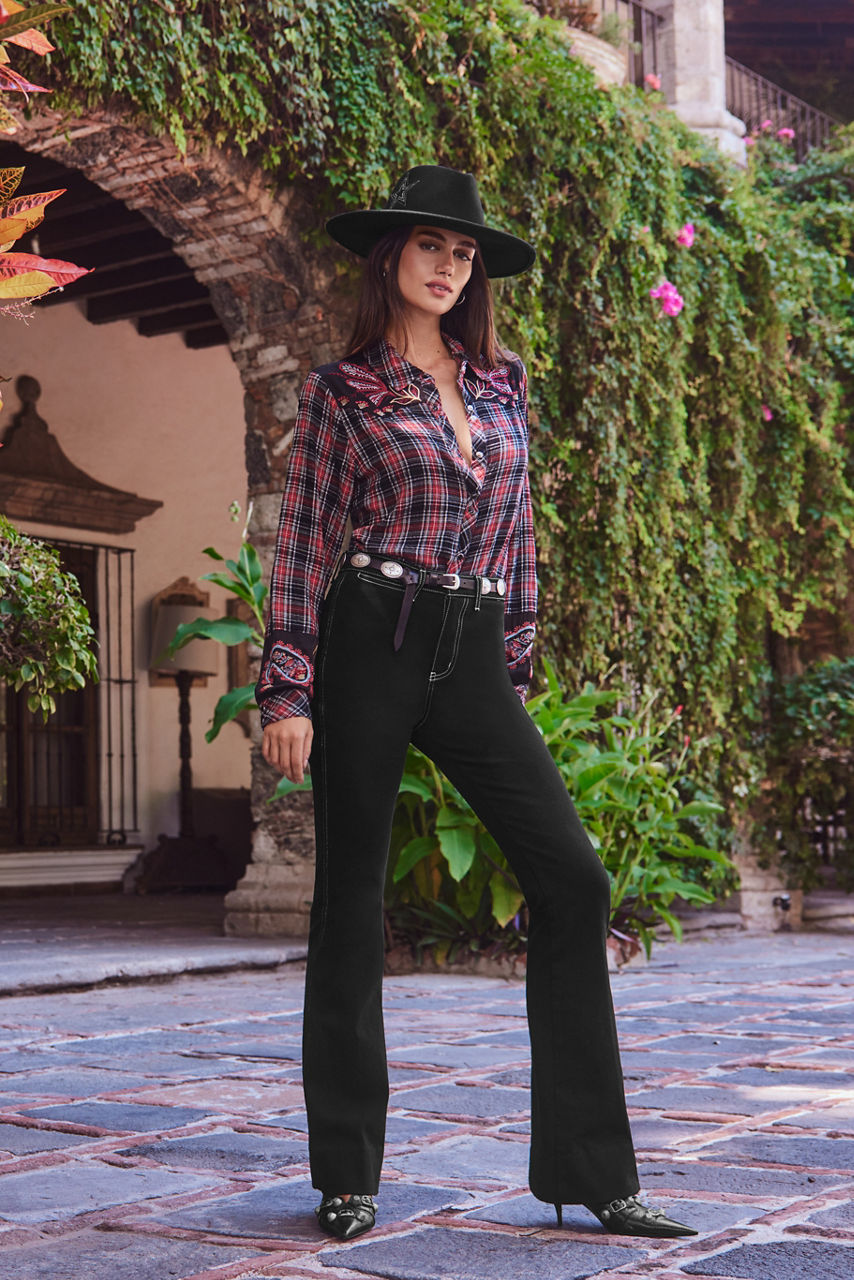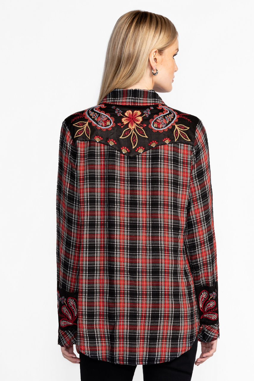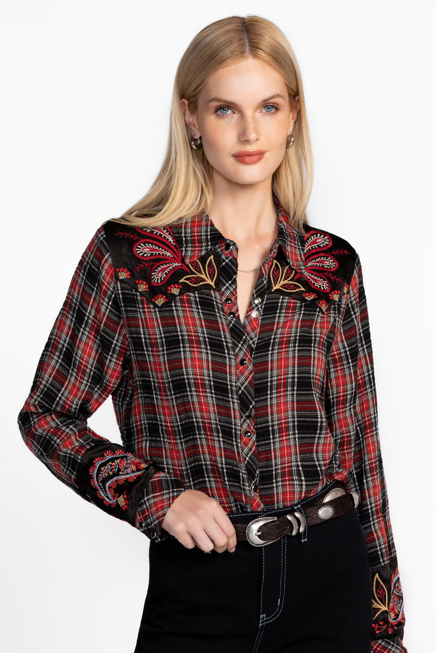 Adorned with a bold combination of plaid and fresh florals, the Sezana Puff Sleeve Western Shirt offers a fresh take on traditional western styling. Featuring a classic yoke embellished with intricate placement embroidered detailing, this plaid button-front shirt is finished with puffed Bishop sleeves. Pair with black denim and boots for a fun night out.