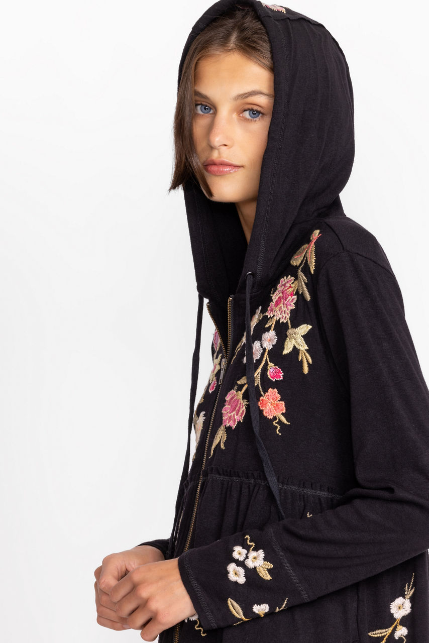 A feminine take on a classic athletic hoodie, the Quinn Cozy Tiered Hoodie adds a unique silhouette. Featuring a zipper front and attached hood, this upgraded layering piece features a flowing tiered bodice and colorful placement embroidery for a distinctly feminine look. Pair with leggings and fashion sneakers for an upgraded weekend look.