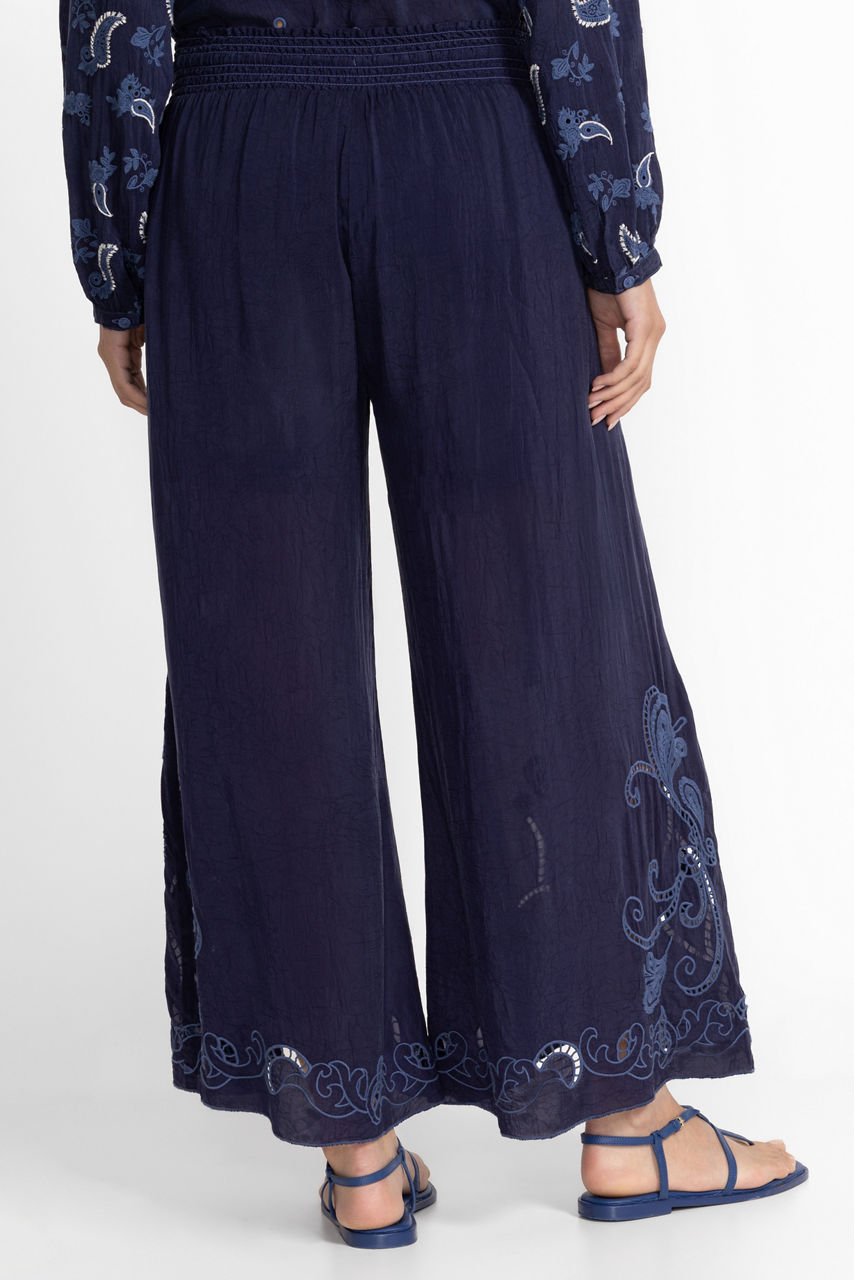 The Rachel Pants are crafted from a lightweight flowing fabric and embellished with intricate tone-on-tone embroidered details. Featuring an elastic waist with a drawstring for a customizable fit, these relaxed-fit pants are finished with slip pockets and a unique scalloped hemline. Pair with a delicate silk cami and strappy sandals for a vacation-inspired girls' night out look.