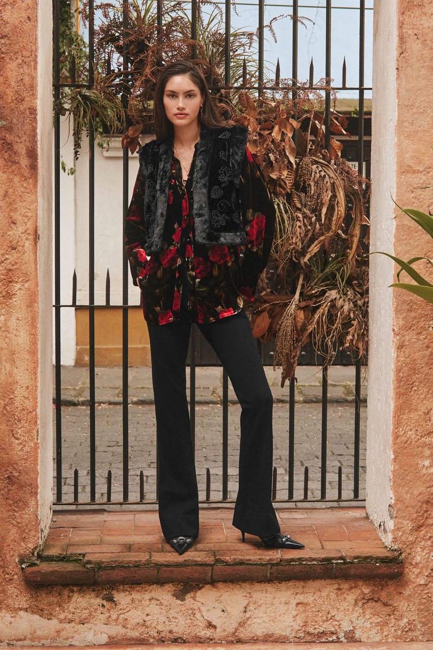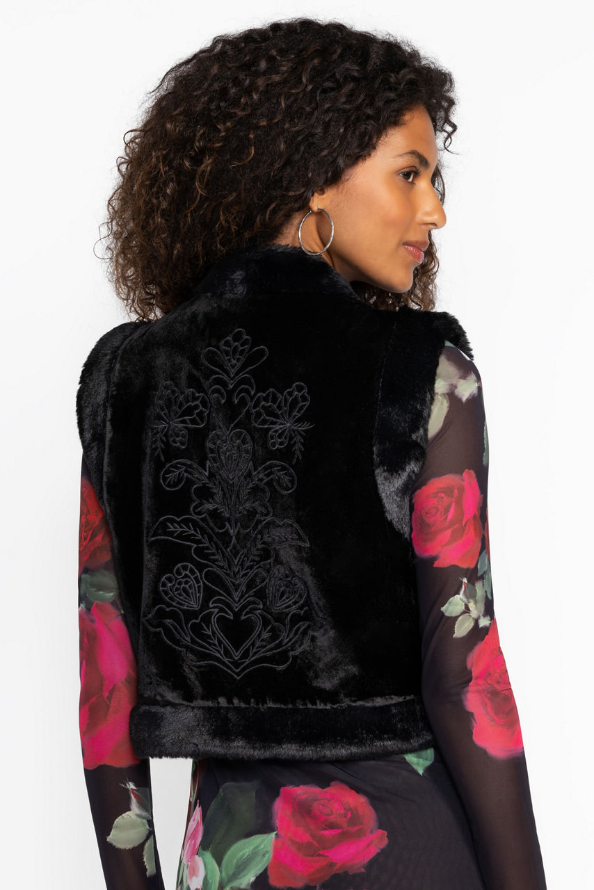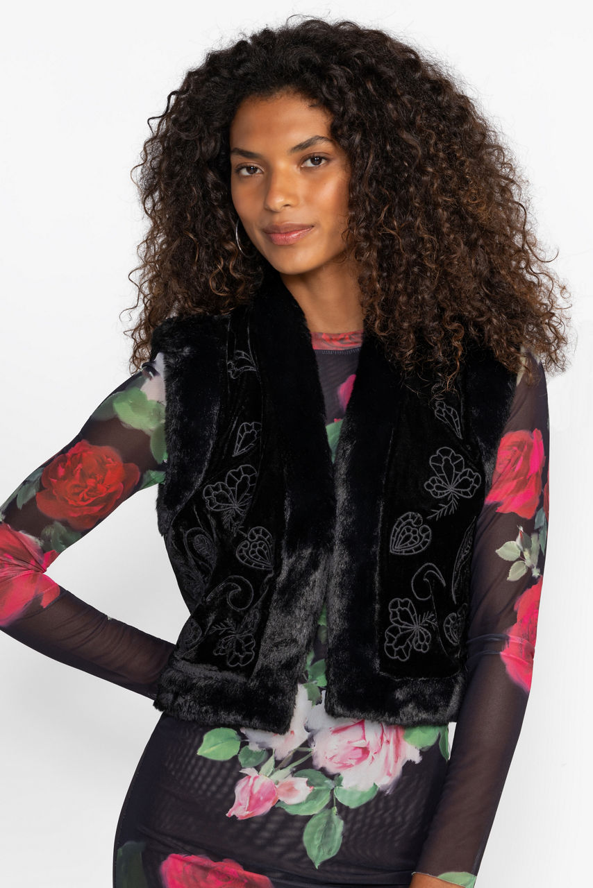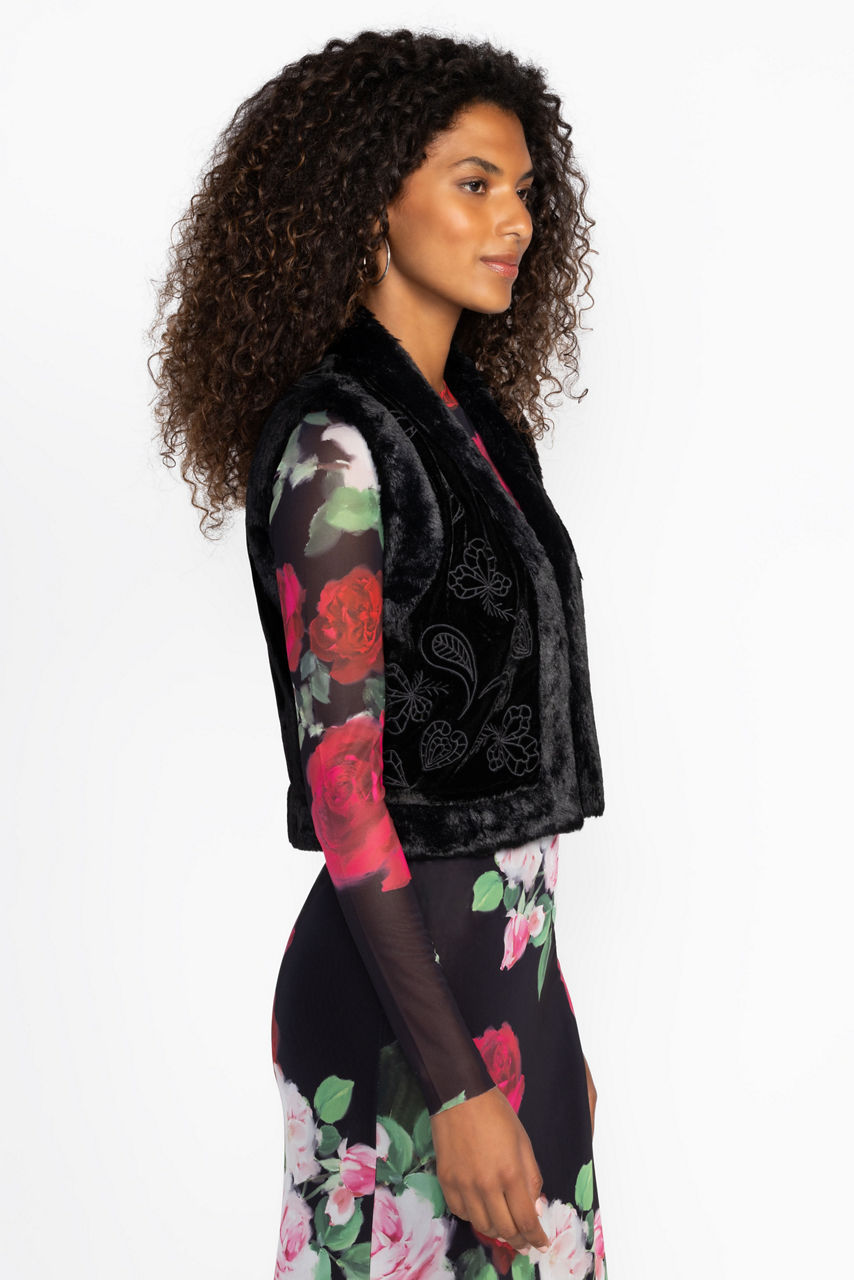 Thoughtfully crafted from a unique silk blend, the Rachella Vest creates texture and adds visual interest to your look. Embellished with intricate tone-on-tone embroidered detailing, and finished with a cozy fur-trim, this stunning vest is closed at the front with a traditional hook and eye closure. Layer over a turtleneck top and pair with relaxed denim for an elevated casual look.