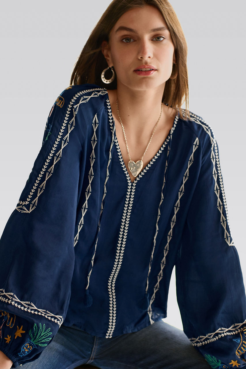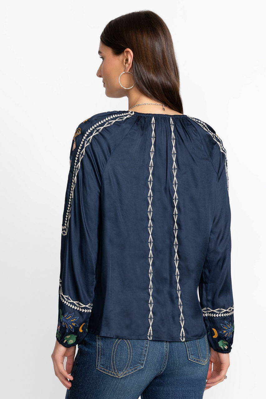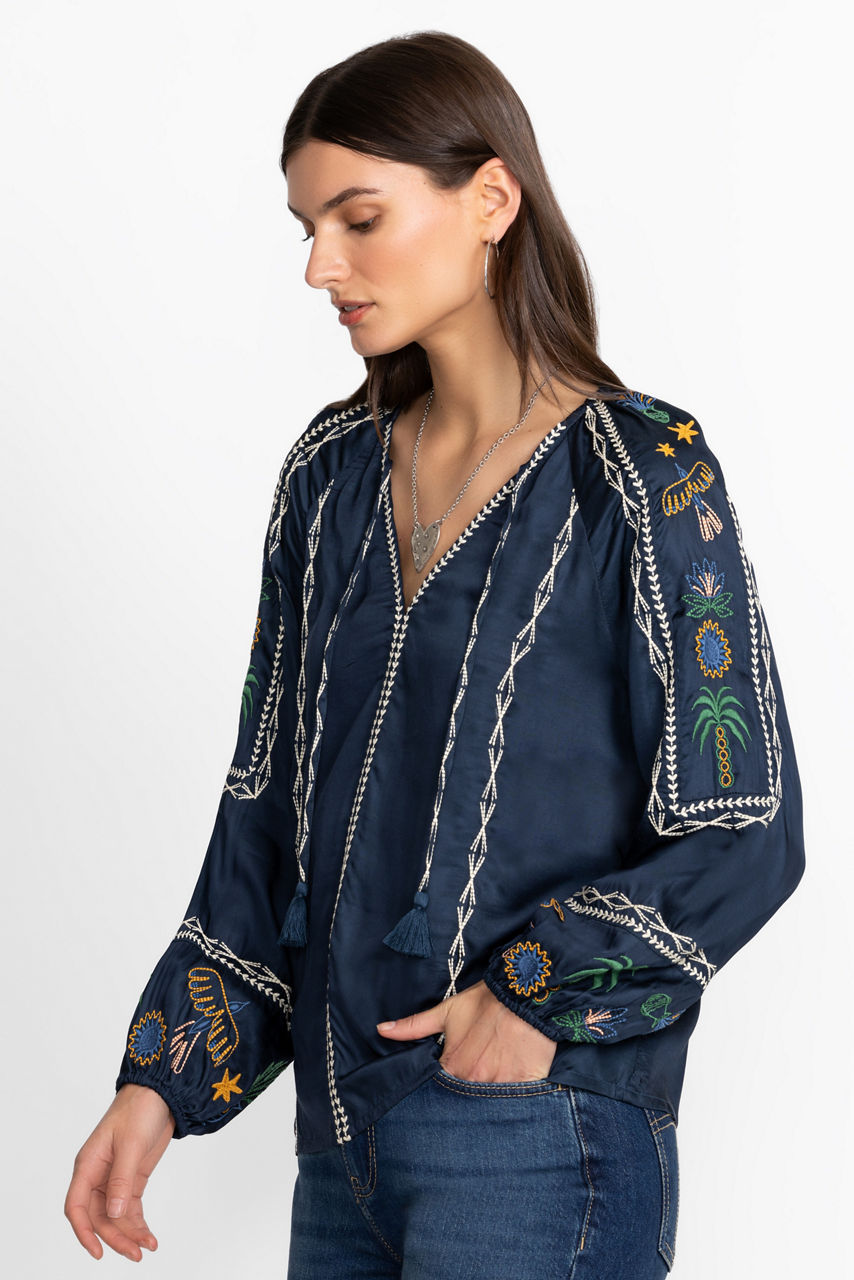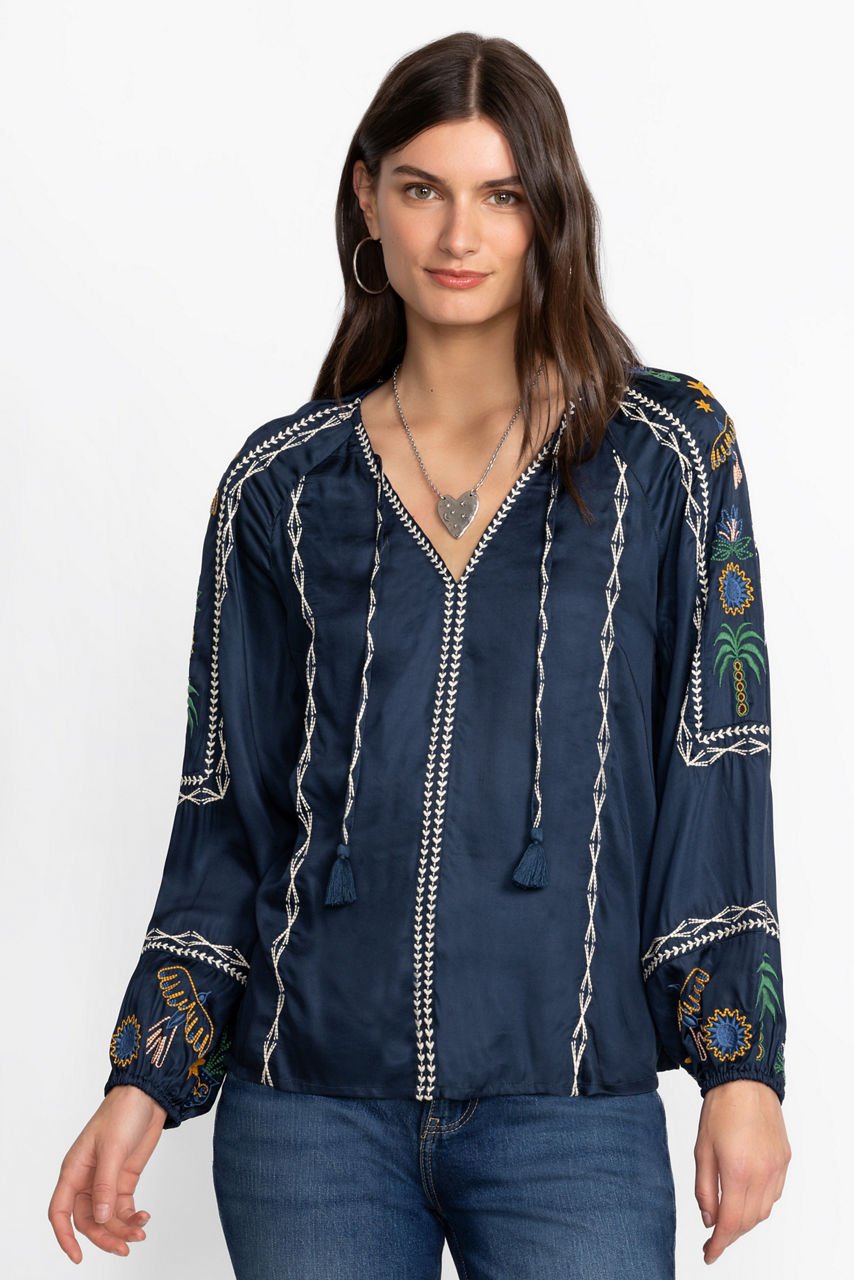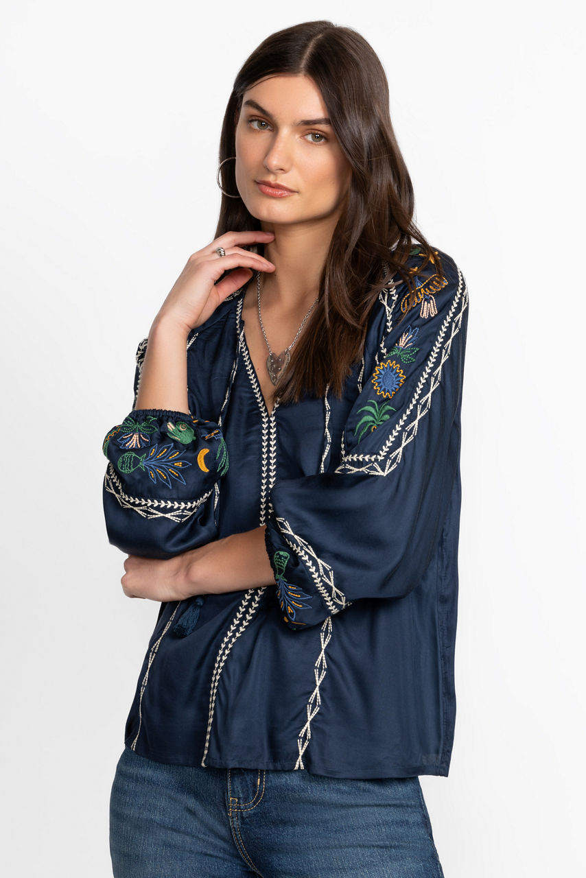 Embellished with intricate embroidered detailing and delicate lace trim, the Raelyn Raglan Blouse creates an elevated casual style in a casual silhouette. Crafted with a V-neckline accented with delicate ties, this Raglan top is finished with gently puffed Bishop sleeves. Pair with twill pants and posh flats for a polished weekend look.