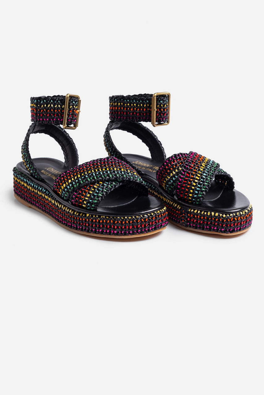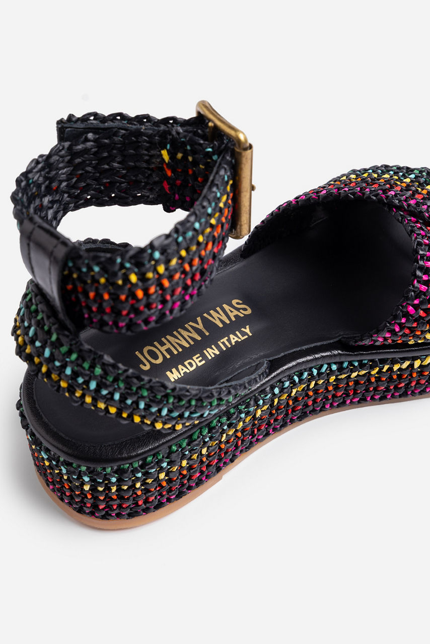 Infused with vibrant stripes of woven color, the Raffia Sandal perfectly combines comfort and unmistakable style. Crafted with crisscross straps at the ankles and toes, these platform sandals feature an adjustable ankle strap with a metal buckle detail. Pair with a classic tee and linen shorts for a fresh weekend look.