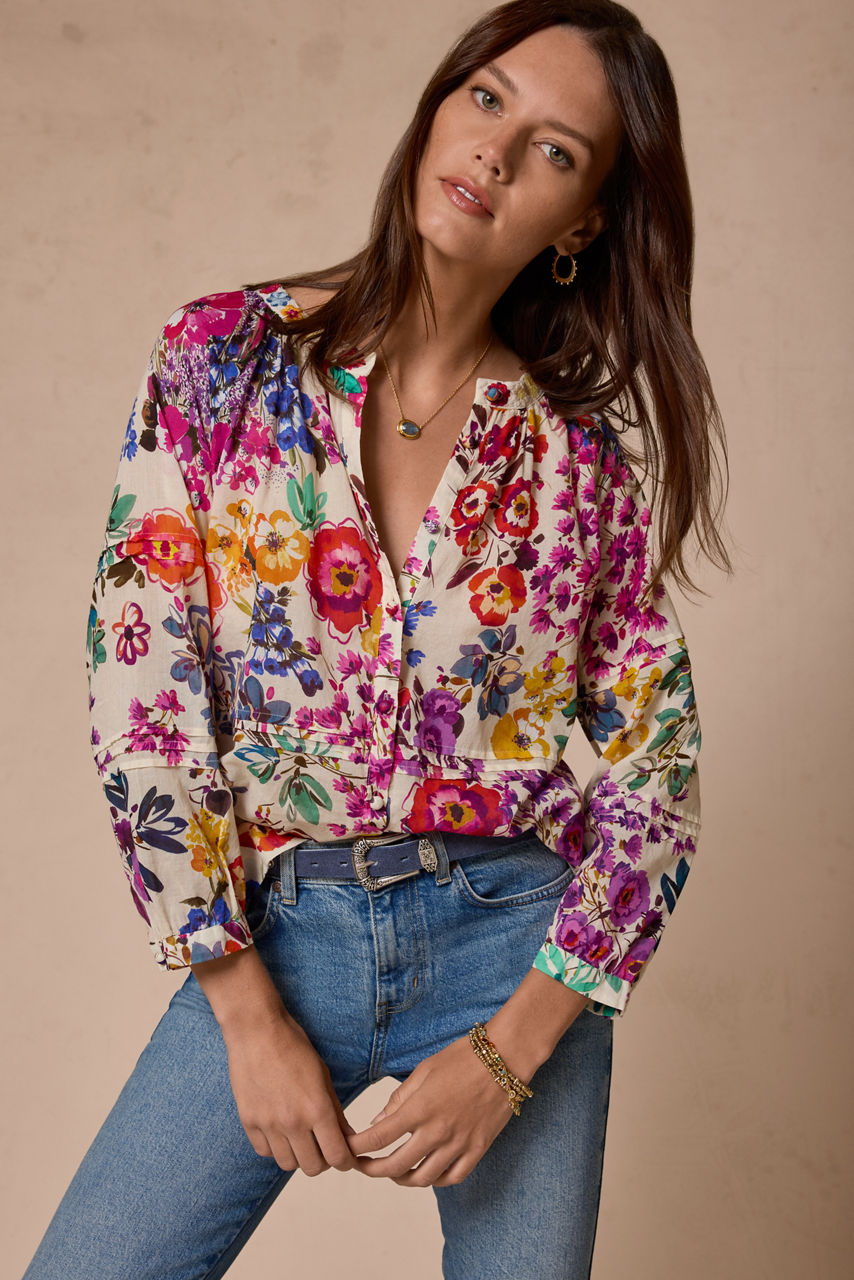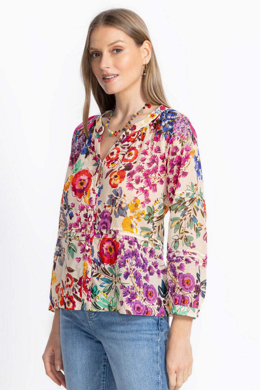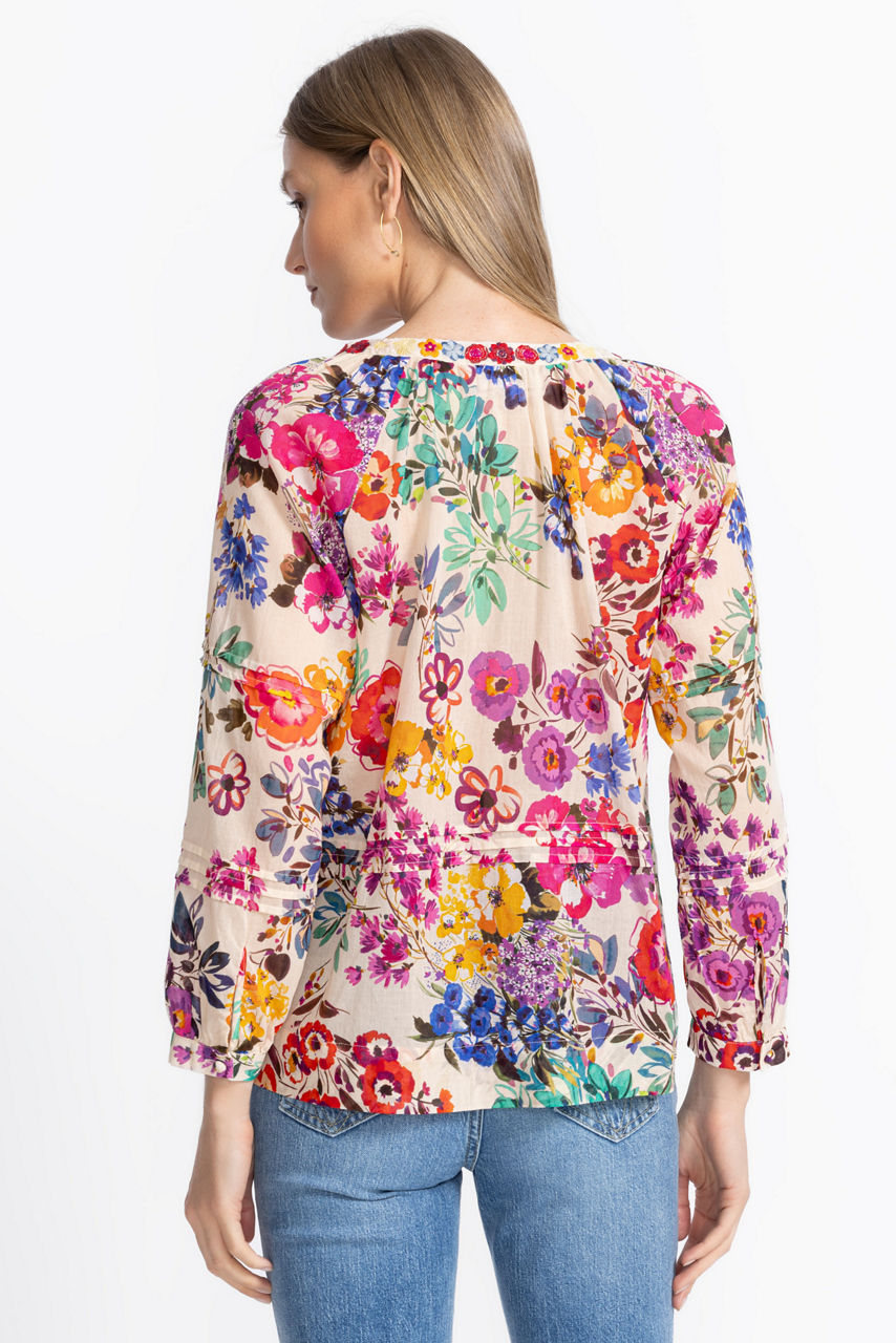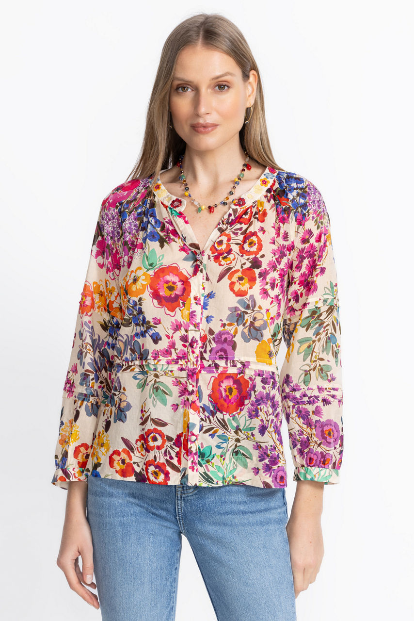 Beautifully adorned with bold colorful blooms, the Raglan Pintuck Blouse takes casual styling to the next level. Crafted from 100% breathable cotton, this stunning button-front blouse features a 3/4 sleeves with gathers and pintuck detailing throughout and is finished with intricate embroidered details for a polished finished look. Pair with a navy skirt and colorful kitten heels for a lovely brunch ensemble.