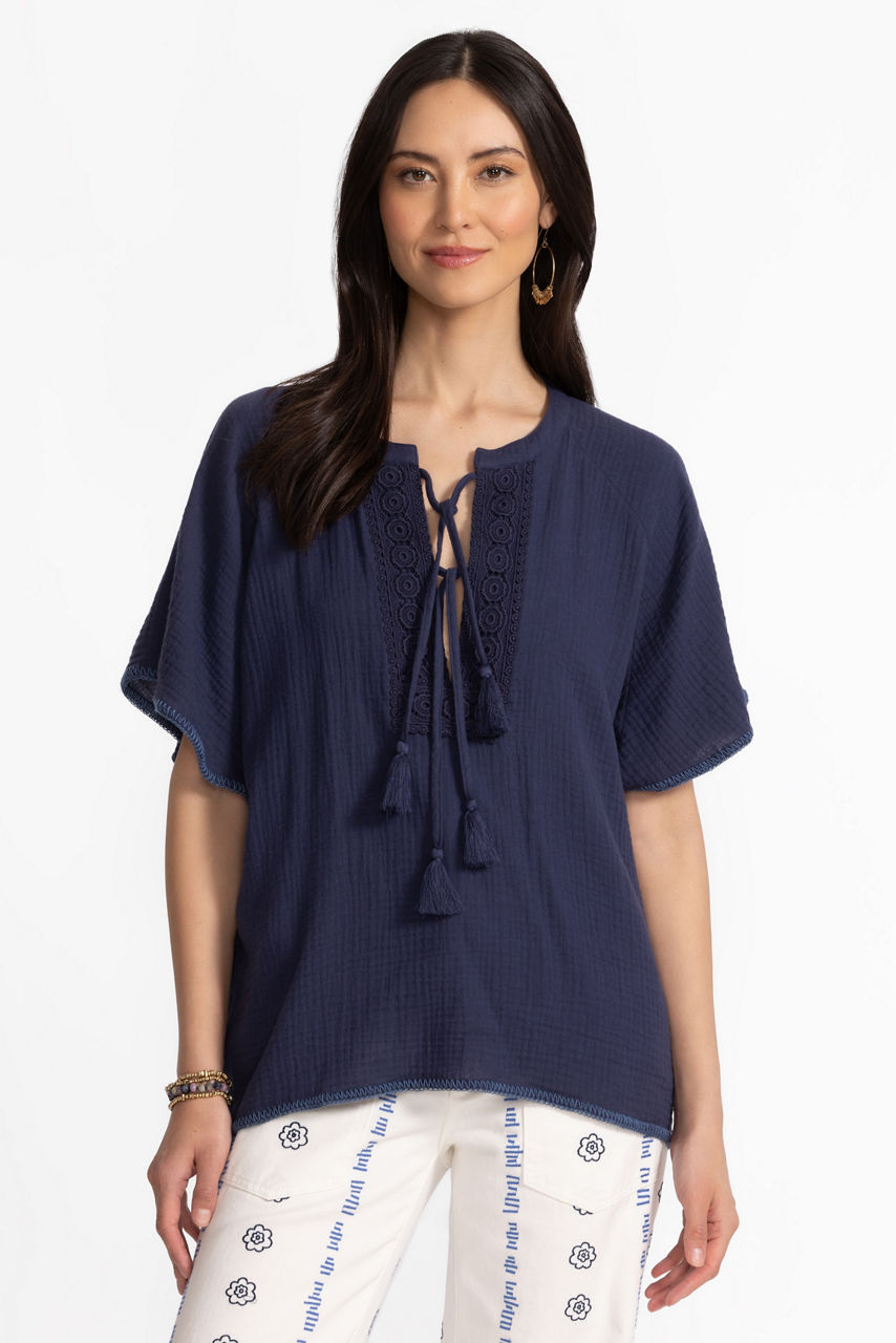 Crafted from 100% breathable cotton, the Raglan Poncho Top perfectly combines casual comfort and unmistakable style. Designed with a split V-neckline accented with a tassel tie laced through an intricate applique border, this poncho offers whipstitch blanket stitching along the hem and sleeves. Layer over swimwear and linen shorts for a polished surfside ensemble.