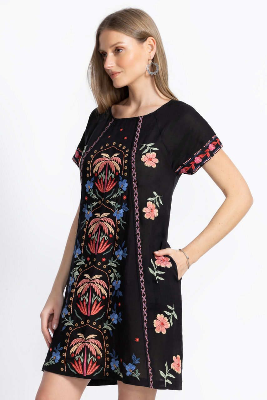 The Raglan Seamed Dress is embellished with a rich colorful pattern against a contrasting deep black backdrop. Featuring a rounded neckline with a keyhole back and Raglan sleeves, this ornate slip-lined dress is finished with stunning princess seams. Pair with kitten heels and a coordinating clutch for an evening out.