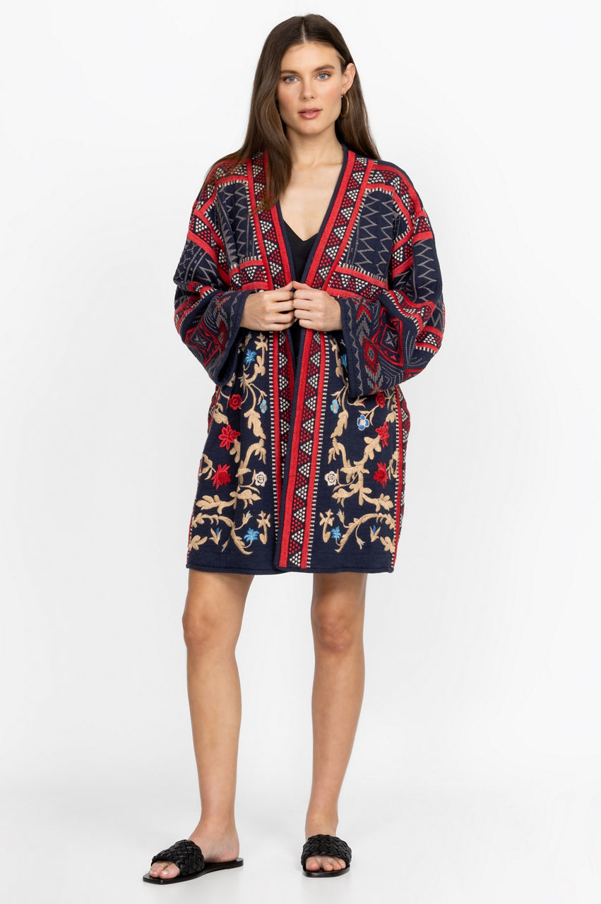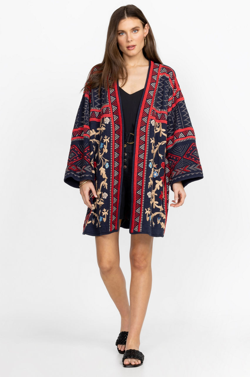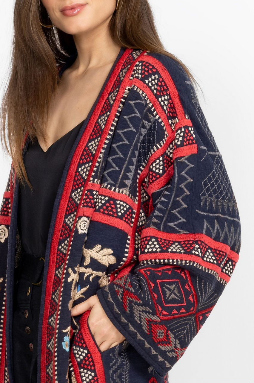 Designed from durable cotton, the Rahi Kimono makes a case for statement-making outerwear. Adopting a dark yet bold color scheme, this kimono features an open front, wide long sleeves, and a detailed placement embroidery comprising both simple and intricate patterns. Layer over a dress and pair with heels for a chic evening ensemble.