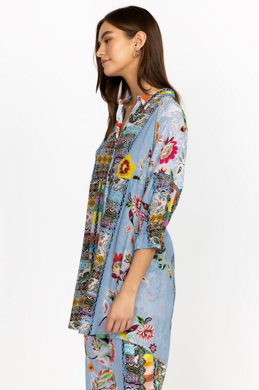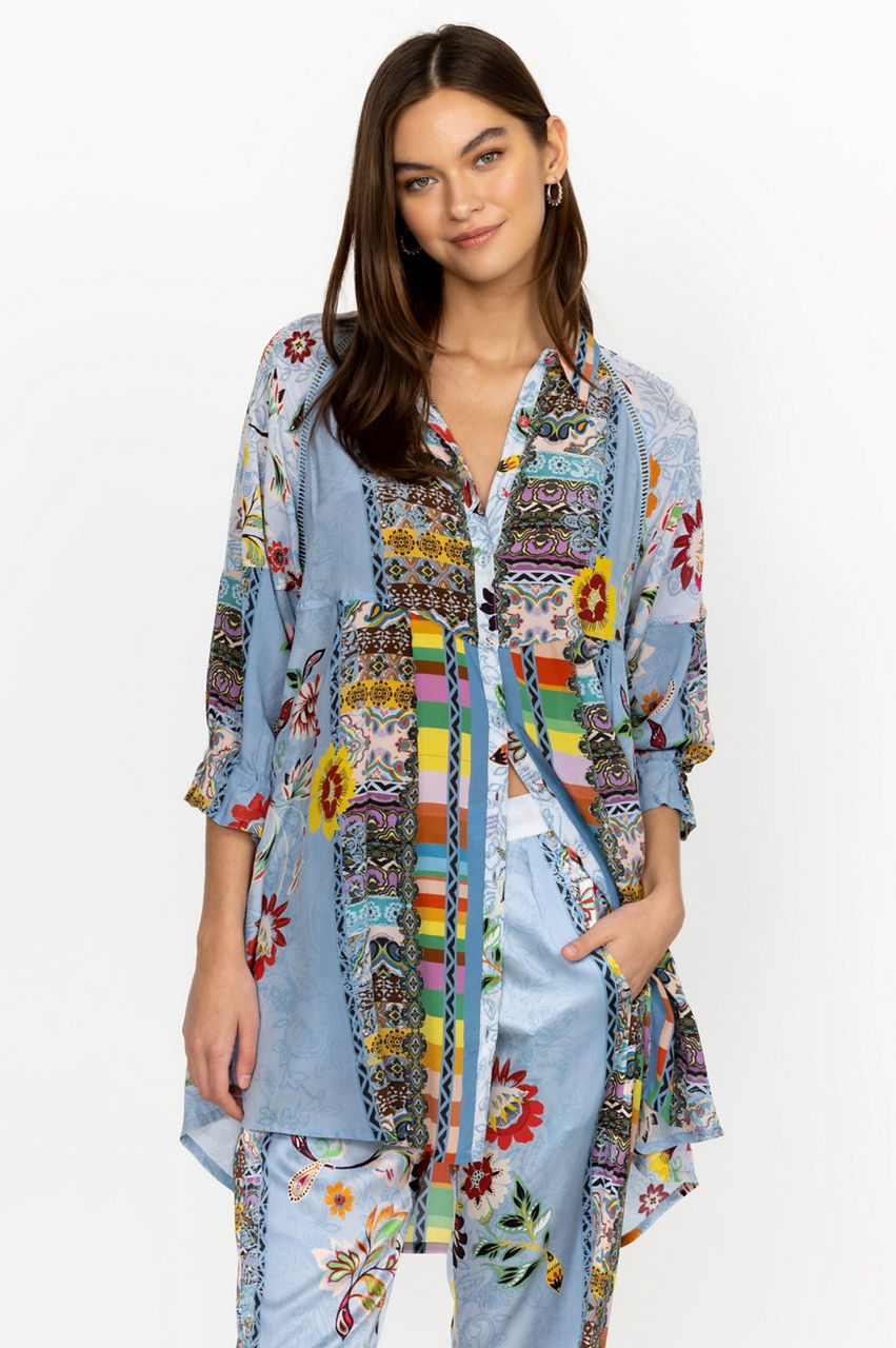 The epitome of sophisticated femininity, the Rainbow Adonia Tunic is a statement-making take on a classic silhouette. This tunic is spun from liquid-like silk and features a collar, a front button closure, long sleeves, a paneled construction, and a symphony of elegant flowers. Wear this tunic with the matching drawstring pants for a head-turning look.