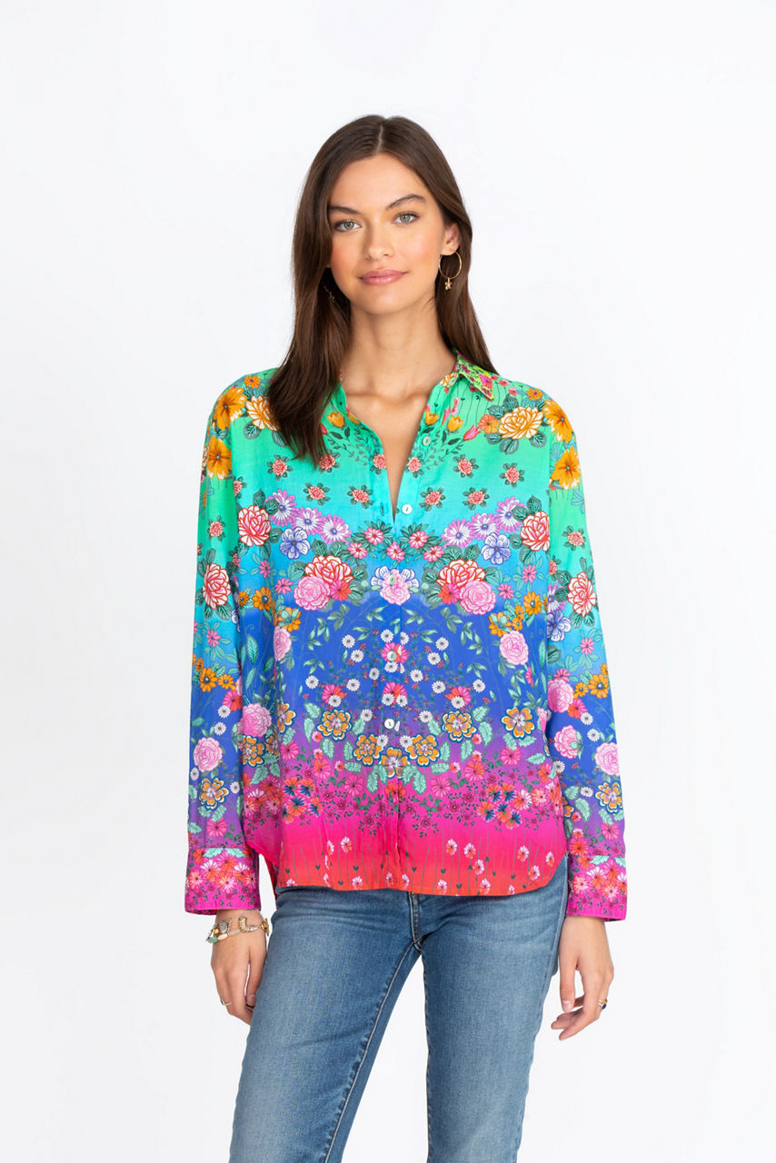 Our Rainbow Field Fitted Shirt combines immaculate construction, specialty fabrics, and a stunning colorway to offer a timeless top that you ll reach for again and again this season. This beautiful top pairs wonderfully with your favorite embroidered leggings or cropped trousers. Pull off a charming Bohemian ensemble by adding strapped sandals, layered jewelry, and a fedora.