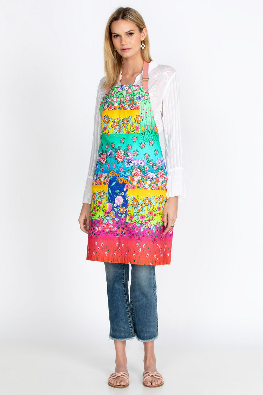 Add fashionable flair and style to your household endeavors with our Rainbow Fields Apron. With its beautiful printed cotton and layered construction featuring vibrant shades of color, it s the perfect gift for the chef in your family. The twill neck and waist strap tie easily from the front or back to create a vibrant addition to your kitchen or garden.