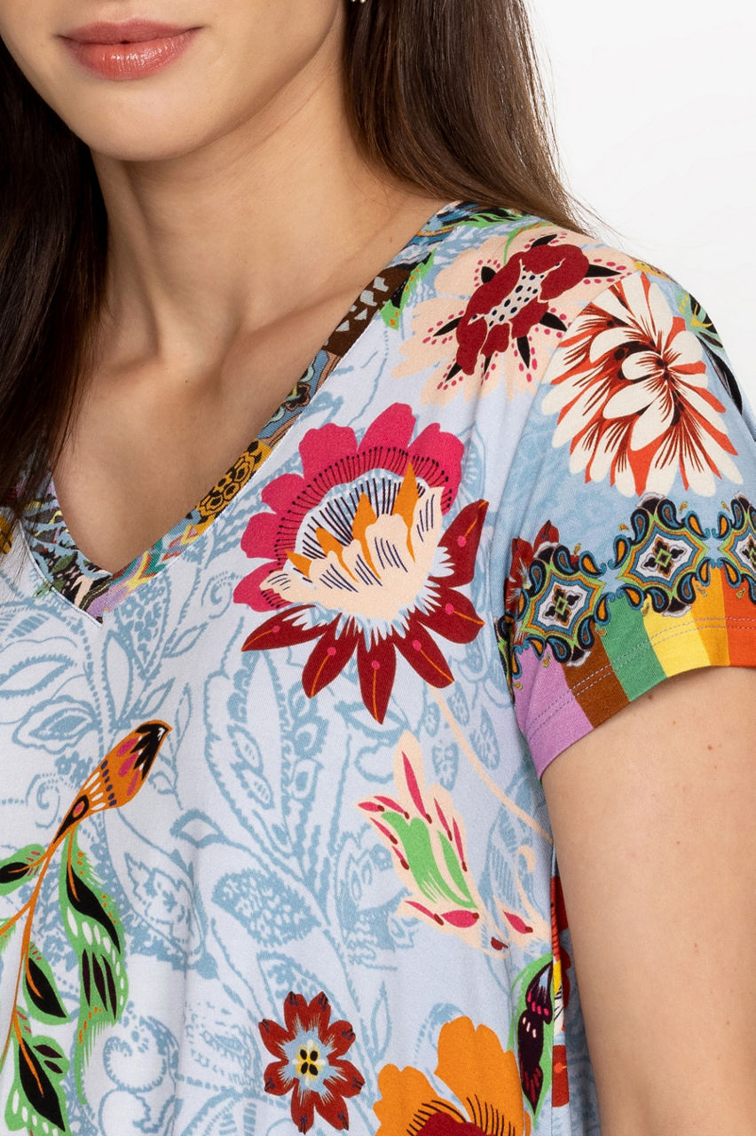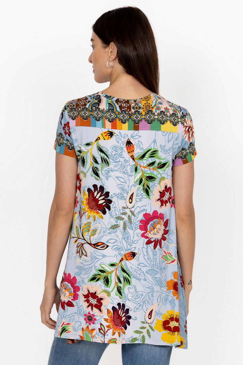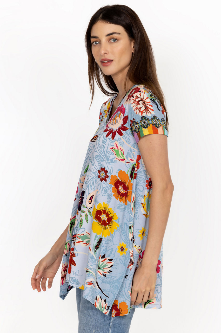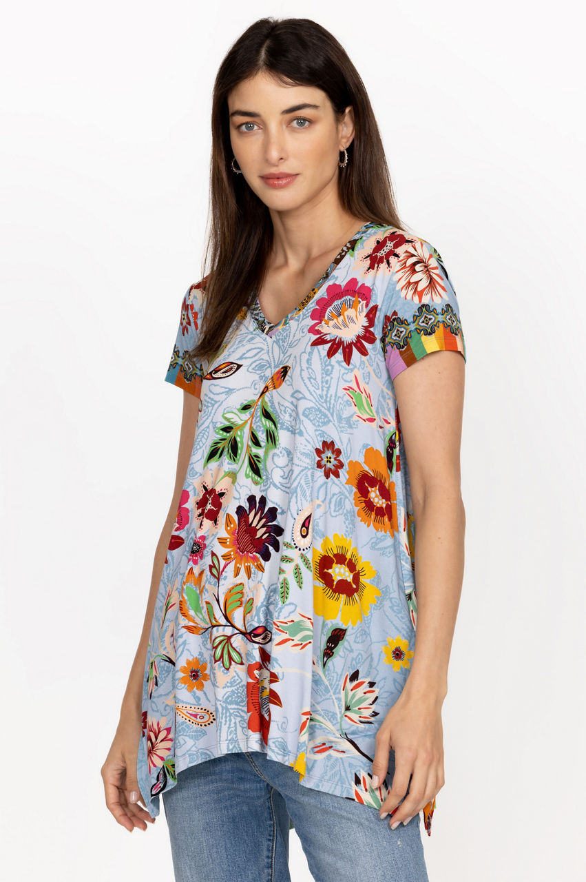 The Rainbow Floral Drape Tunic seamlessly merges antique motifs with practical design details. Cut in a slightly relaxed fit, this draped tunic is a versatile choice for warm days and features a V-neck, short sleeves, a high-low hem, and a vibrant bouquet of flowers. Layer over jeans for an upbeat wear-anywhere ensemble.
