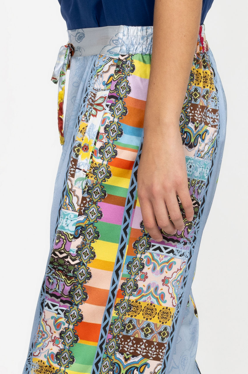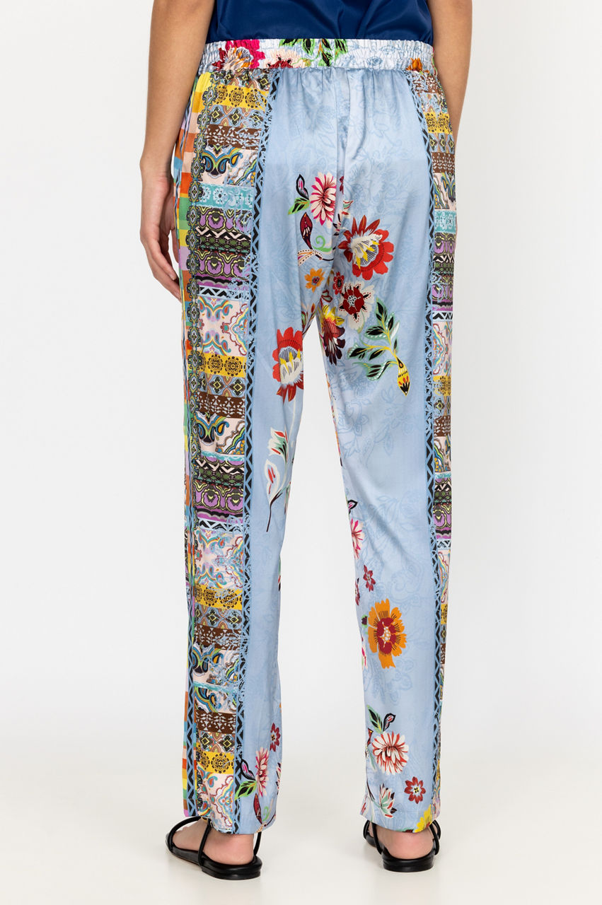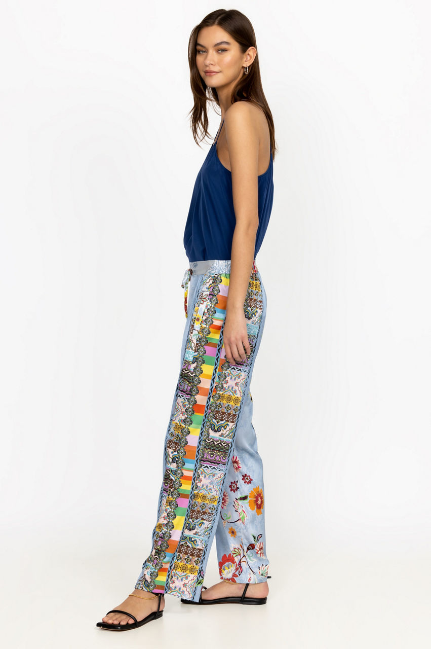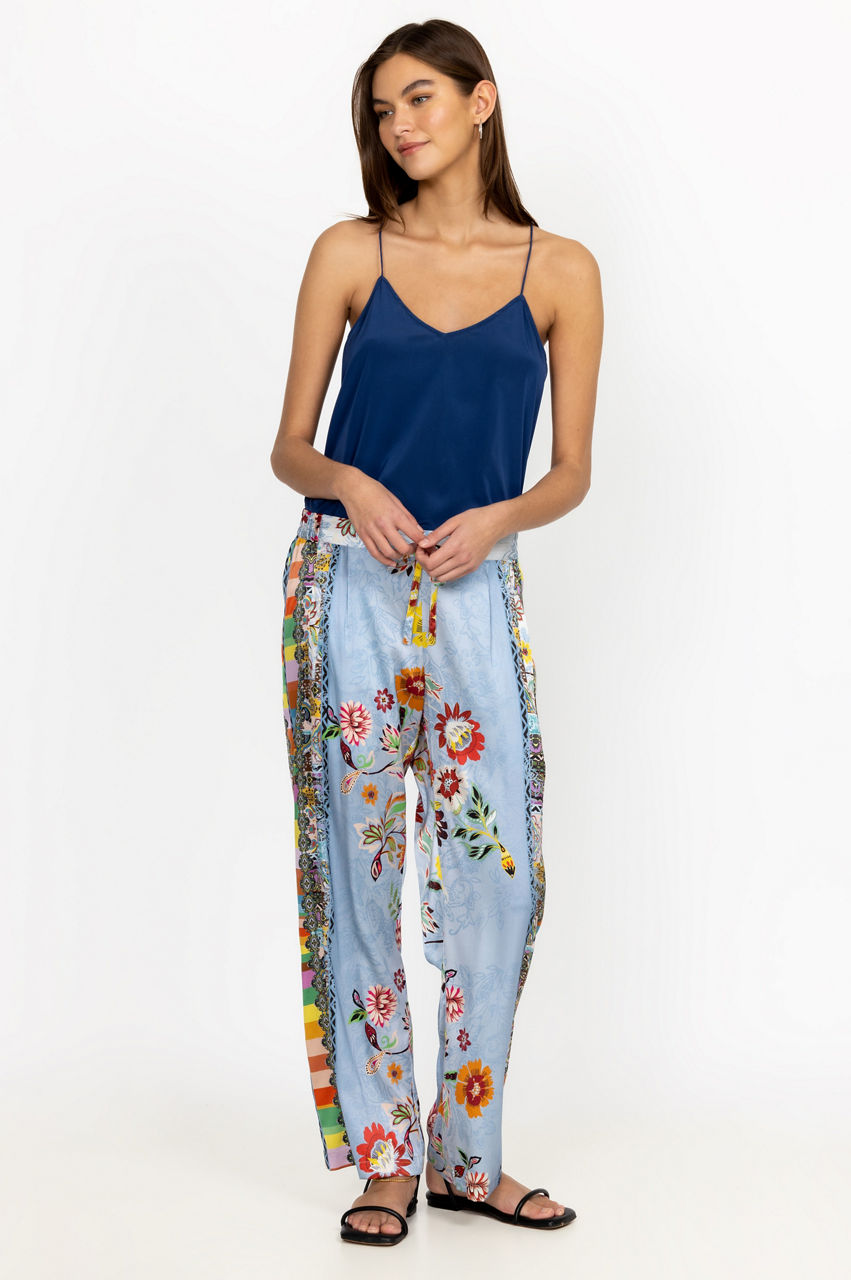 Igniting a feeling of optimism, the Rainbow Liza Pants add a joyful twist to a versatile silhouette. These pants are designed from a smooth silk blend and feature an elastic drawstring waist, vibrant florals, and a straight leg with colorful patterned sides. Style with a matching printed tunic for an eclectic look.