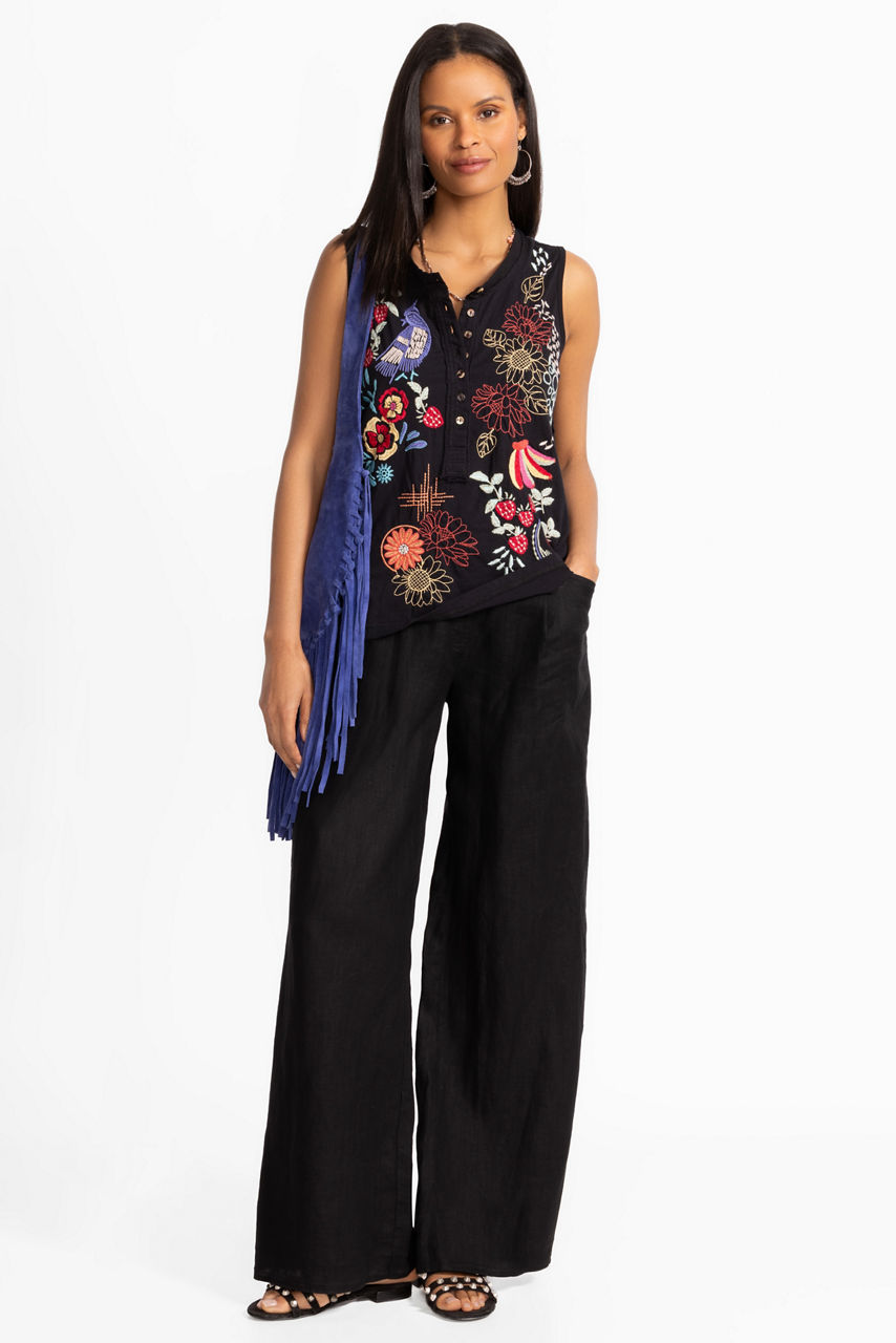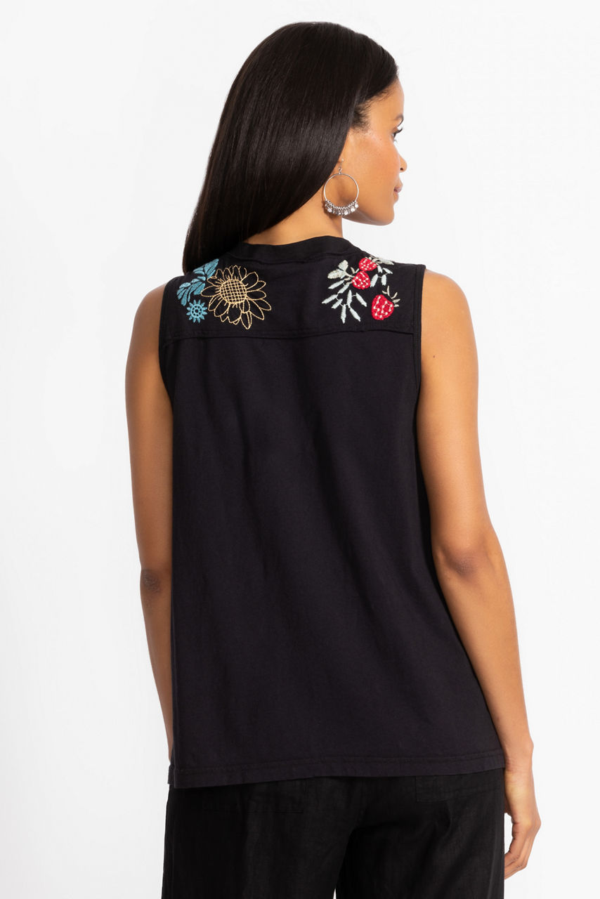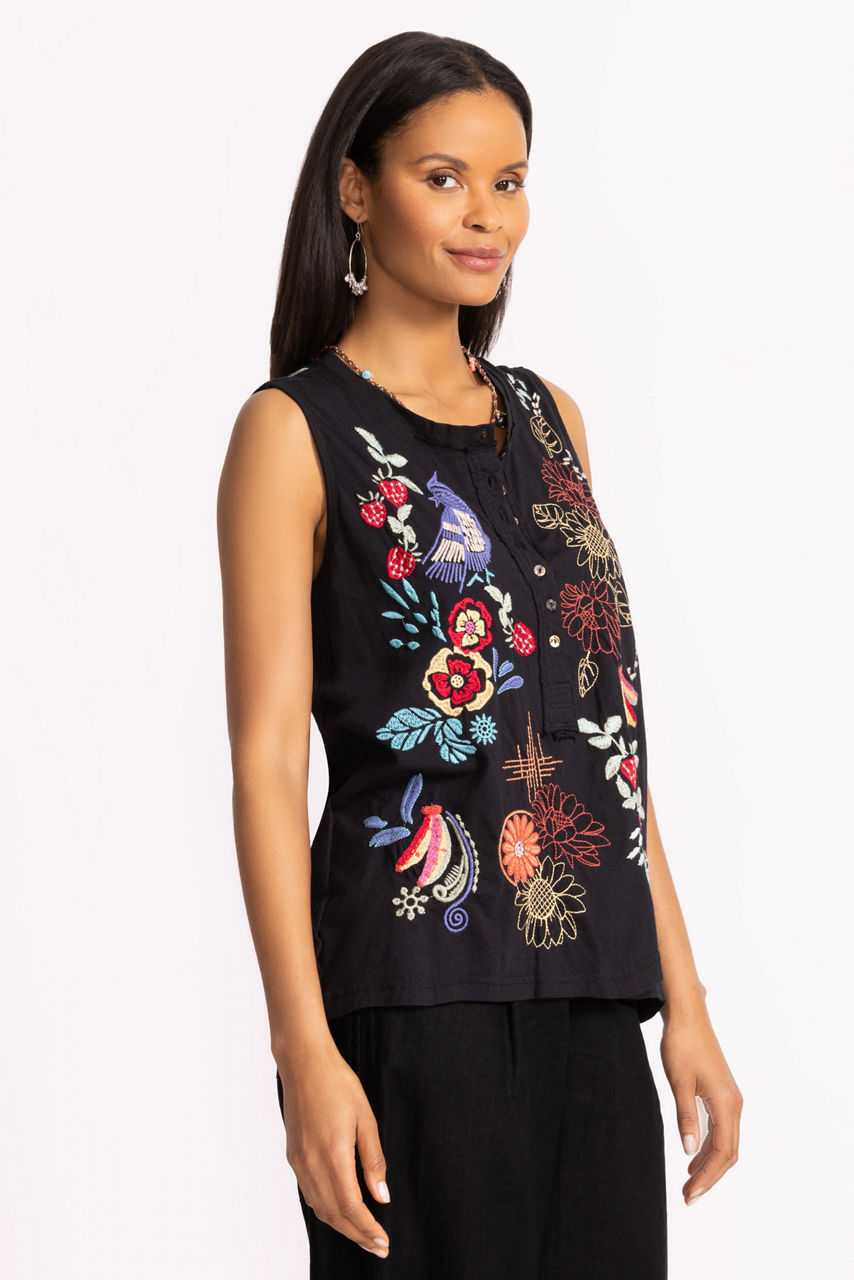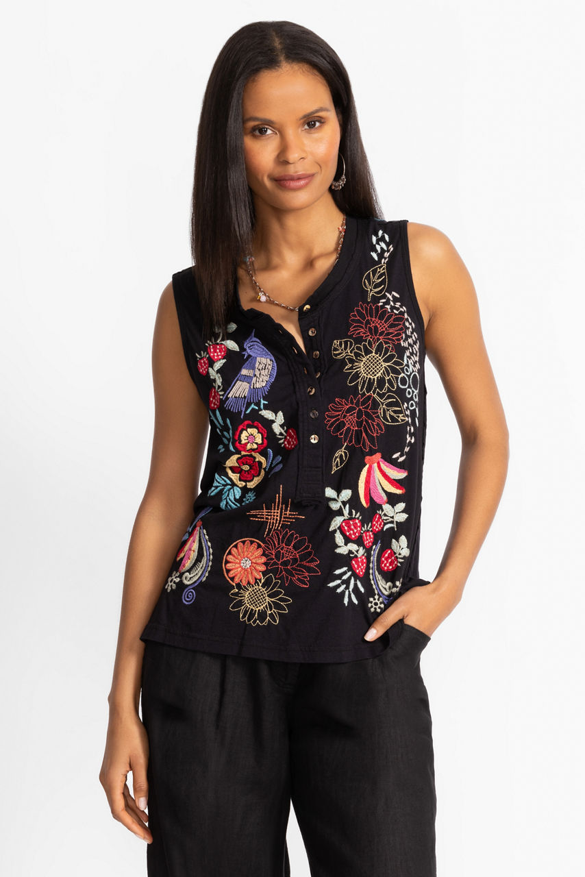 Crafted from 100% breathable cotton, the Cora Raw Detail Henley Tank is embellished with vibrant floral embroidered detailing at the front and back. Featuring a rounded Henley neckline this sleeveless swing tank is finished with a relaxed-fit bodice. Pair with a bold linen skirt and fashion sneakers for a colorful casual ensemble.