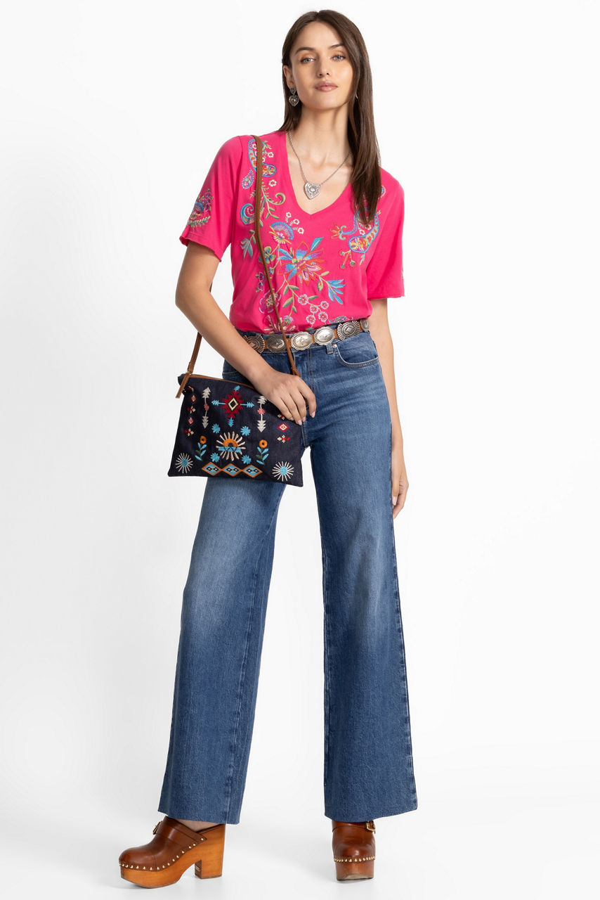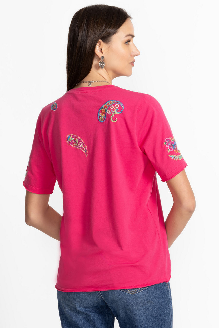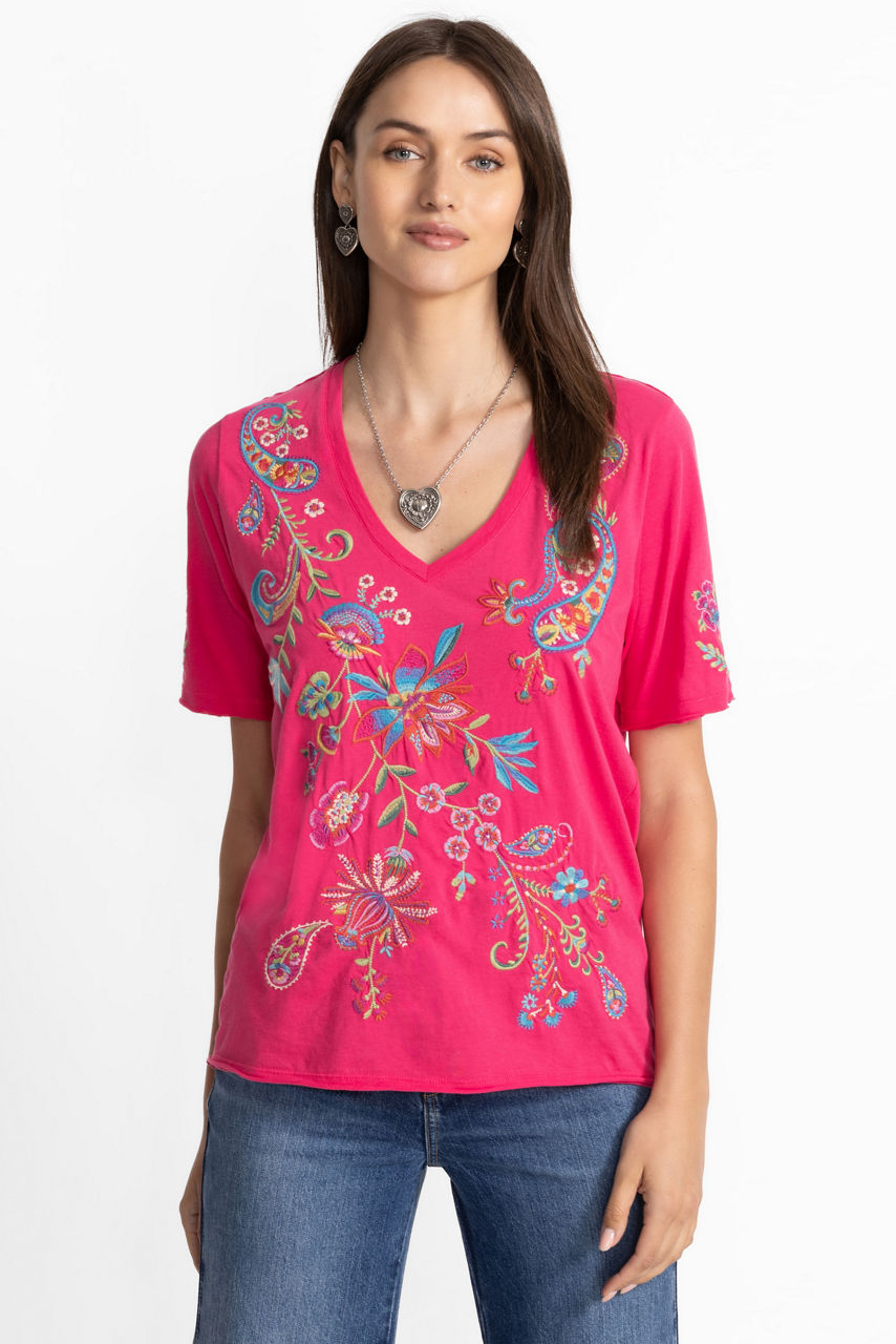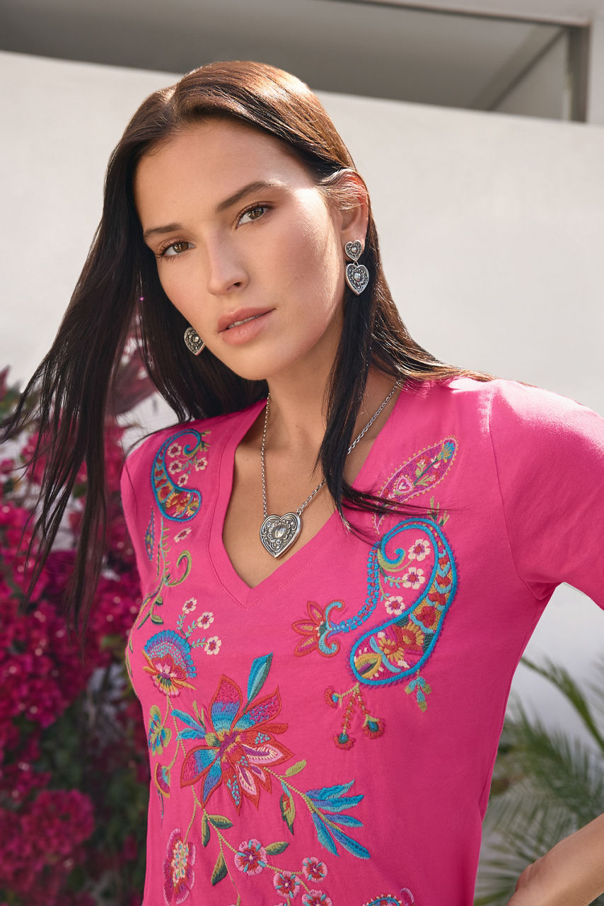 Crafted from 100% rich cotton, the Raw Hem V-Neck Tee is embellished with vibrant embroidered detailing the front of the bodice. Designed with a V-neckline and short sleeves, this tee is finished with raw edges at the sleeves and hemline. Pair with linen shorts and casual sandals for a vacation-ready ensemble.