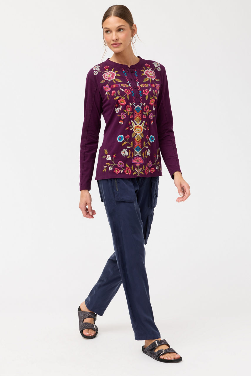 Crafted from rich 100% cotton, the Anaya Raw Seam Henley is embellished with intricate floral embroidered detailing in vibrant color. Designed with a Henley neckline and a partial button-down closure, this long-sleeve tee is finished with a raw seam detail at the edges. Pair with relaxed-fit jeans and fashion sneakers for a casual weekend look.