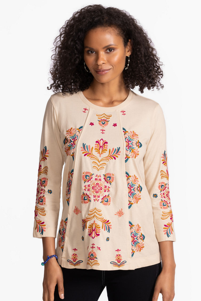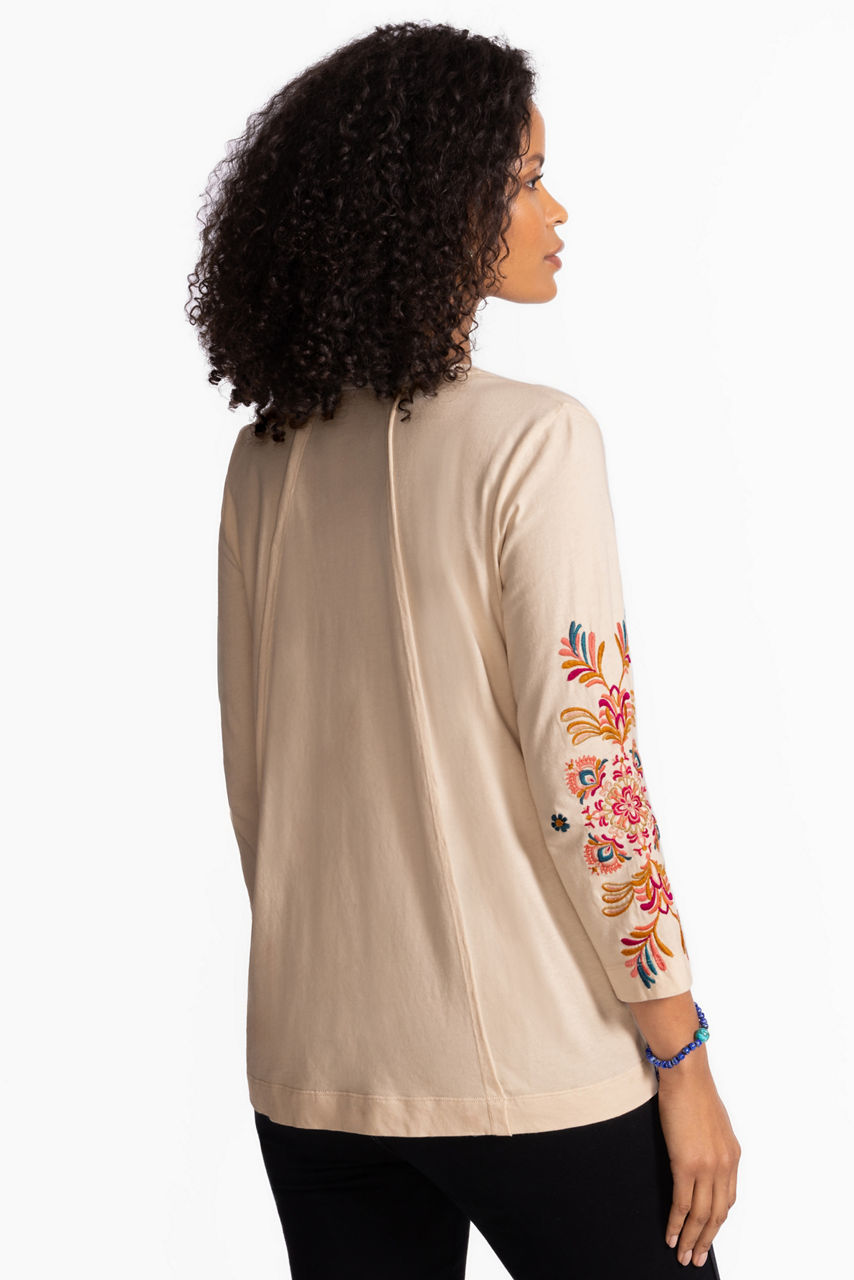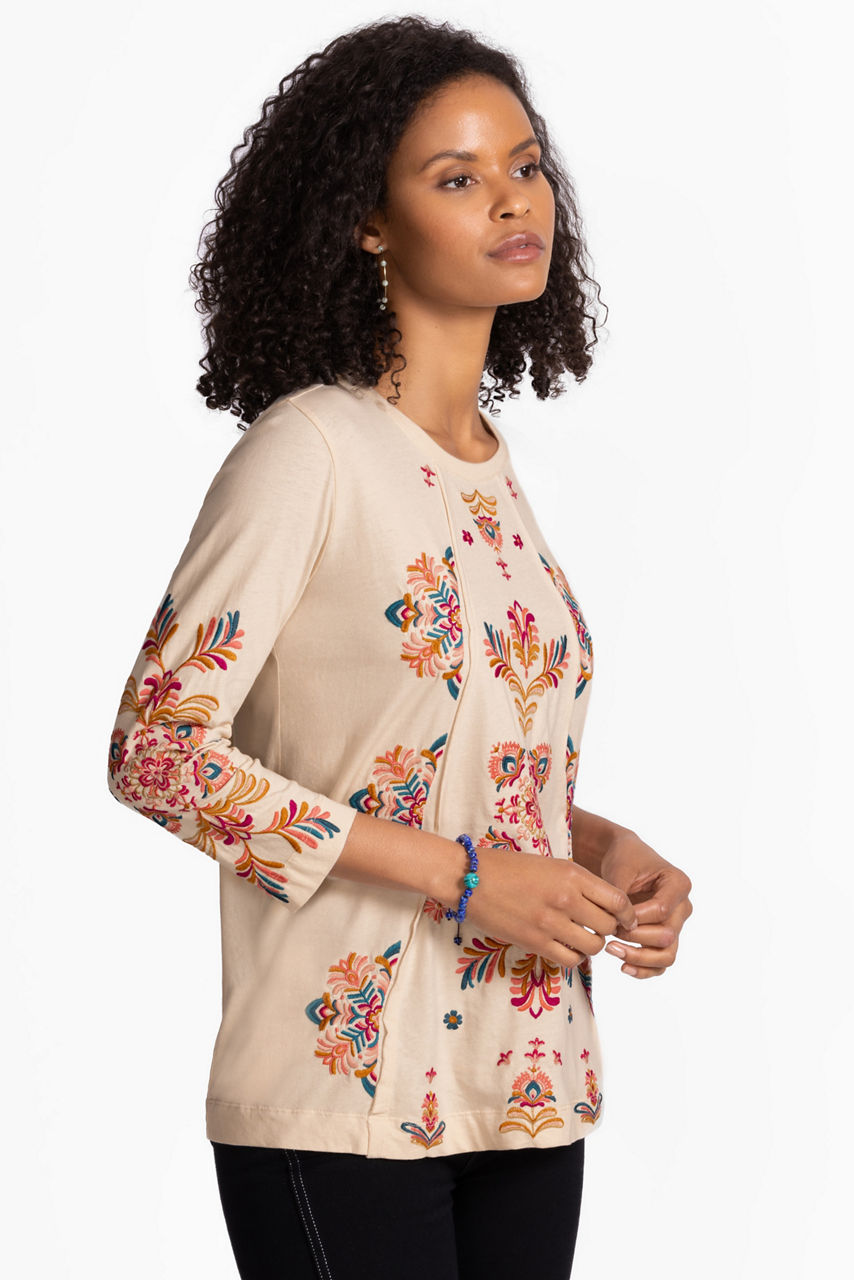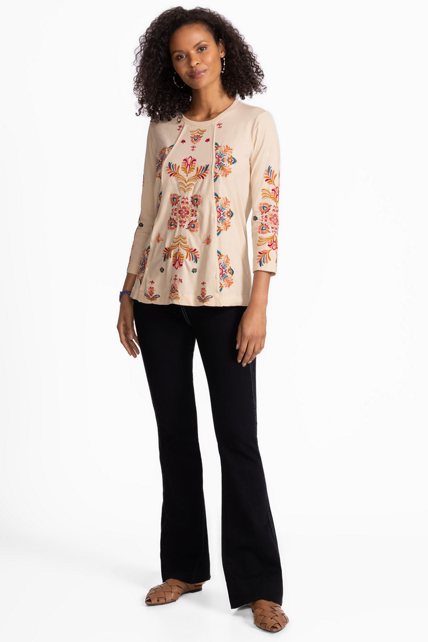 Crafted from breathable 100% cotton, the Brandi Raw Seam Swing T-Shirt is adorned with vibrant floral embroidered detailing. Featuring a crew neckline and flowing 3/4 sleeves, this relaxed-fit top is finished with a swing silhouette. Pair with fitted pants and bold jewelry accents for dinner out with friends or family.