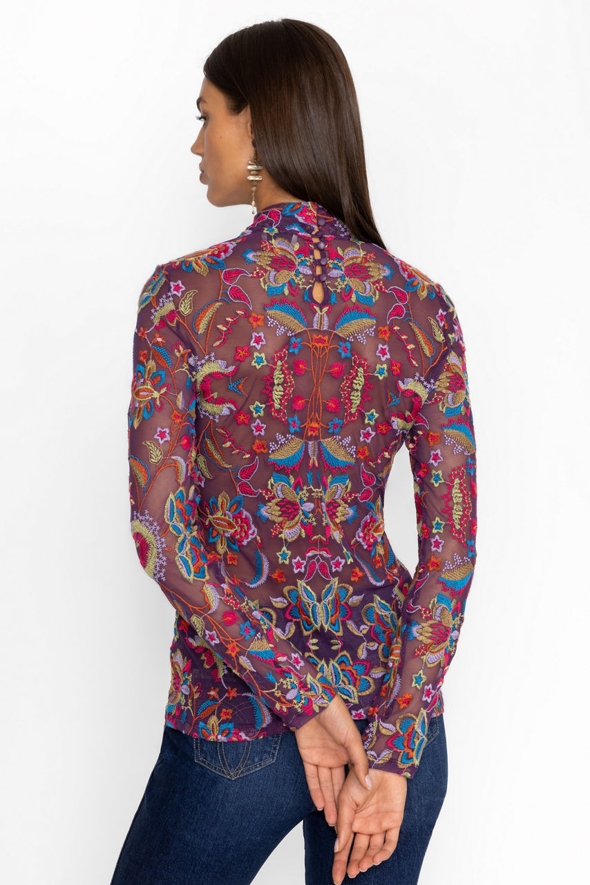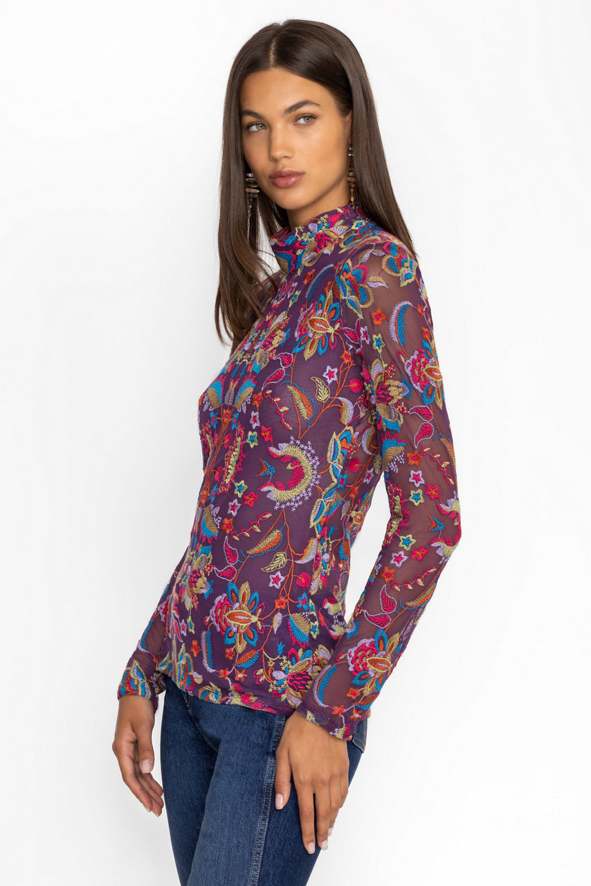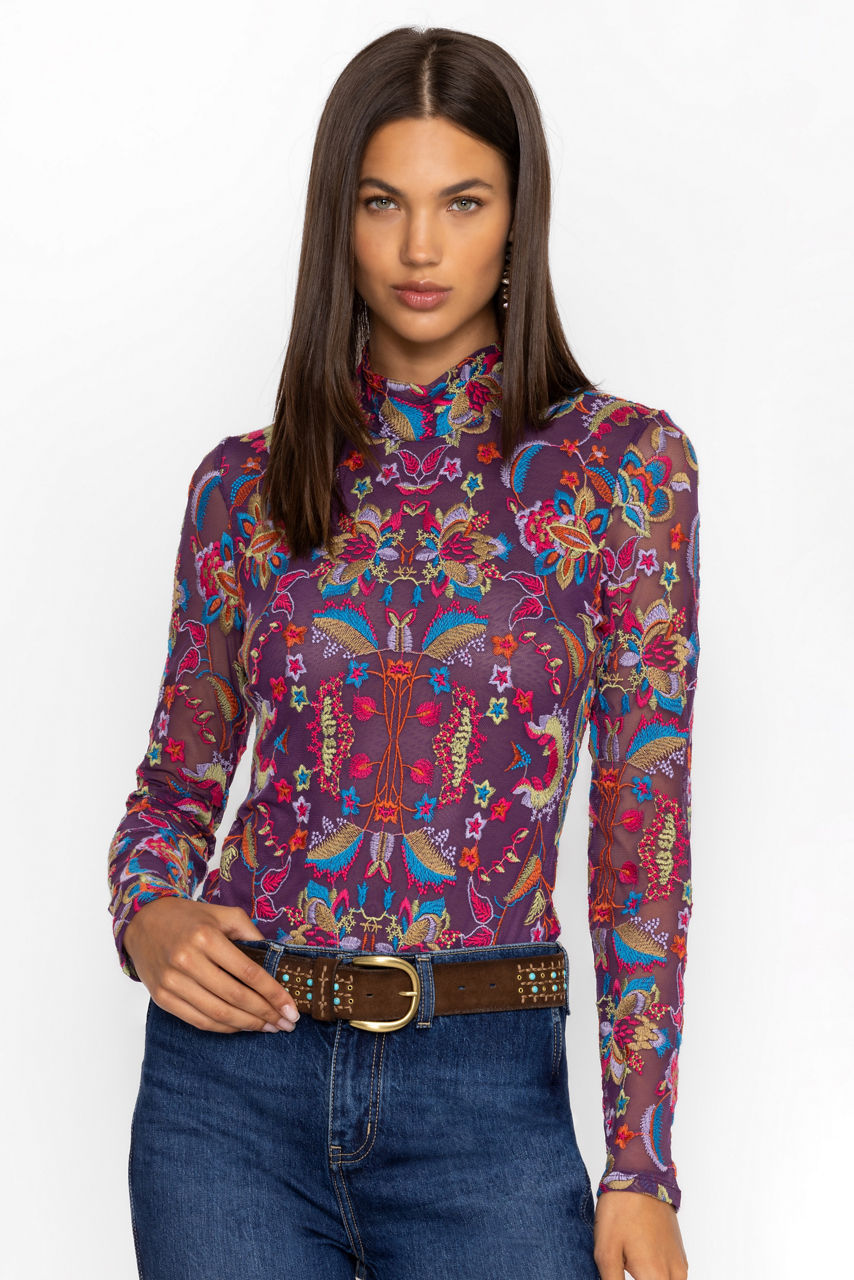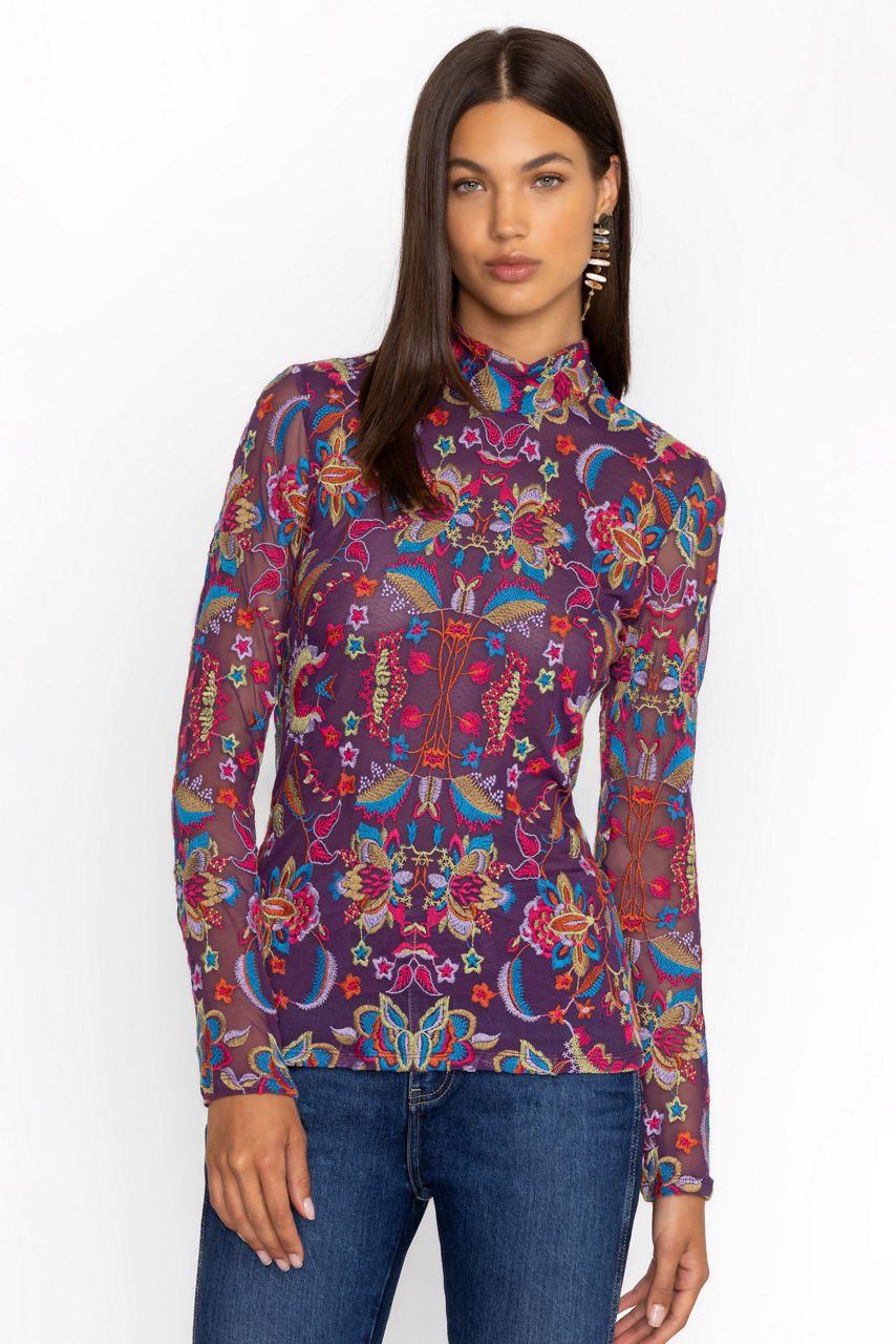 Beautifully adorned with a bold vibrant print, the Rebecca Mesh Mock Neck Long Sleeve Tee is crafted from a lightweight mesh fabric with a hint of stretch. Featuring a mock neckline and long sleeves, this mesh top is embellished with intricate placement embroidery for added texture. Pair with a pencil skirt and coordinating blazer for a fresh work look.